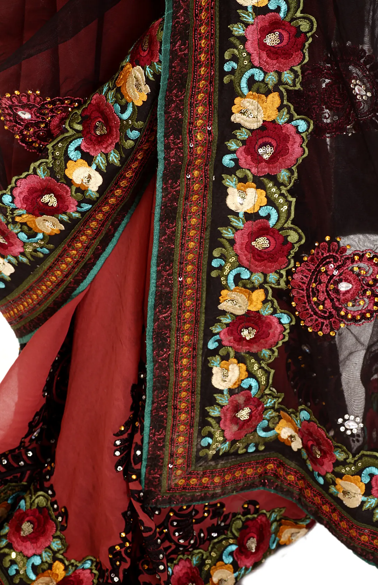 Black and Cordovan Designer Sari with Parsi Embroidered Flowers and Sequins