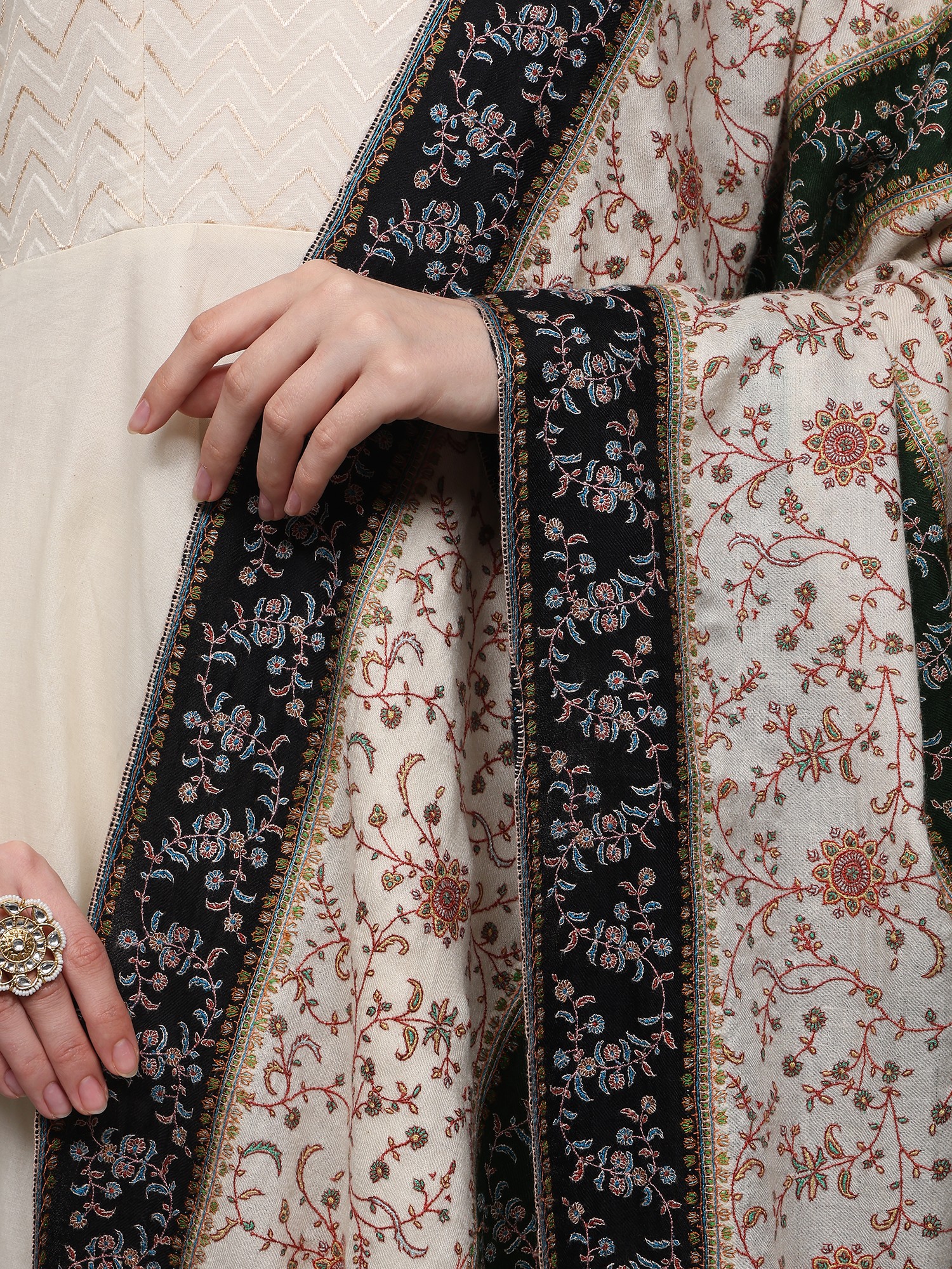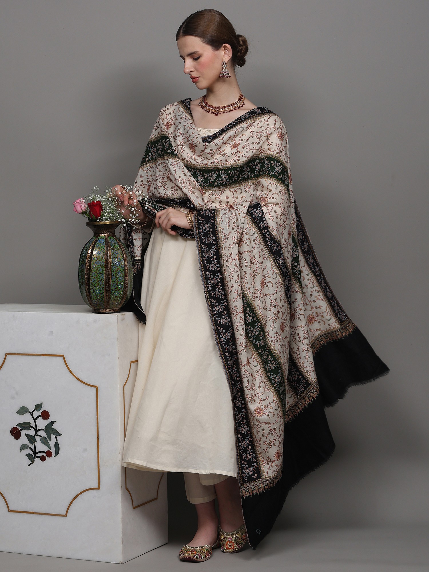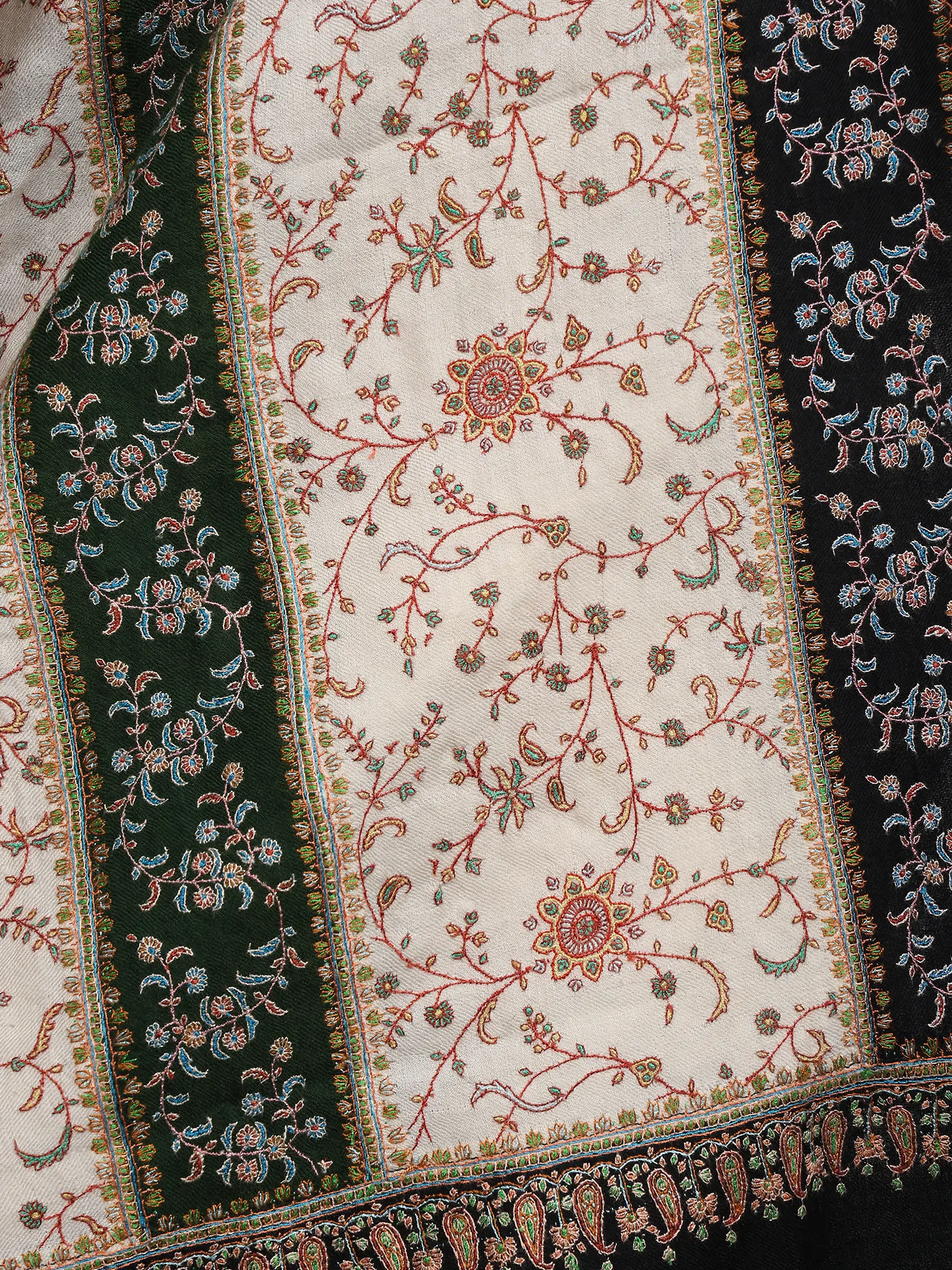 Adorned with intricate Multi-colored Detailed “Kalamkari Embroidery” (Traditional Indian art form, originated in Andhra Pradesh), this Pashmina Shawl is a tapestry of elegance and craftsmanship. Crafted from the finest Cashmere, it envelops you in unparalleled softness and warmth. Each thread whispers tales of artistic mastery, as the Kalamkari motifs dance in a symphony of vibrant hues. It is not just a shawl; it is a masterpiece, a canvas of culture, and a tribute to the enchanting beauty. Draped around your shoulders, it becomes a portal to a world where tradition meets modernity, where warmth meets style.