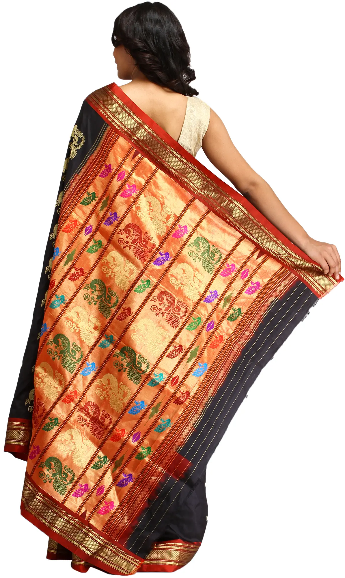 Paithani Silk Saree with Hand-Woven Peacocks on Border and Aanchal