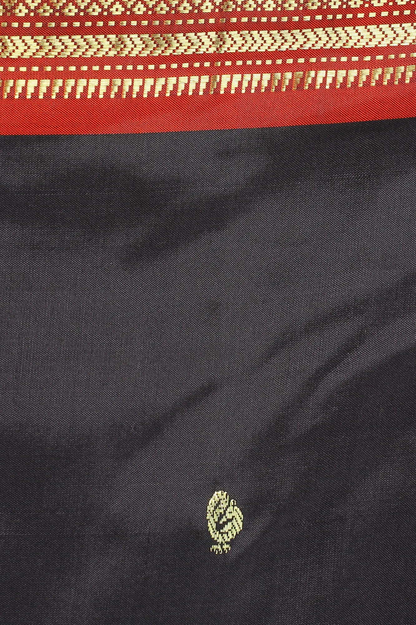 The aanchal, or pallu, is a breathtaking display of brocaded artistry. This richly patterned section showcases a dazzling interplay of colors and textures, where the golden peacocks are complemented by vibrant accents of pink, green, and orange. The meticulous brocading technique imbues the fabric with depth and dimension, making each motif stand out with unparalleled brilliance. This celebratory design transforms the pallu into a vibrant tapestry, designed to catch the light and draw admiring glances. The combination of the deep black silk and the richly adorned aanchal creates a striking contrast, ensuring this sari makes a memorable statement at any occasion.