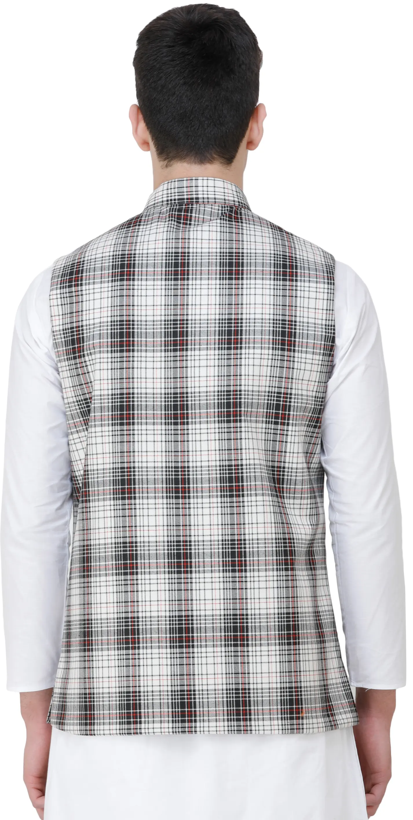 Upgrade your style quotient with the Black and White Waistcoat featuring a classic woven check pattern and convenient front pockets. This waistcoat adds a touch of sophistication to your ensemble, making it perfect for various occasions. The timeless combination of black and white ensures versatility and easy pairing with different shirts and trousers. The intricate check weave provides a refined texture, while the front pockets offer practicality. Step out in style, showcasing your sartorial flair with this elegant and well-crafted black and white waistcoat.