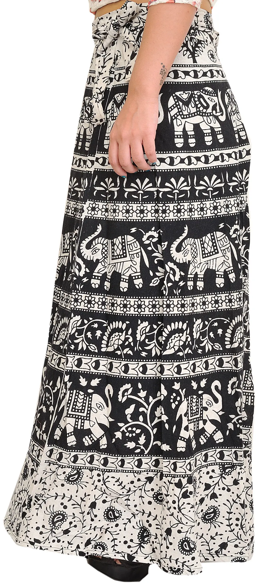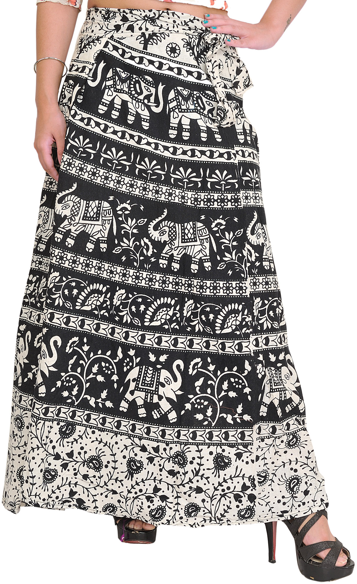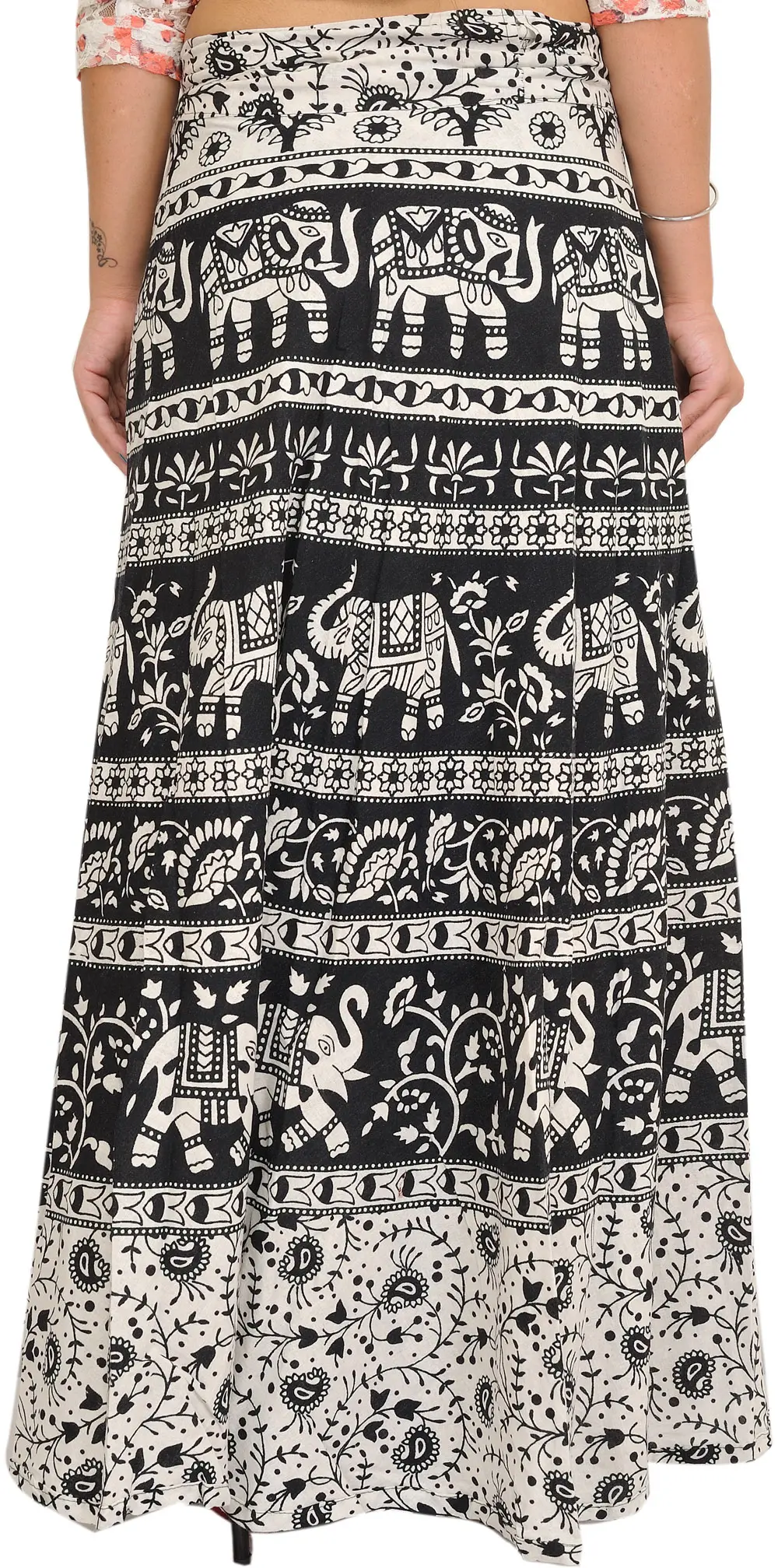 This beautiful skirt appears in the centre of “Pilkhuwa,” where artists weave dreams into cloth. This skirt, made from fine cotton, represents heritage and grandeur. Each stroke, embellished with elephant prints, reveals a narrative of magnificent beauty and cultural legacy. This skirt is a symphony of monochromatic harmony. Its wrap-around style is versatile, dressing the wearer in sophistication for every occasion. Beyond its function, it signifies a connection to nature and the wonderful craftsmanship of Pilkhuwa.