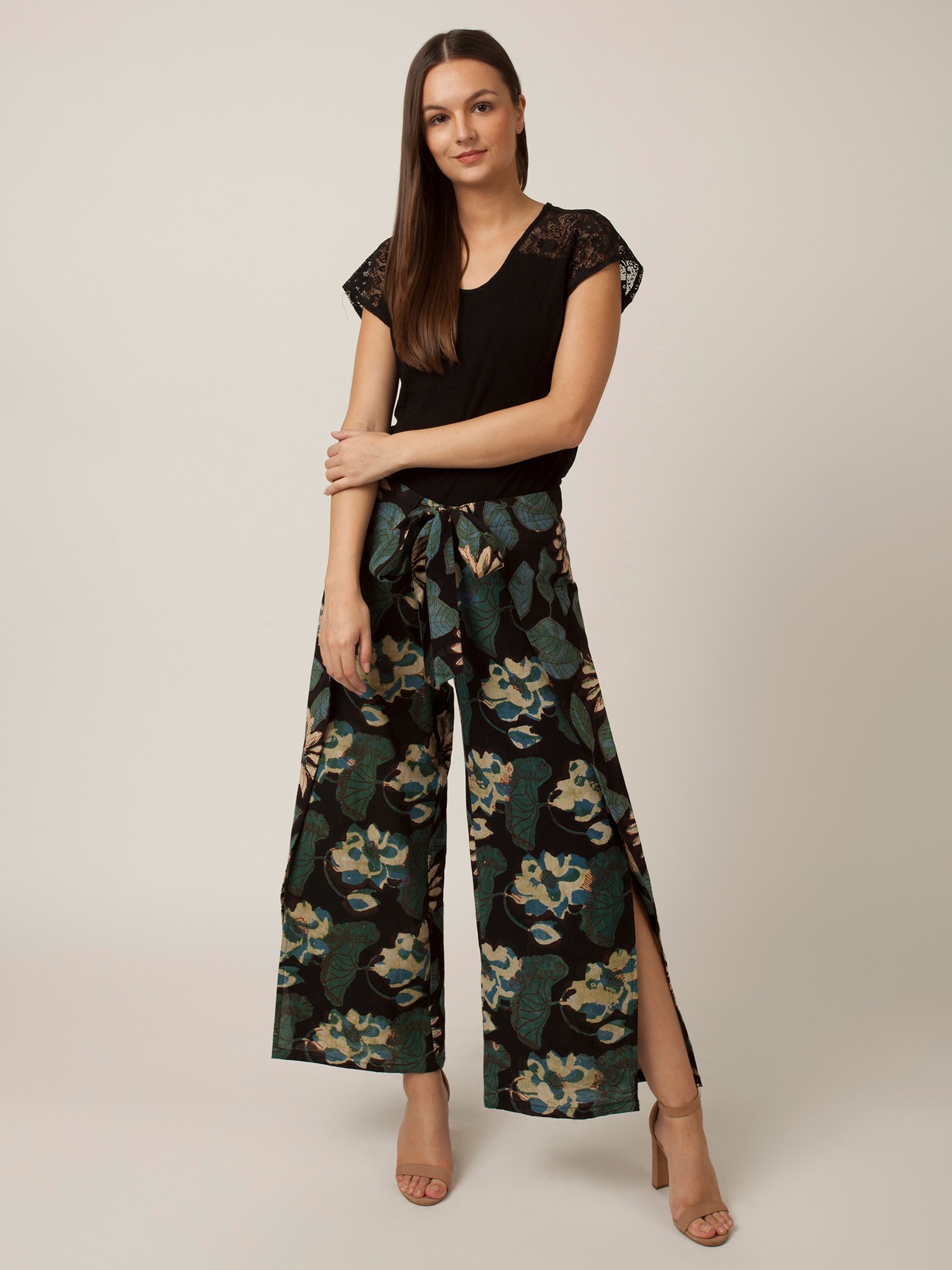 This Black Cotton Floral Printed Wrap Palazzo is an amalgamation of style, tradition, and creativity. It is highly fashionable with short side slits. The print of the cotton fabric is very attractive with a dark base and green floral prints. The print on the fabric is the Dabu print which has its roots in Rajasthan. It is a traditional vegetable dye printing. Effortlessly versatile, these palazzos elevate your style with comfort at its core and allow you to be comfortable while doing multiple tasks.