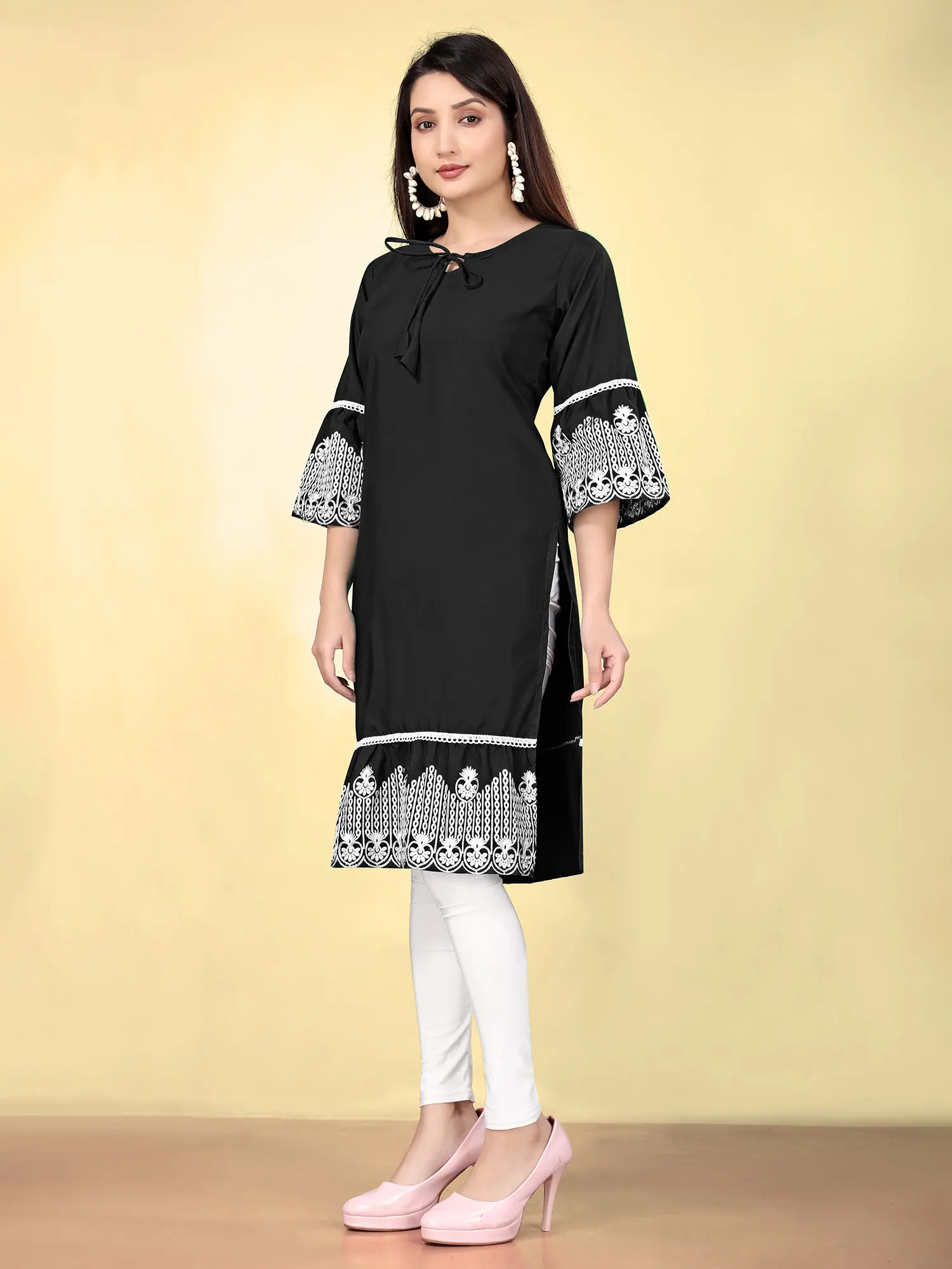 The kurti's versatile design allows for endless styling possibilities. Pair it with leggings or jeans for a casual and comfortable look, or dress it up with tailored trousers and heels for a more polished ensemble. The black color serves as a perfect canvas for accessorizing, allowing you to experiment with different colors and styles. Add a pop of color with a vibrant scarf or statement jewelry to create a personalized look that reflects your unique personality. The neckline with its tie detail provides a touch of individuality, allowing you to adjust the fit and style according to your preference.