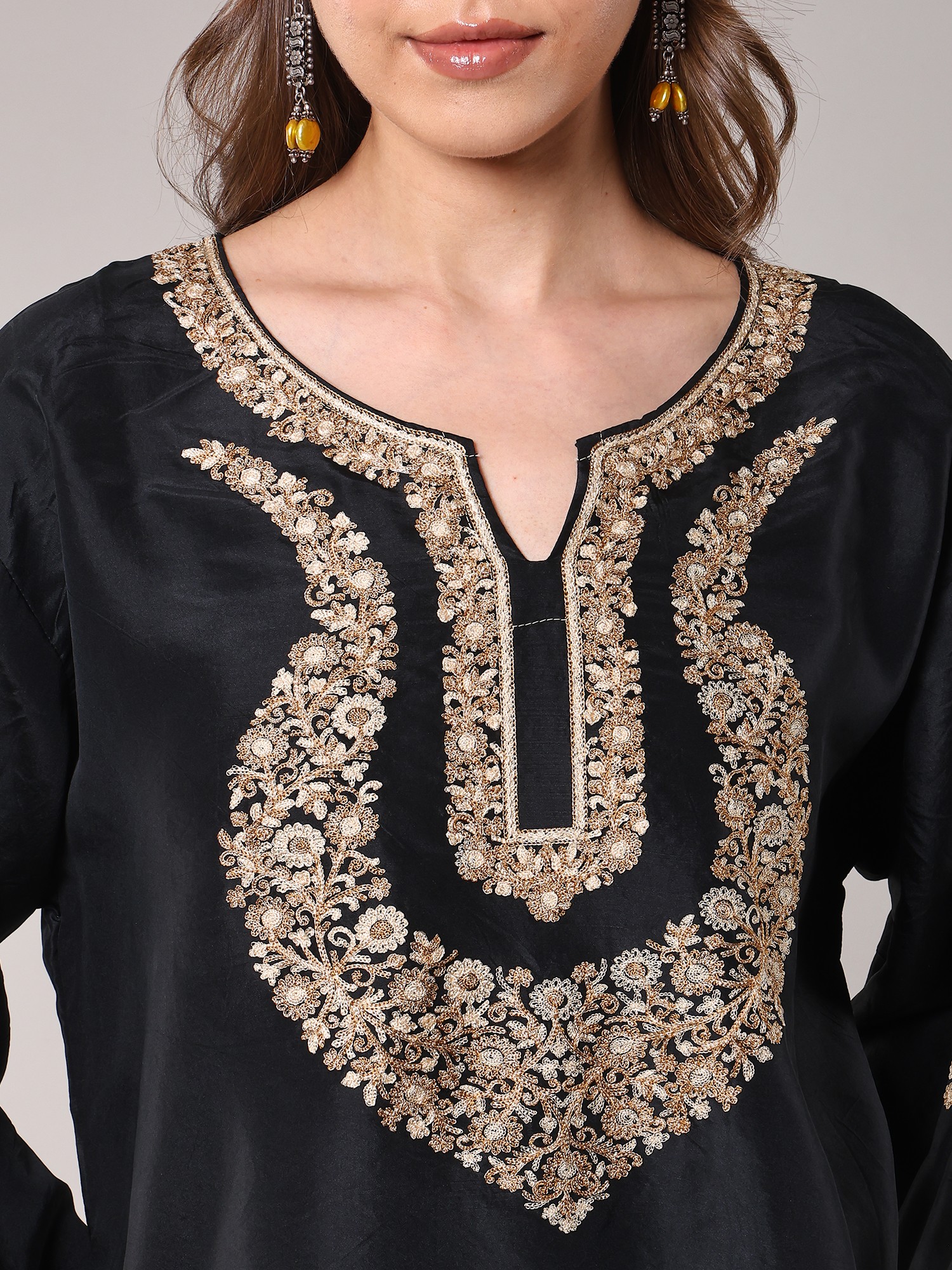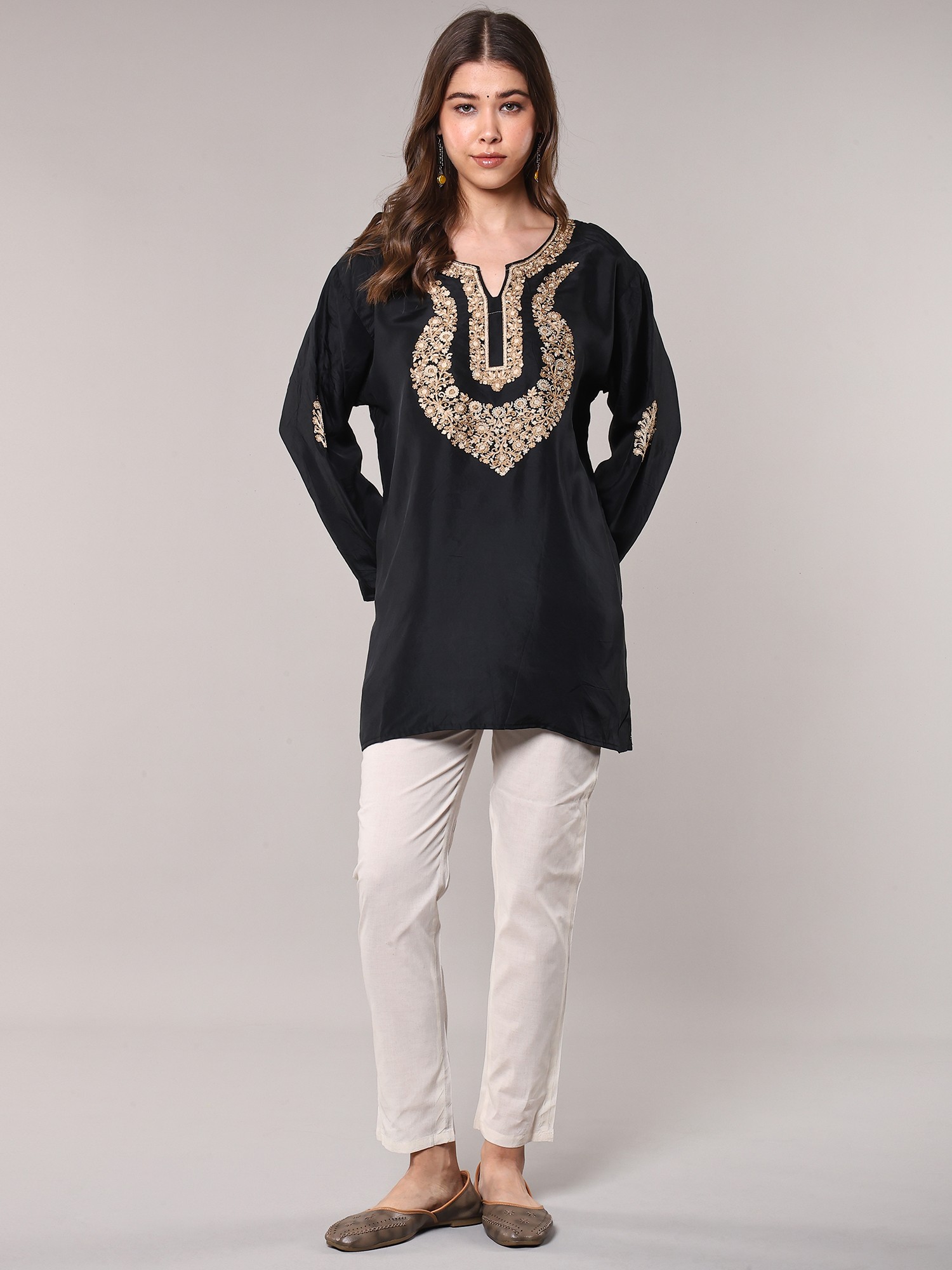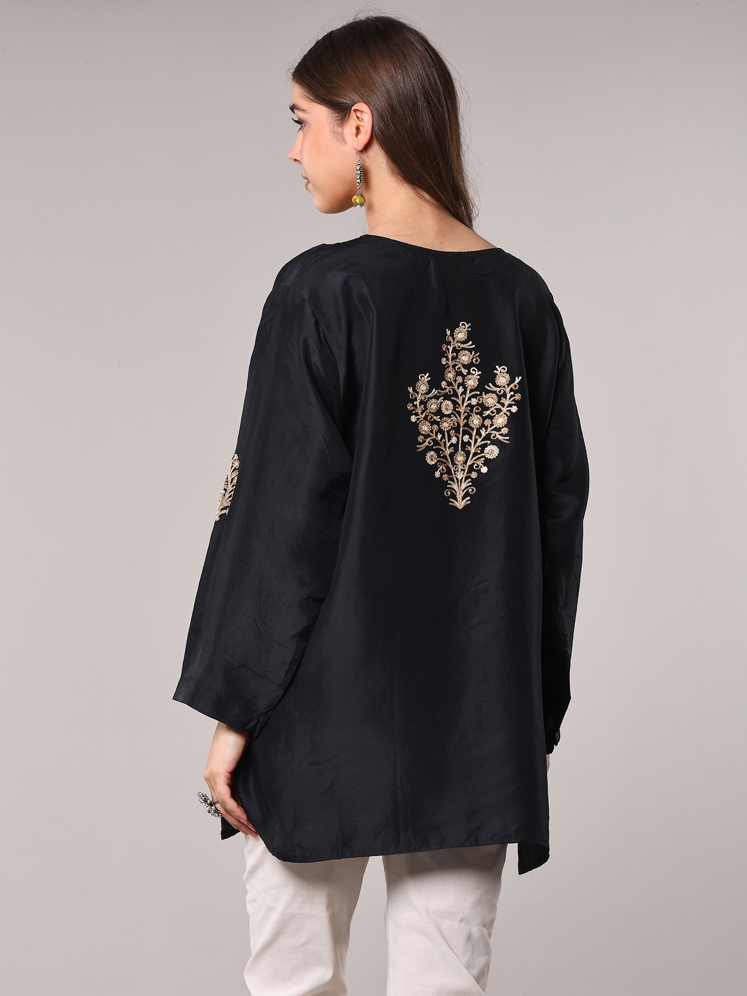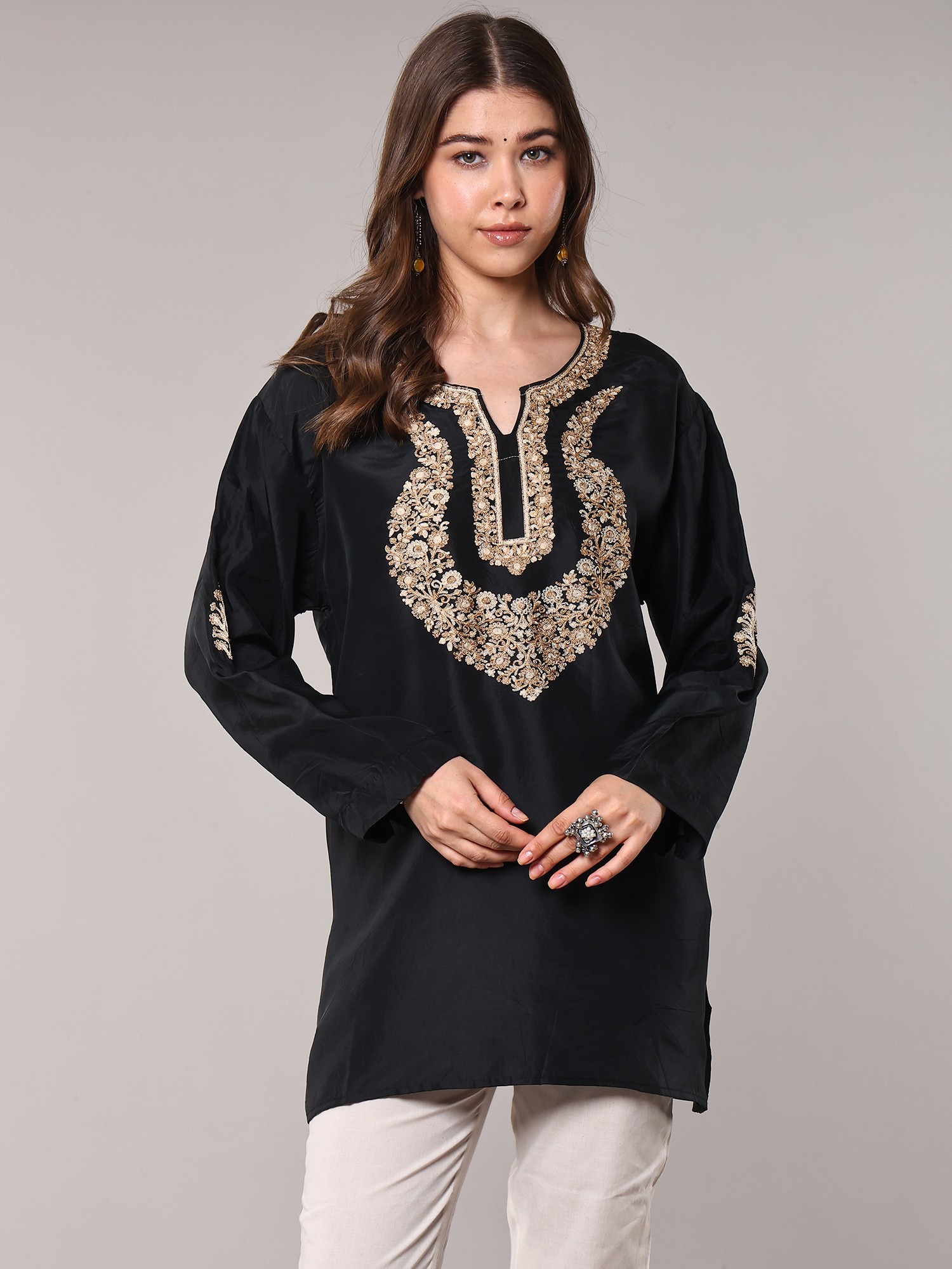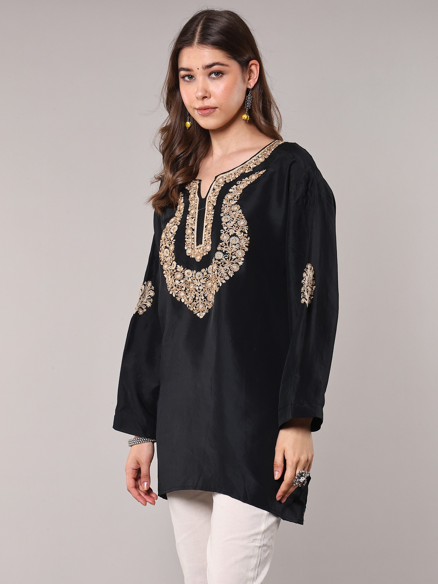 Discover a piece that embodies the rich heritage of Kashmiri artistry with this stunning short kurti. Crafted from pure silk, this garment offers a luxurious drape and a subtle sheen that speaks of understated elegance. The deep black hue serves as a perfect canvas, making the intricate embroidery pop with captivating detail.