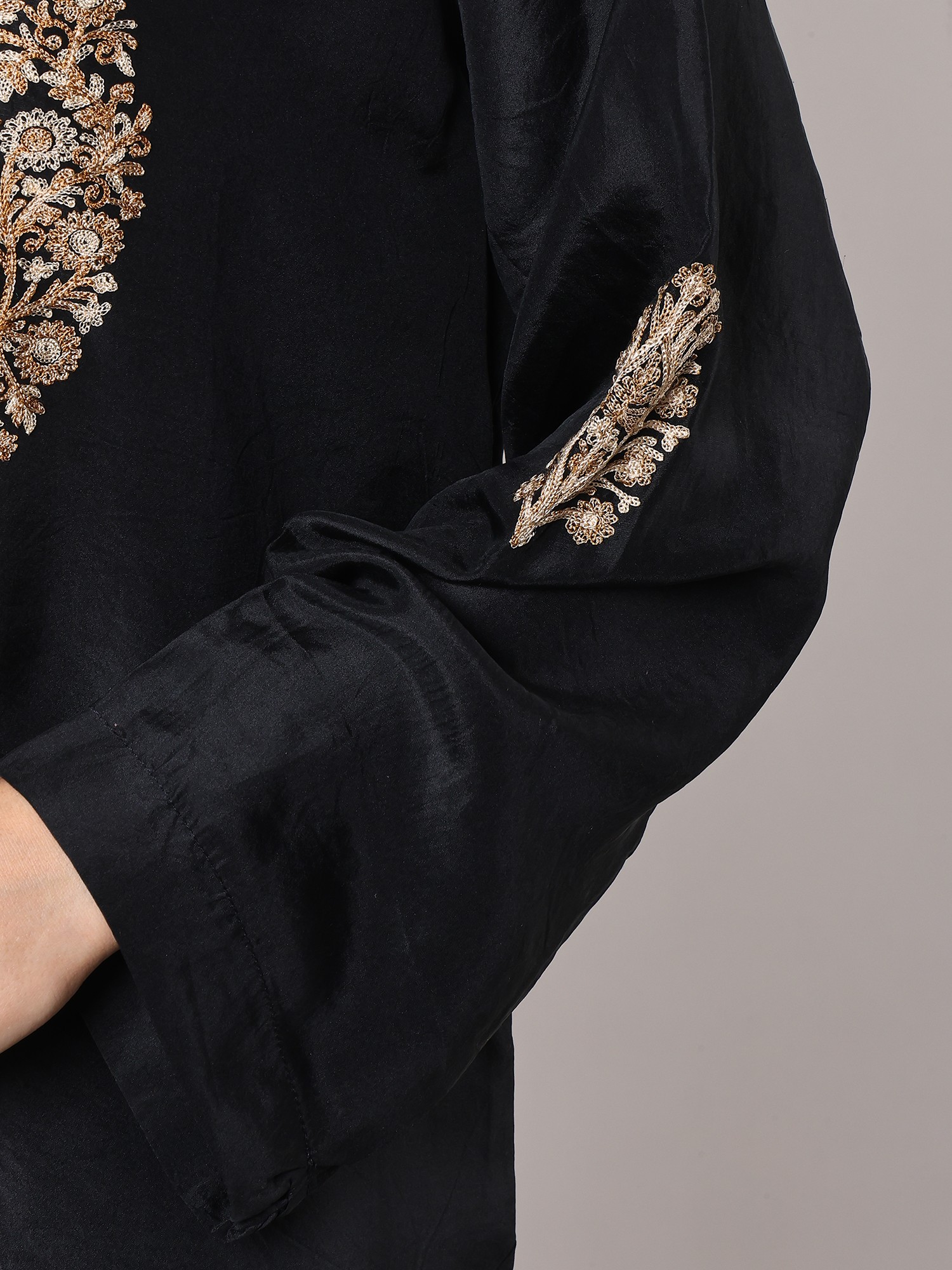 This Bristol-Black Kashmiri Short Kurti is more than just a garment; it's a wearable work of art. It celebrates traditional craftsmanship while offering a modern silhouette, making it a perfect addition for those who appreciate both heritage and contemporary style. Whether you're looking for a standout piece for a special event or a sophisticated addition to your everyday wear, this kurti promises to impress with its exquisite design and luxurious feel. Embrace the elegance and artistry of Kashmir with this exceptional silk creation.