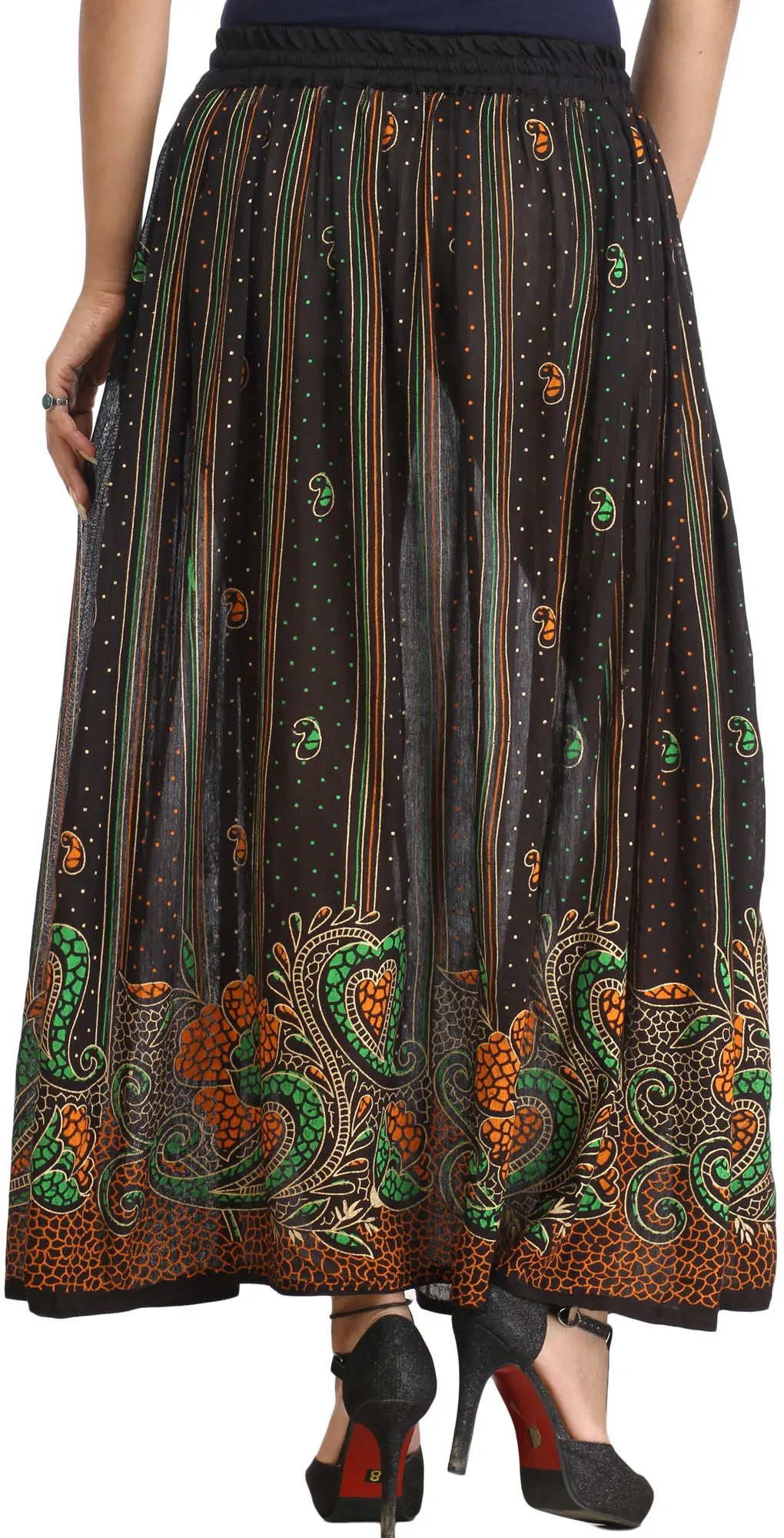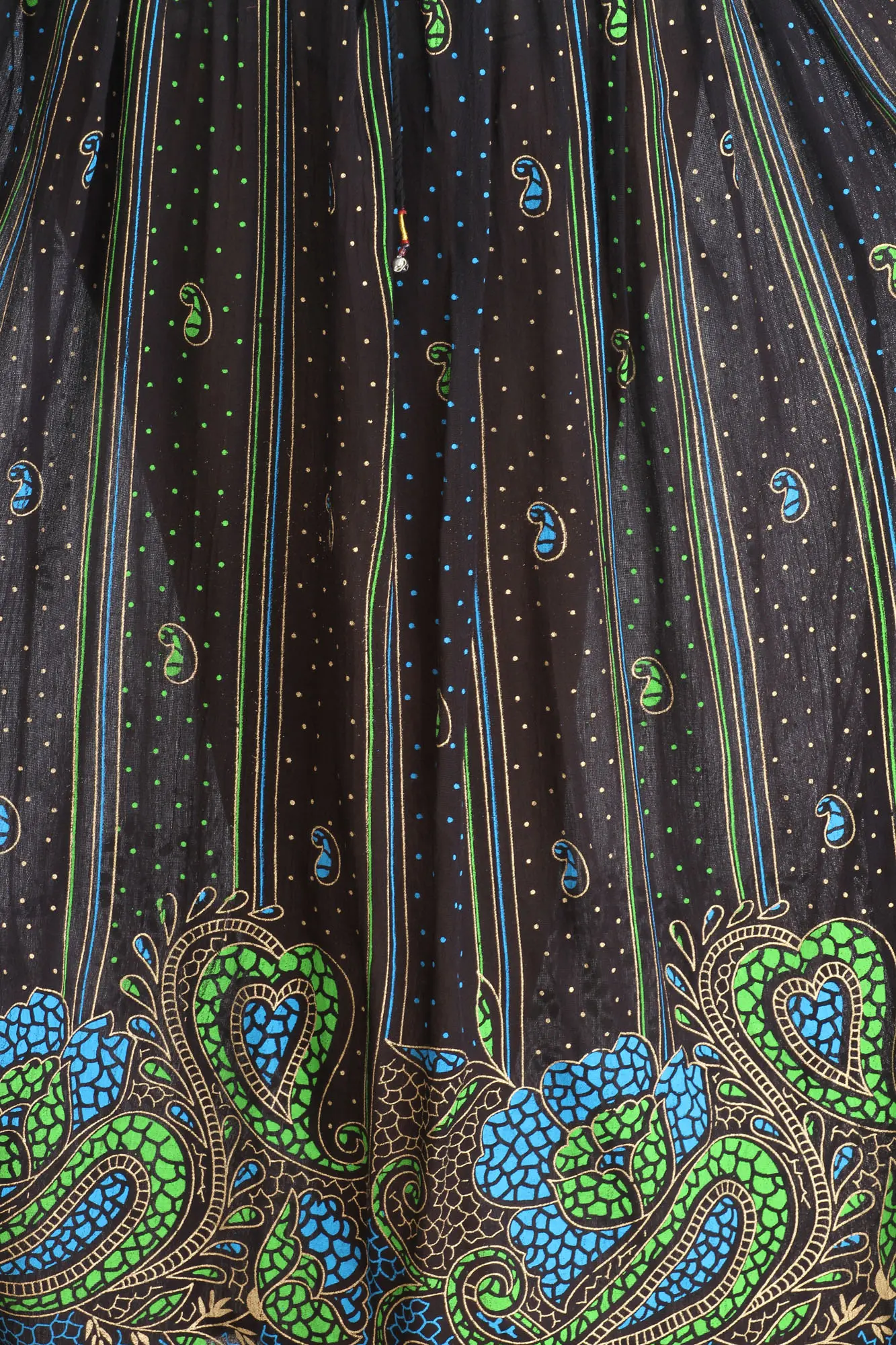 The canvas of black becomes alive in this long skirt, which is covered in neon paisley motifs all over, that bring a charming ethnic vibe to your look. Tiny butis and paisleys cover the length of the skirt, with an intricate network of paisleys and floral elements on the hem, giving the skirt a colorful detail.
