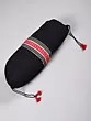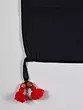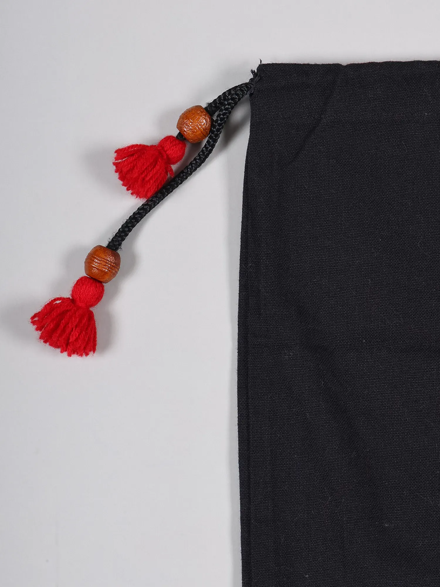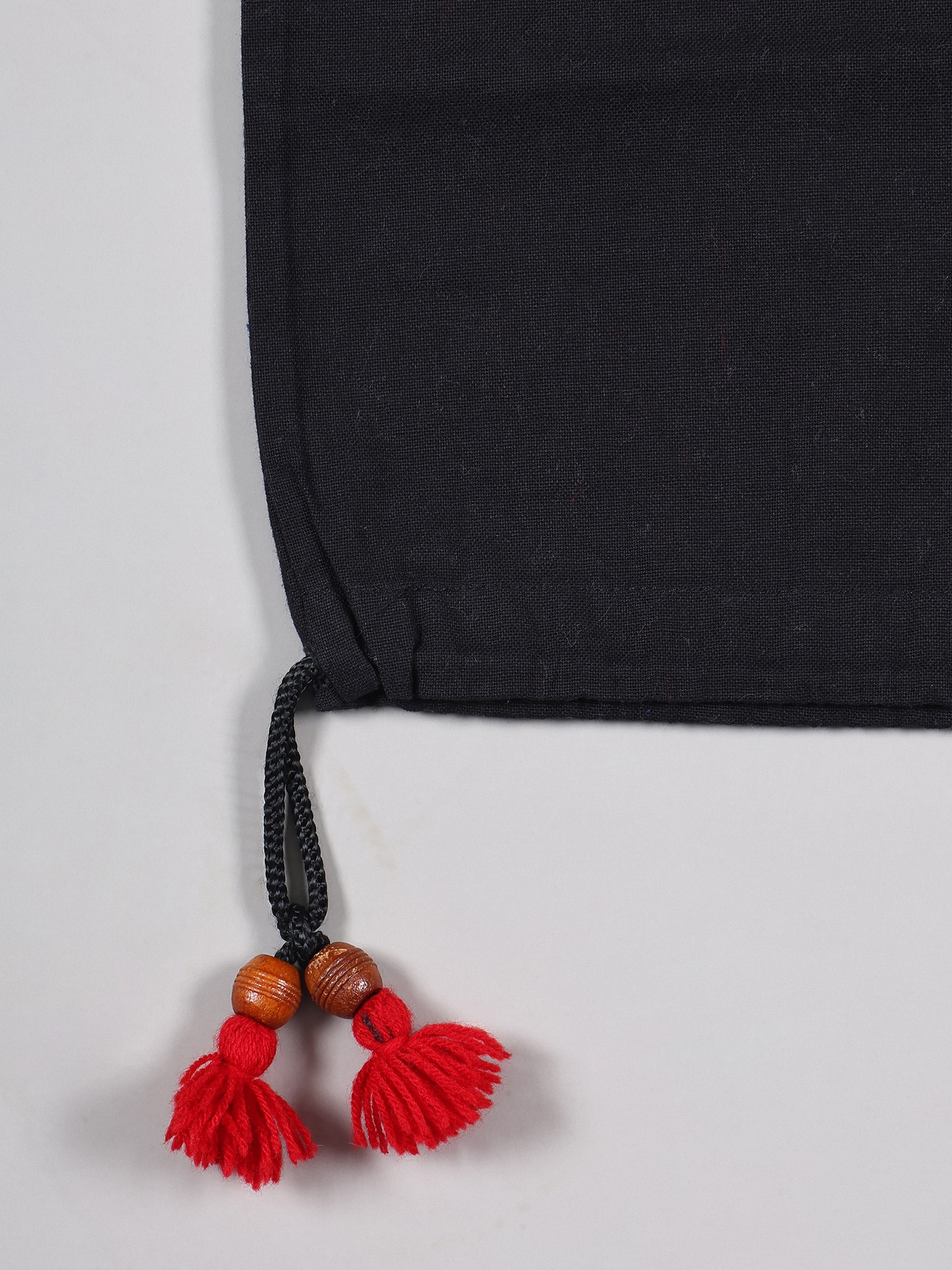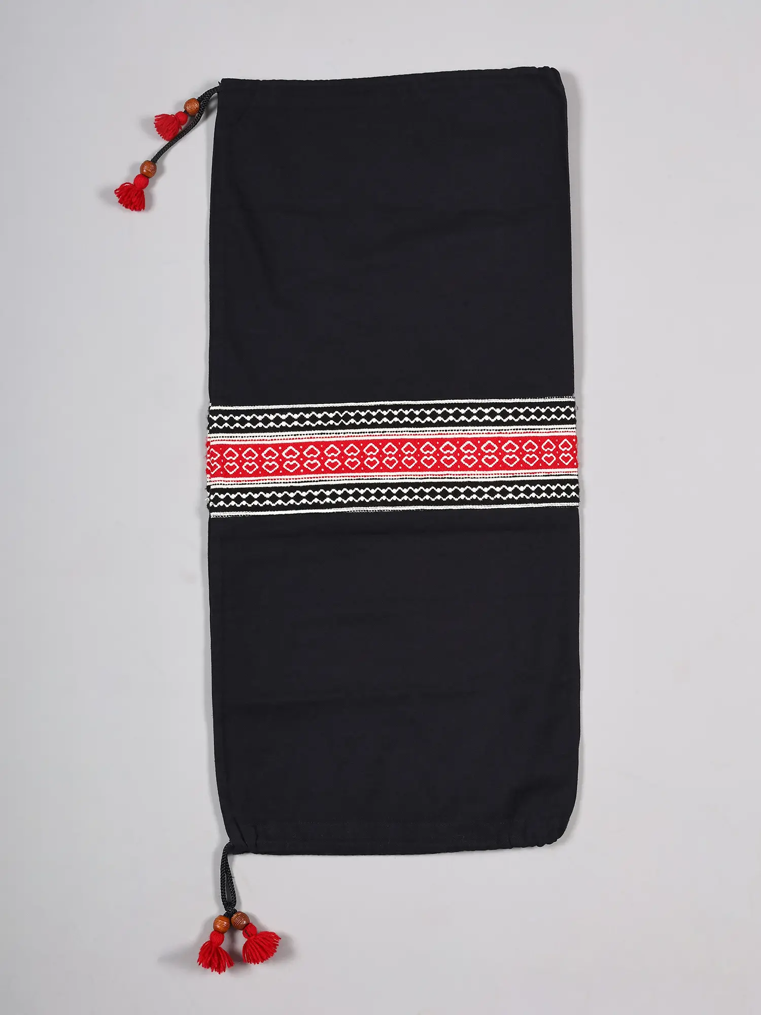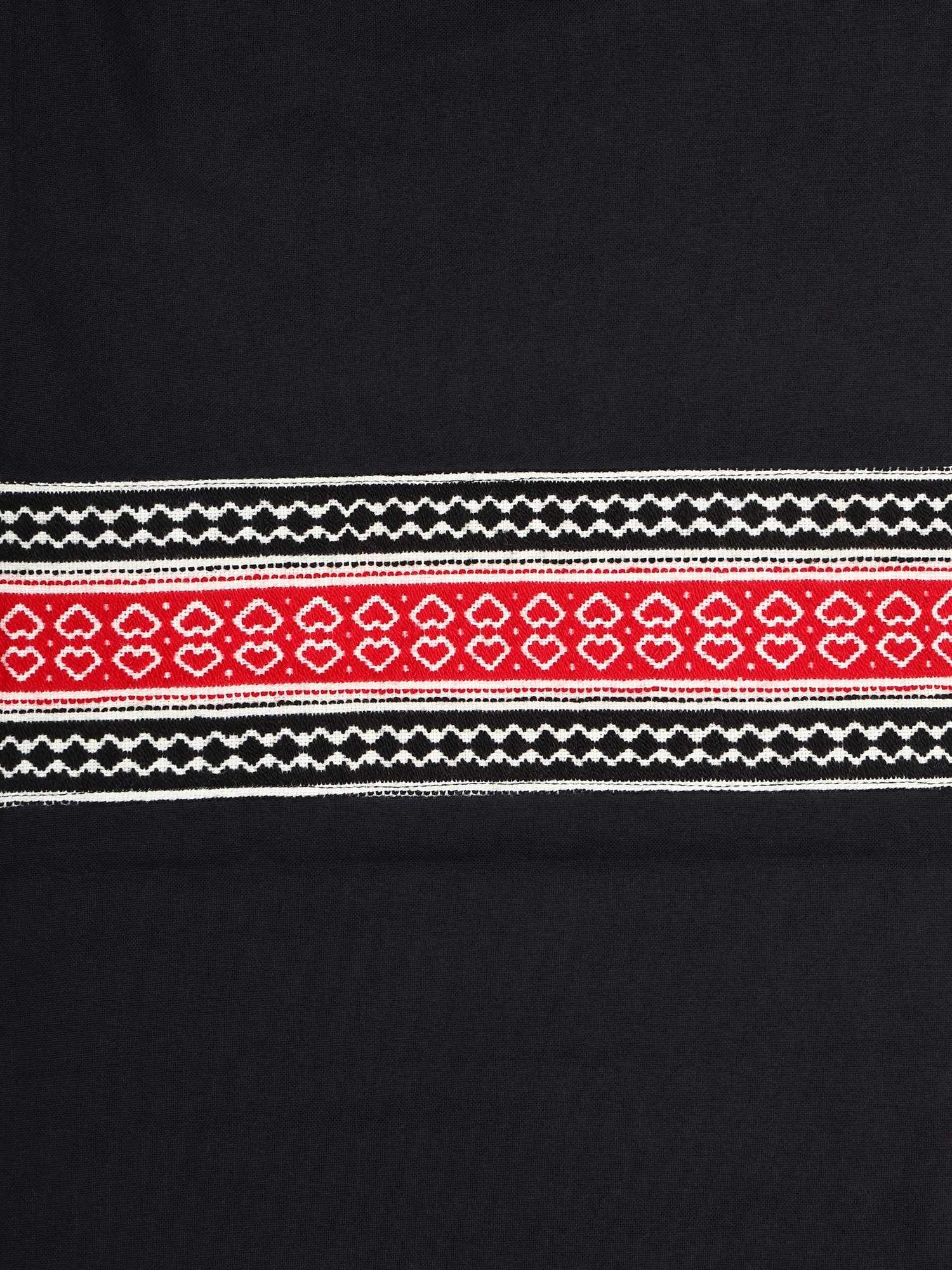 Experience the visual allure of the deep, sophisticated black fabric, providing a perfect canvas for the eye-catching embroidered band. This striking detail, approximately 28 inches in length and 13 inches in width when filled, is accented by a classic zig-zag border and a lively red heart motif, all rendered with remarkable precision. The practical tie-up closure, adorned with charming wooden beads and vibrant red tassels, not only secures your bolster but also adds a playful yet elegant finishing touch.