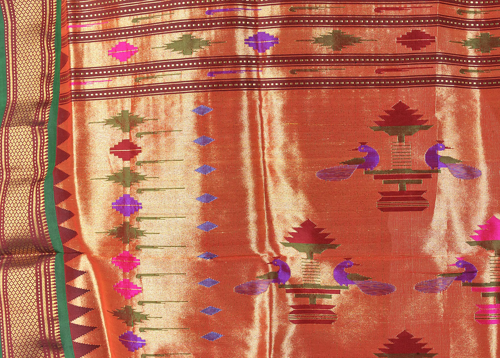 Iridescent (Dhoop Chaanv Shade) Fancy Brocade Pallu Mor Butti Paithani Saree from Maharashtra with Bold Pair of Peacock on Pallu