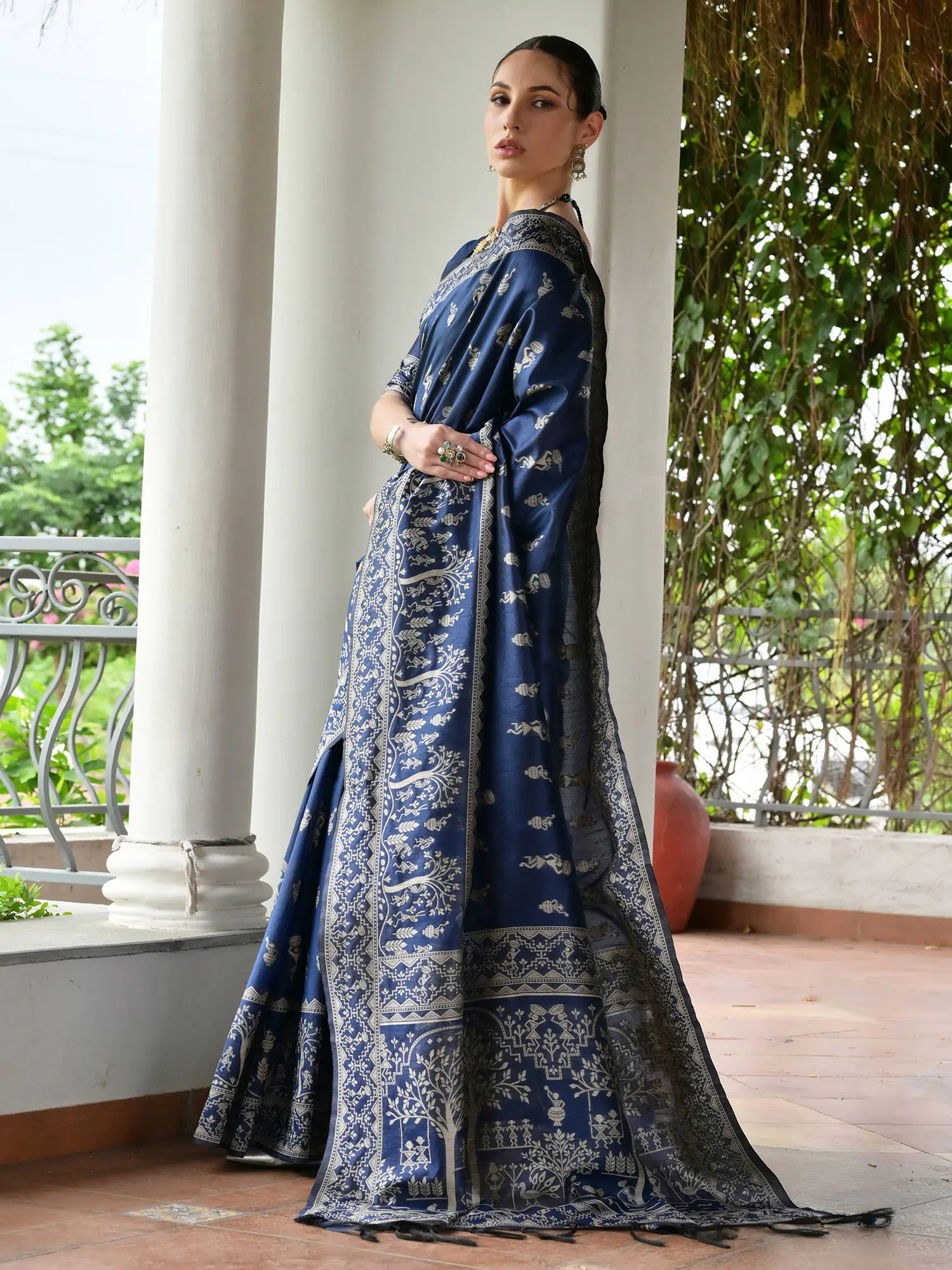 Art Silk Saree with Warli Folk Figures Printed Border and Pallu