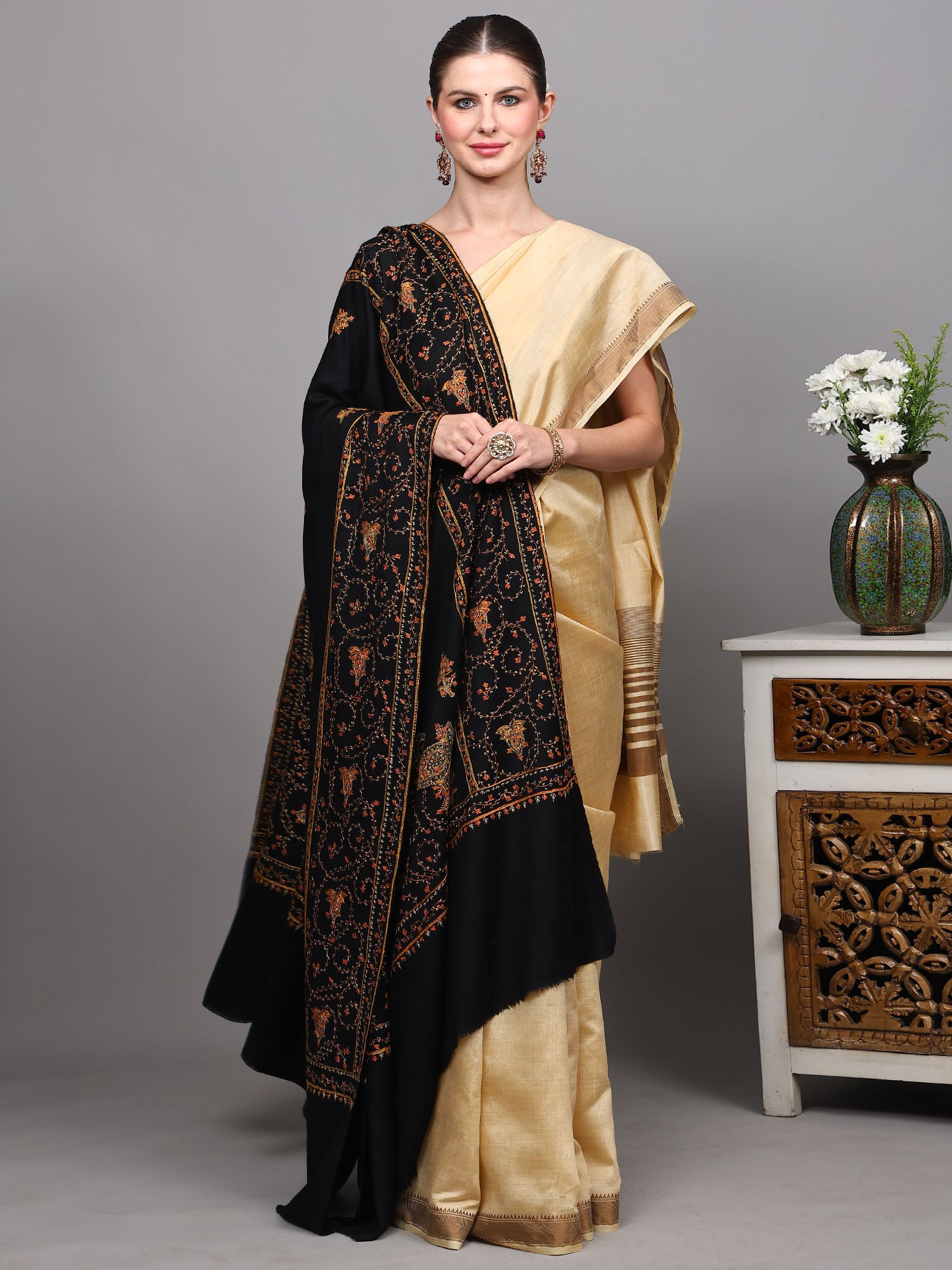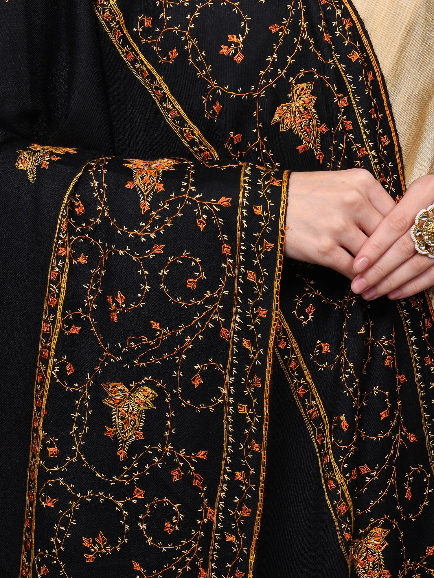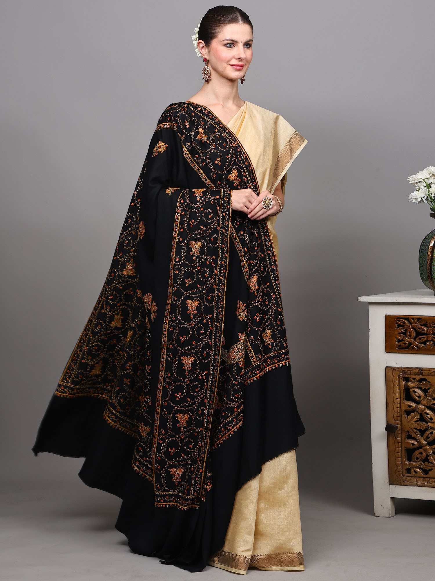 Black-Onyx Pure Pashmina Shawl with Intricate Tilla Embroidered Flowers on All-Over