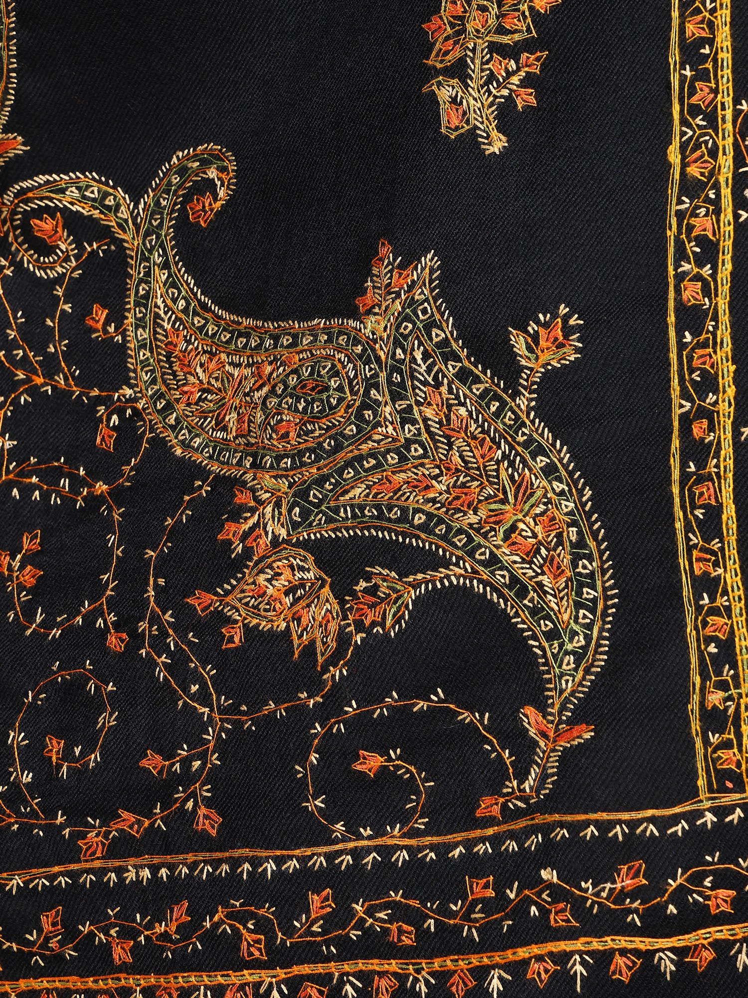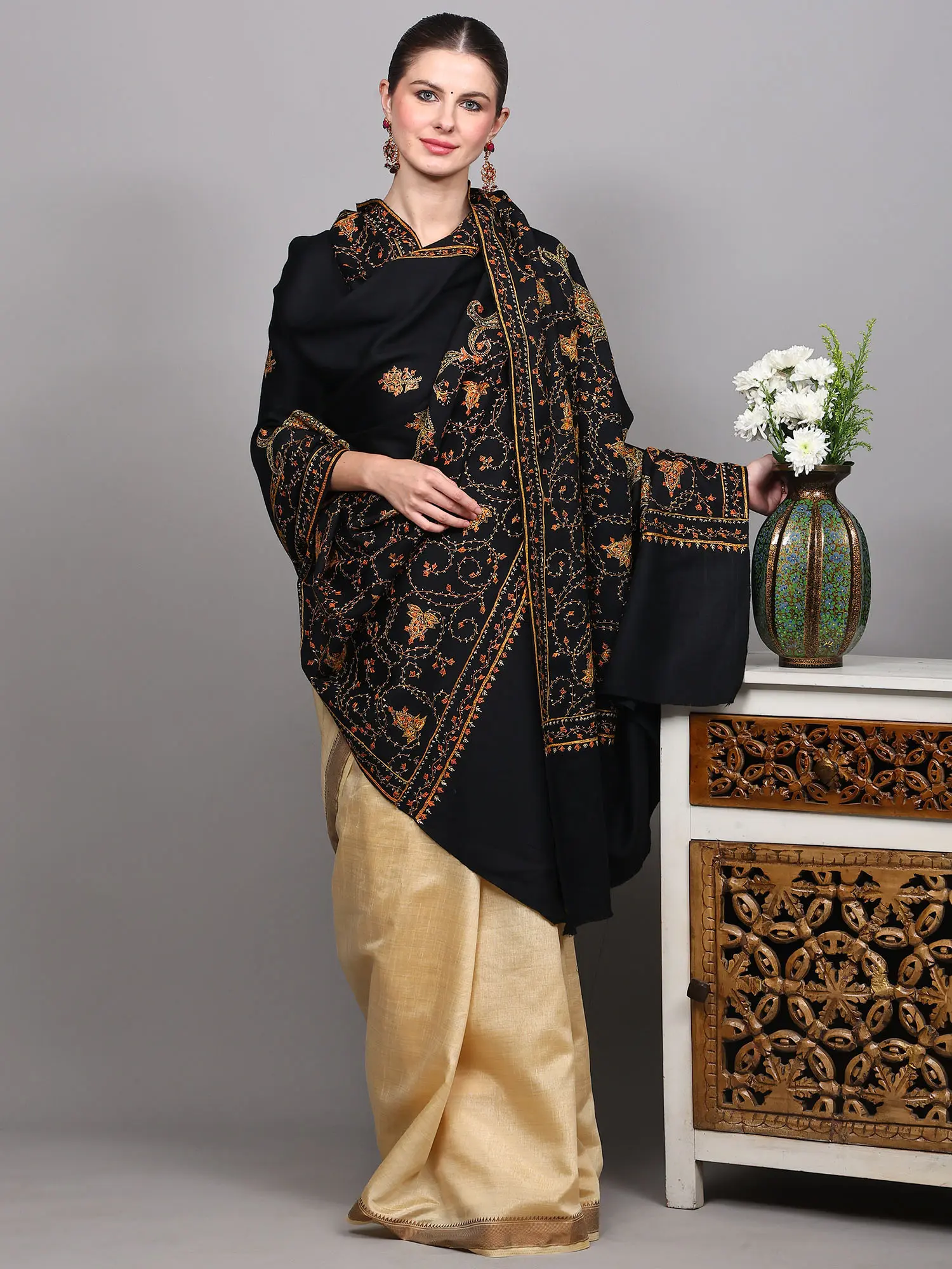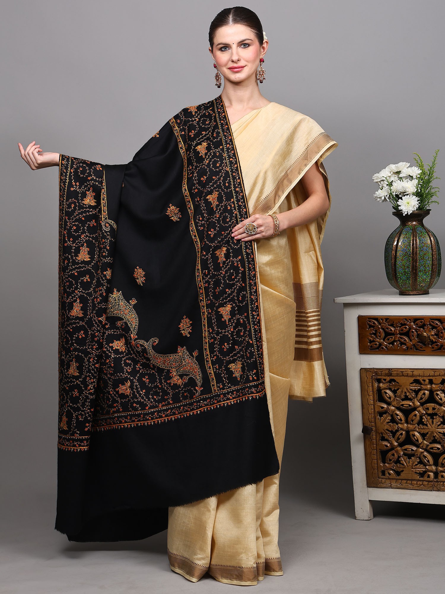 Black-Onyx Pure Pashmina Shawl with Intricate Tilla Embroidered Flowers on All-Over