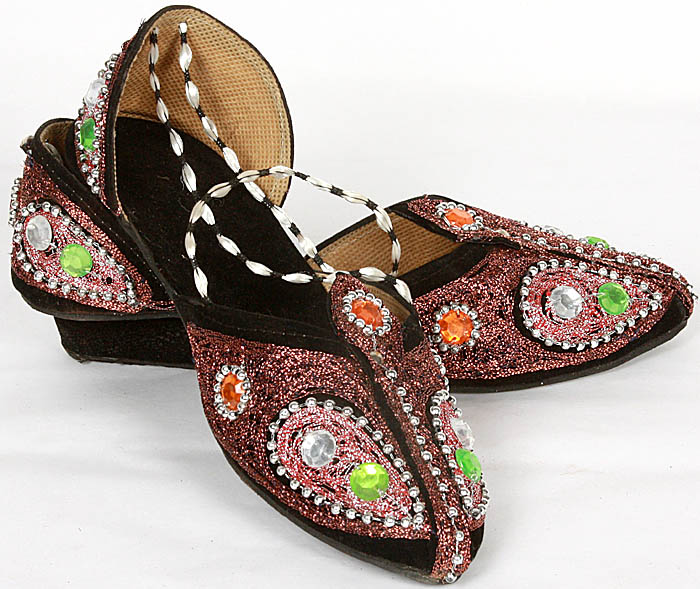 Step into a world of enchantment with these captivating sandals, designed to add a mesmerizing sparkle to any ensemble. Crafted with meticulous attention to detail, these shoes are a testament to artisanal craftsmanship, blending traditional artistry with a contemporary flair. The rich black base serves as a perfect canvas for the intricate beadwork that adorns the entire surface, creating a symphony of shimmering textures and eye-catching patterns.