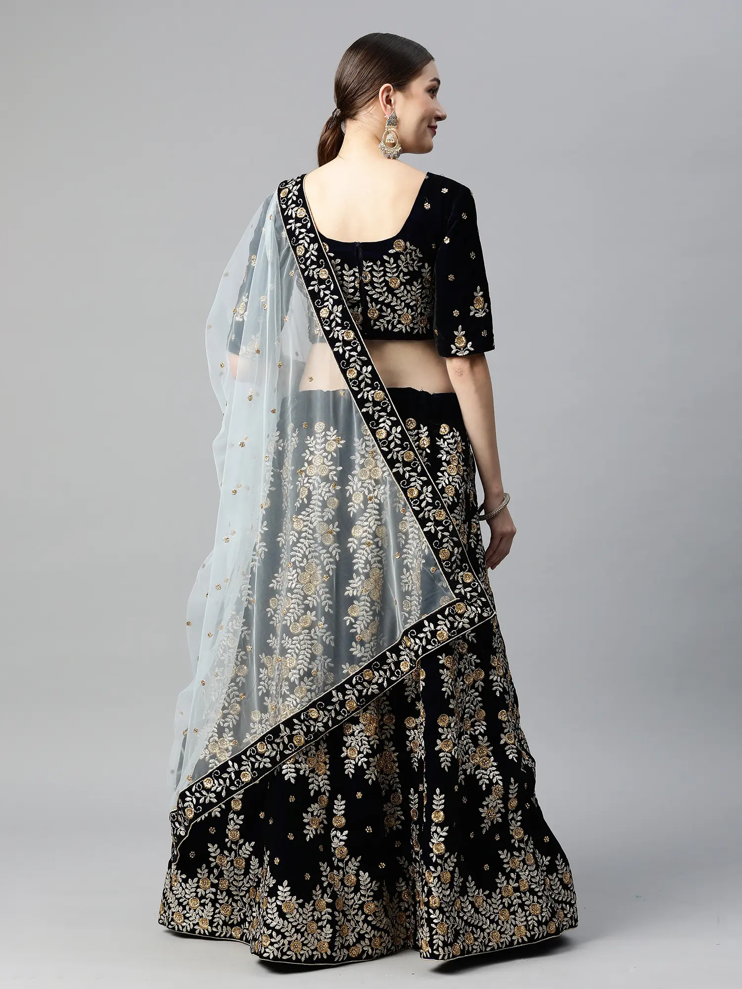The true magic of this lehenga choli lies in its elaborate Zari and floral-leaf embroidery. Delicate Zari threads, woven with metallic brilliance, intertwine with meticulously crafted floral and leaf motifs. This stunning embroidery cascades across the lehenga, the choli, and the border of the dupatta, creating a mesmerizing pattern that catches the light with every movement. The gold and silver Zari work stands out beautifully against the deep black velvet, adding a touch of opulence and grandeur.