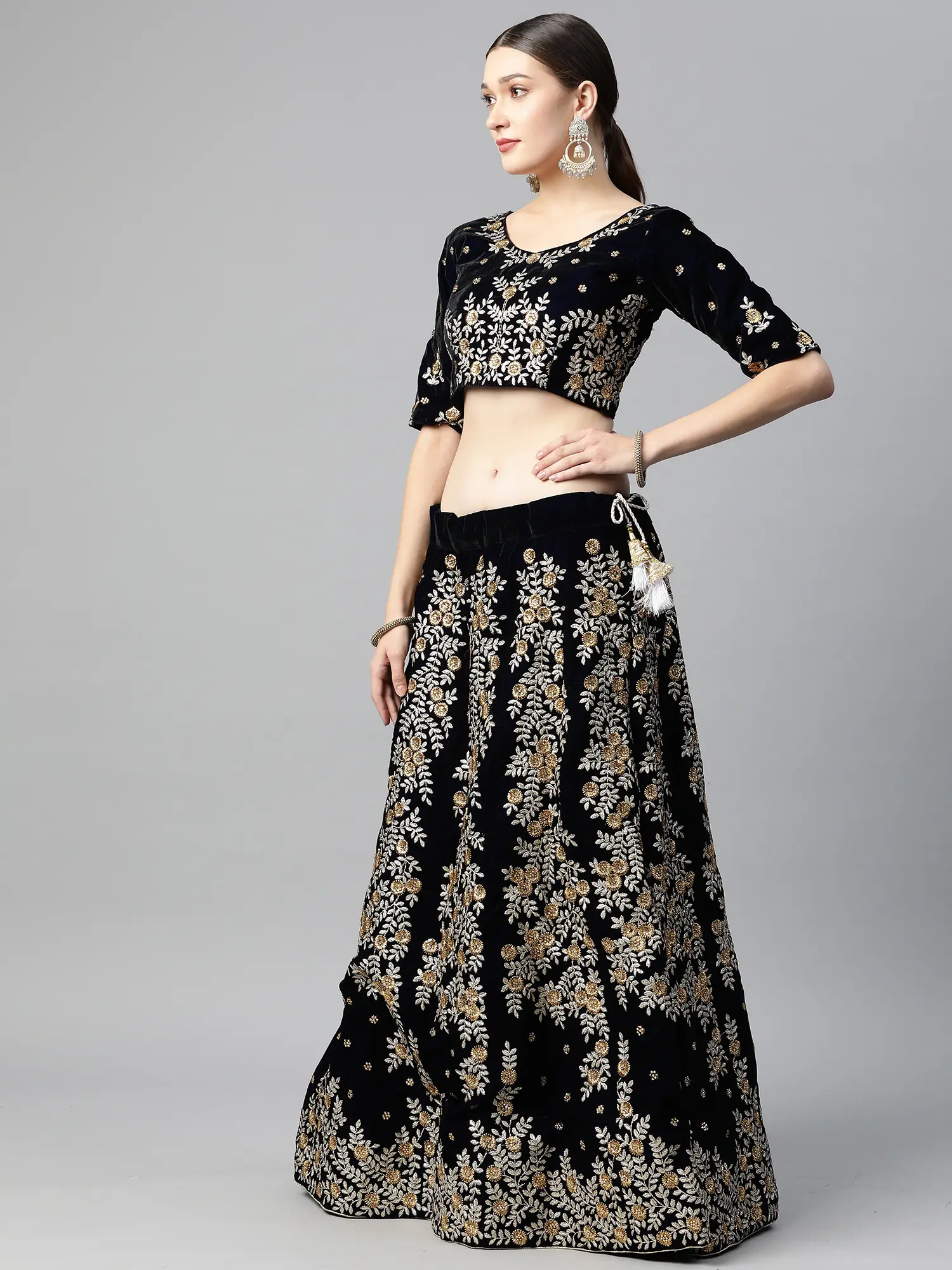 Step into a world of refined sophistication with this exquisite black velvet lehenga choli set. Crafted from luxurious velvet, this ensemble offers a sumptuous feel and a rich, deep hue that serves as the perfect canvas for the intricate detailing. It's designed to make you the center of attention at any celebratory occasion, embodying the spirit of traditional Indian craftsmanship with a contemporary flair.