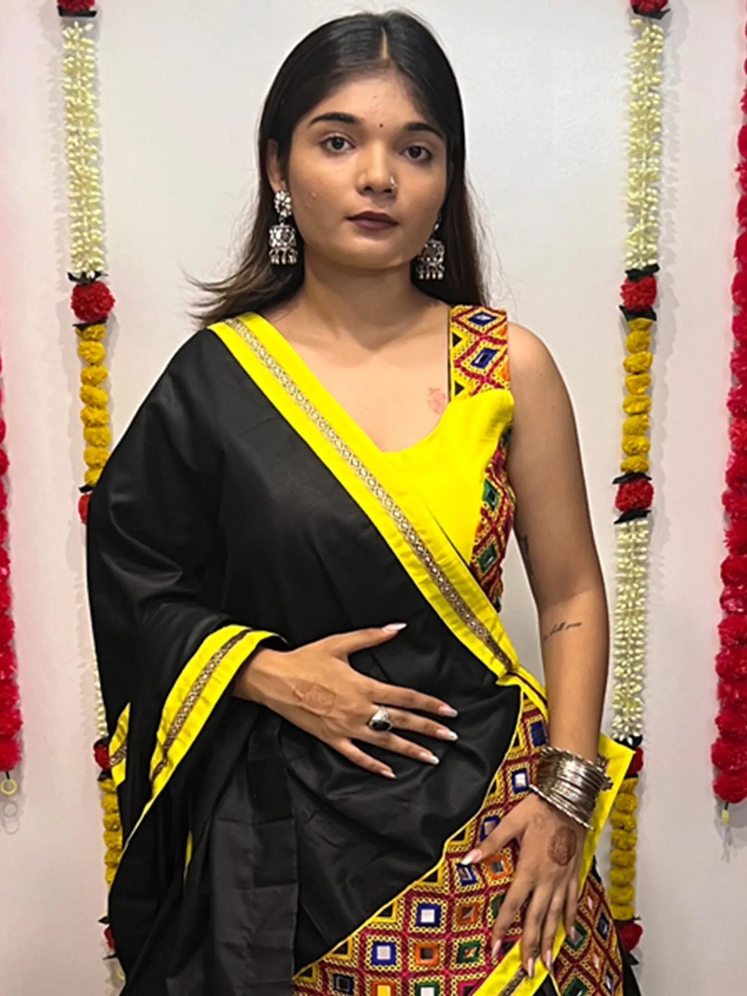 The true magic of this lehenga choli lies in its intricate embellishments. The black lehenga is adorned with panels featuring a captivating display of mirror work set against colorful embroidery. These mirrors catch the light, creating a dazzling effect that adds a touch of glamour and sparkle to your look. The contrast of the vibrant mirror work against the deep black fabric is simply mesmerizing. Complementing the lehenga is a striking yellow choli, also enhanced with intricate embroidery and mirror detailing on the yoke, mirroring the richness of the skirt. The vibrant yellow hue of the choli and the accompanying dupatta provides a cheerful and energetic contrast, making the outfit truly stand out.