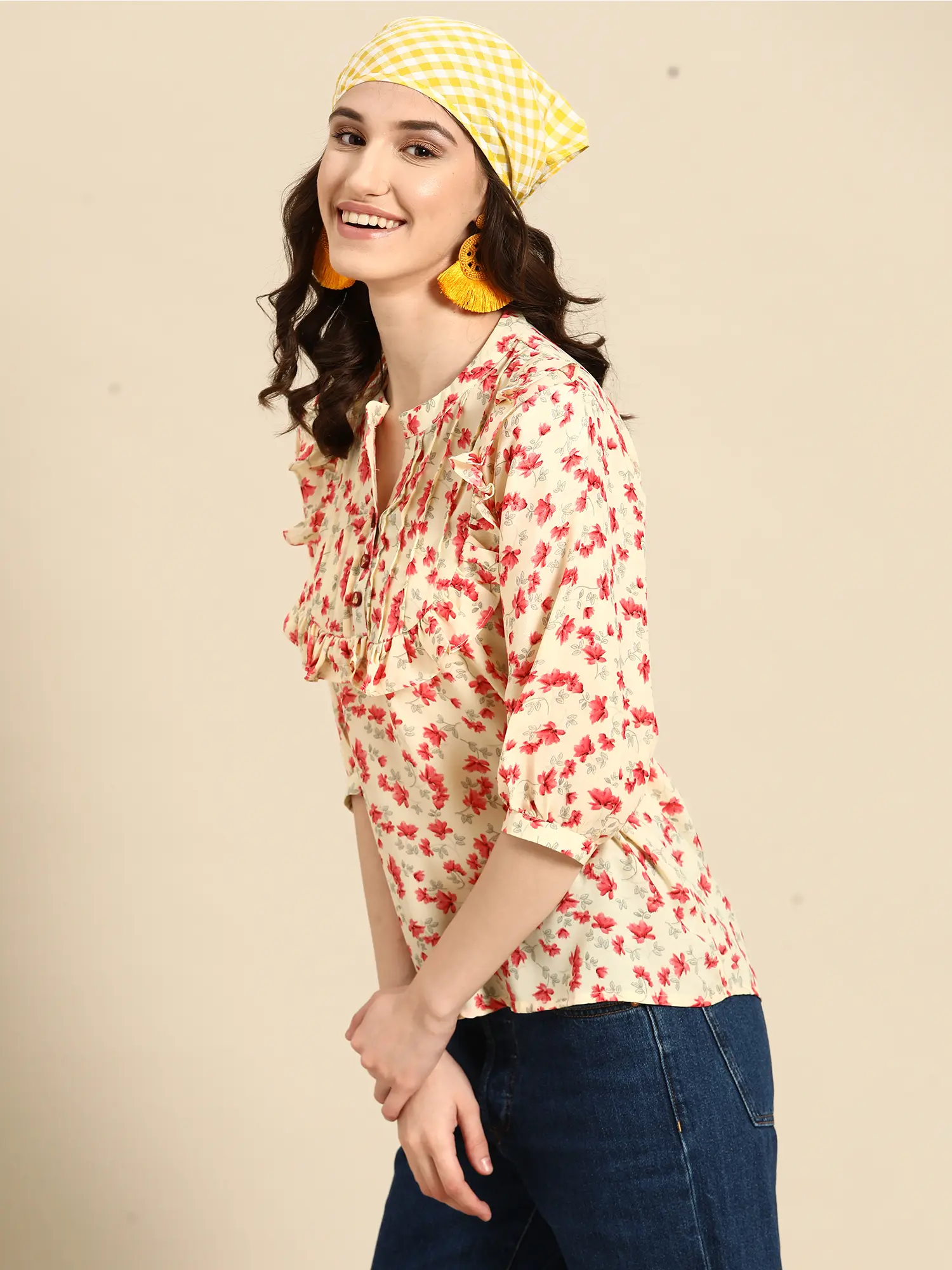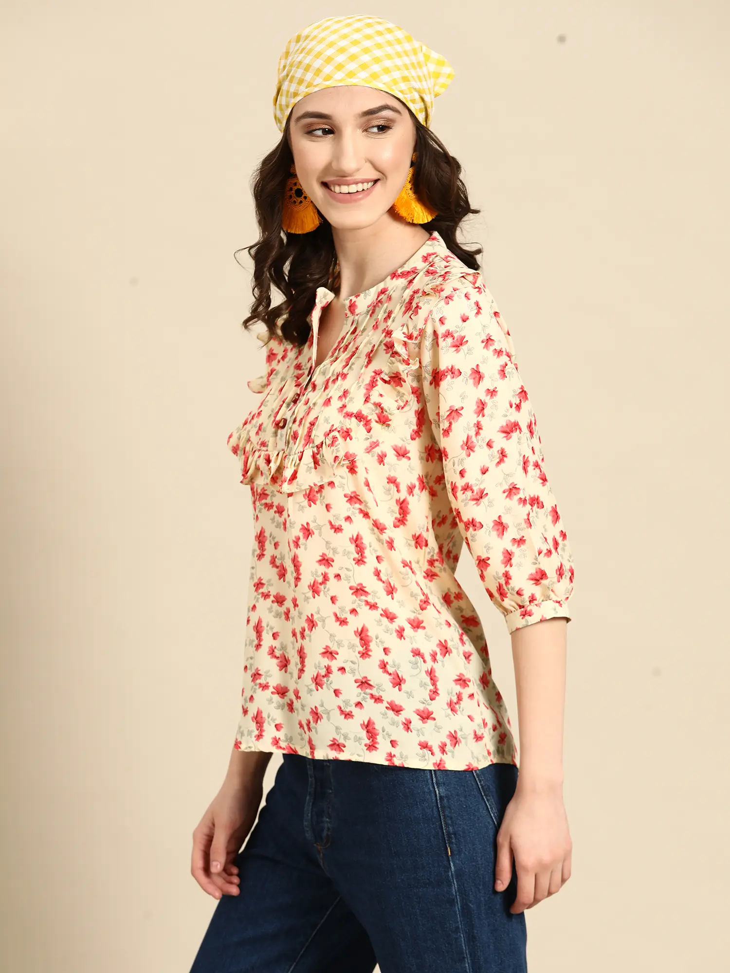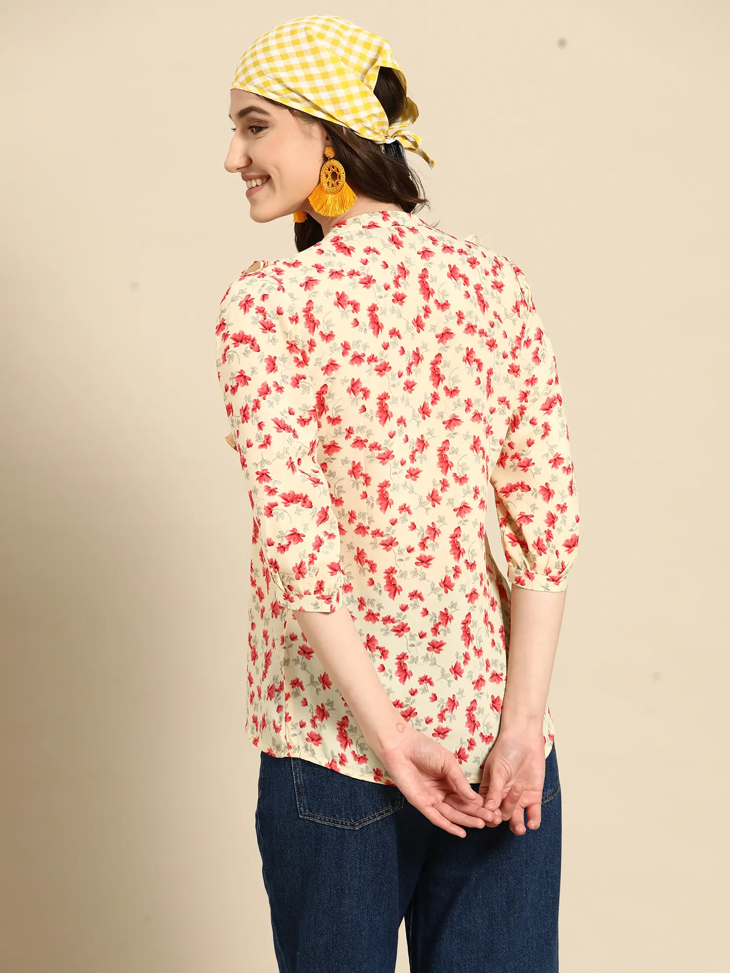 Step into a world of effortless style and vibrant femininity with this delightful floral print top. Crafted from a lightweight and breathable poly crepe fabric, this piece promises both comfort and a chic aesthetic, making it a versatile addition to any wardrobe. The soft, creamy base of the fabric serves as a perfect canvas for the lively scattering of delicate pink blossoms, creating a look that is both eye-catching and subtly elegant. This top is designed to bring a touch of springtime freshness to your everyday outfits, no matter the season.