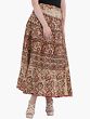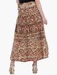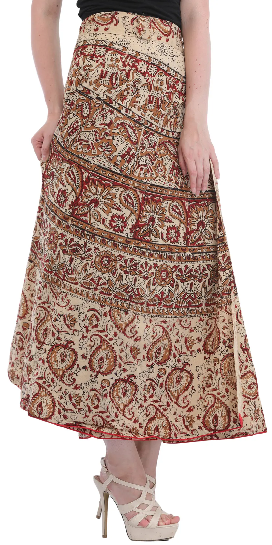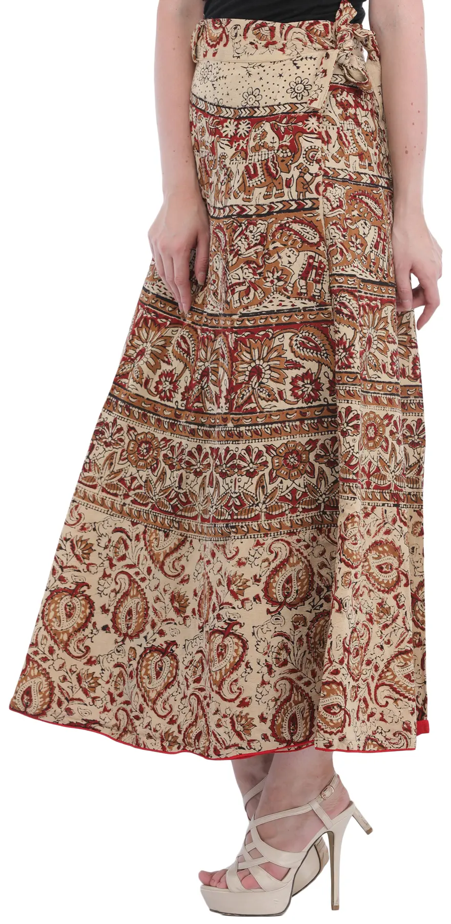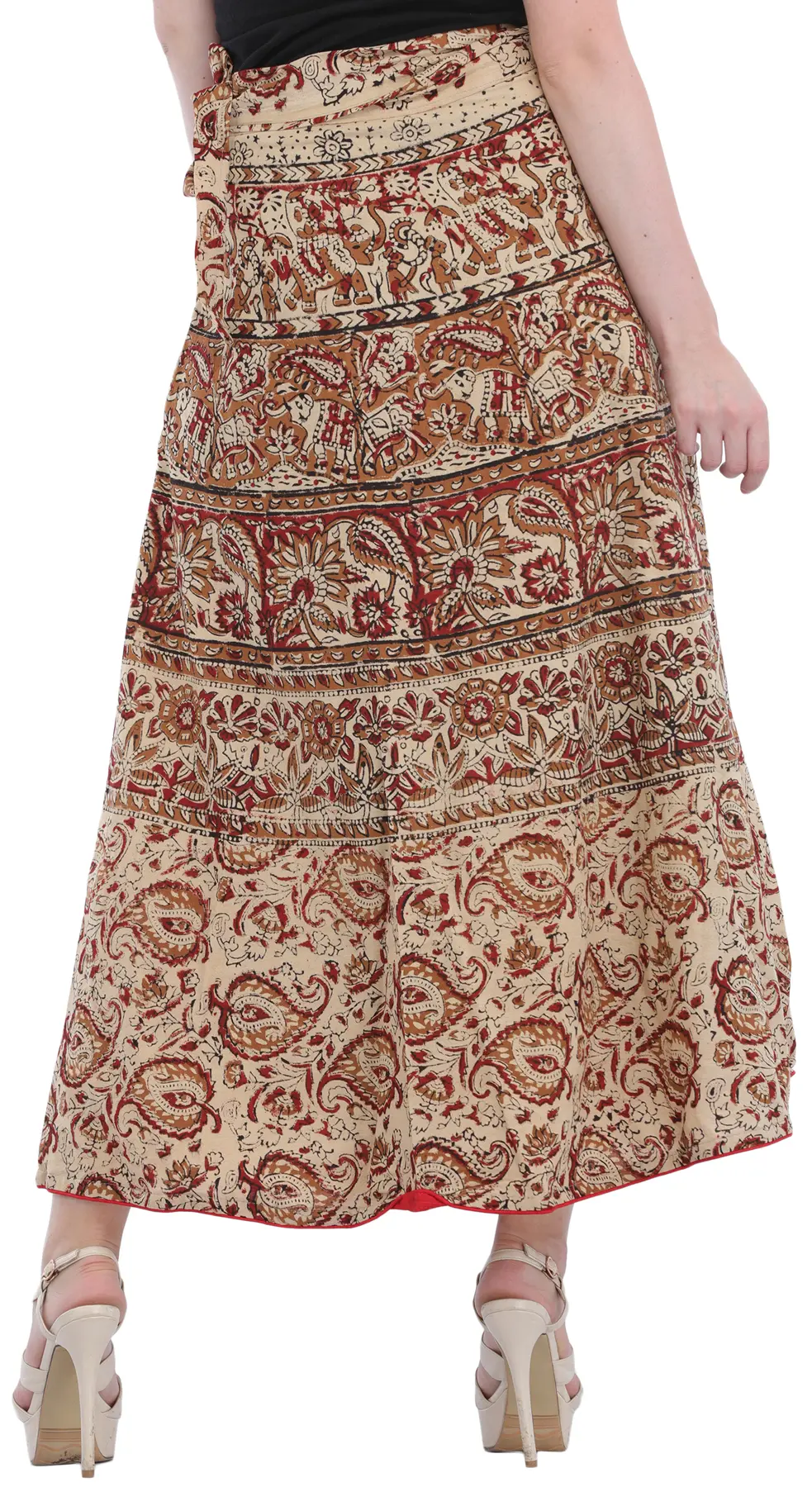 The foundation of this skirt's allure lies in its captivating print. Inspired by the rich cultural heritage of Pilkhuwa, the fabric is adorned with a harmonious blend of classic paisley patterns and whimsical elephant motifs. The paisleys, with their teardrop shape and intricate floral detailing, evoke a sense of timeless elegance and organic beauty. Interspersed amongst them are charmingly rendered elephants, symbolizing strength, wisdom, and good fortune. These iconic Indian symbols are presented in a warm palette of bleached sand tones, rich browns, and deep reds, creating a visually stunning and culturally resonant design.