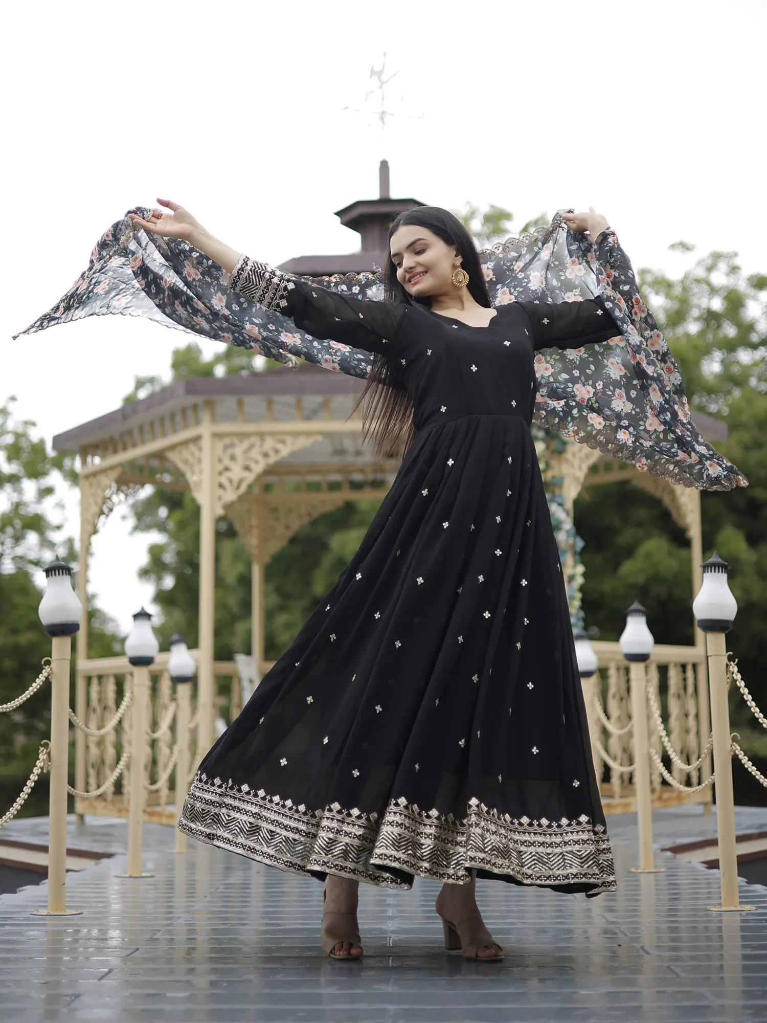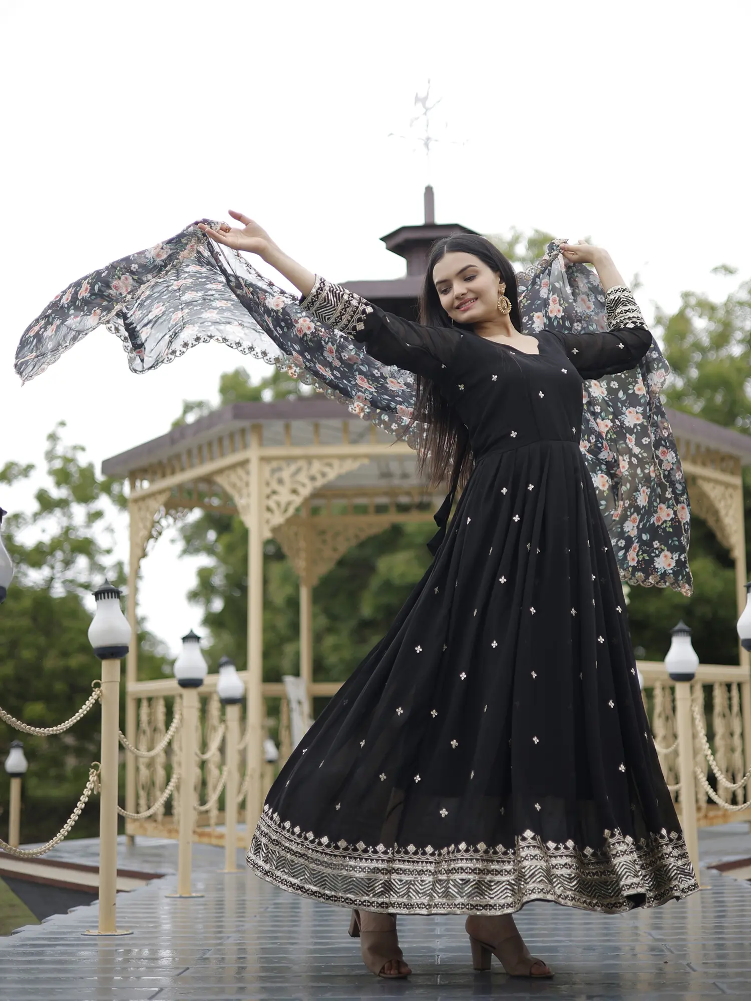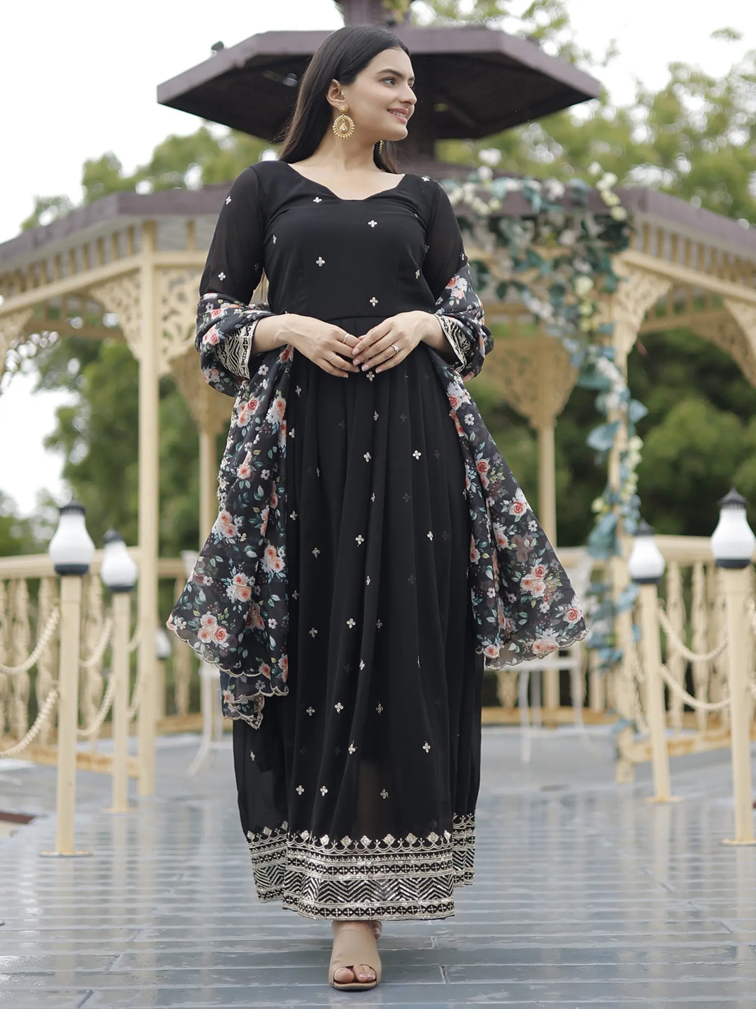 This Blooming Georgette Black Suit is a stunning example of contemporary Indian fashion. This designer ensemble features intricate embroidery, zari work, and sequins detailing on luxurious georgette fabric. The black hue adds a touch of sophistication, while the floral motifs enhance its elegance. The long sleeves and the kalidar (flair)’ design give the attire a happy vibe that is also sophisticated. This suit is a perfect fusion of traditional elements and modern design, making it an ideal choice for special occasions, embodying grace and style in ethnic wear.