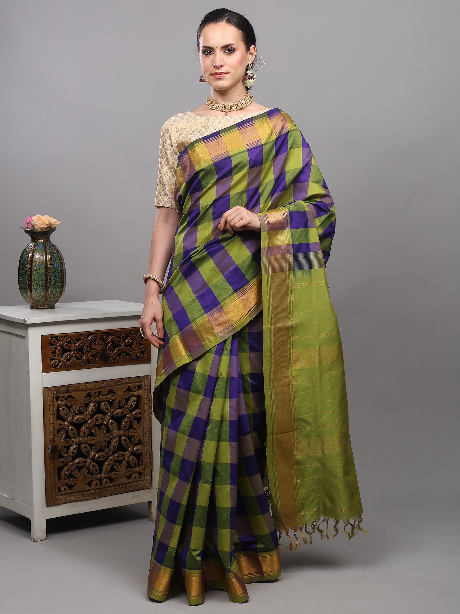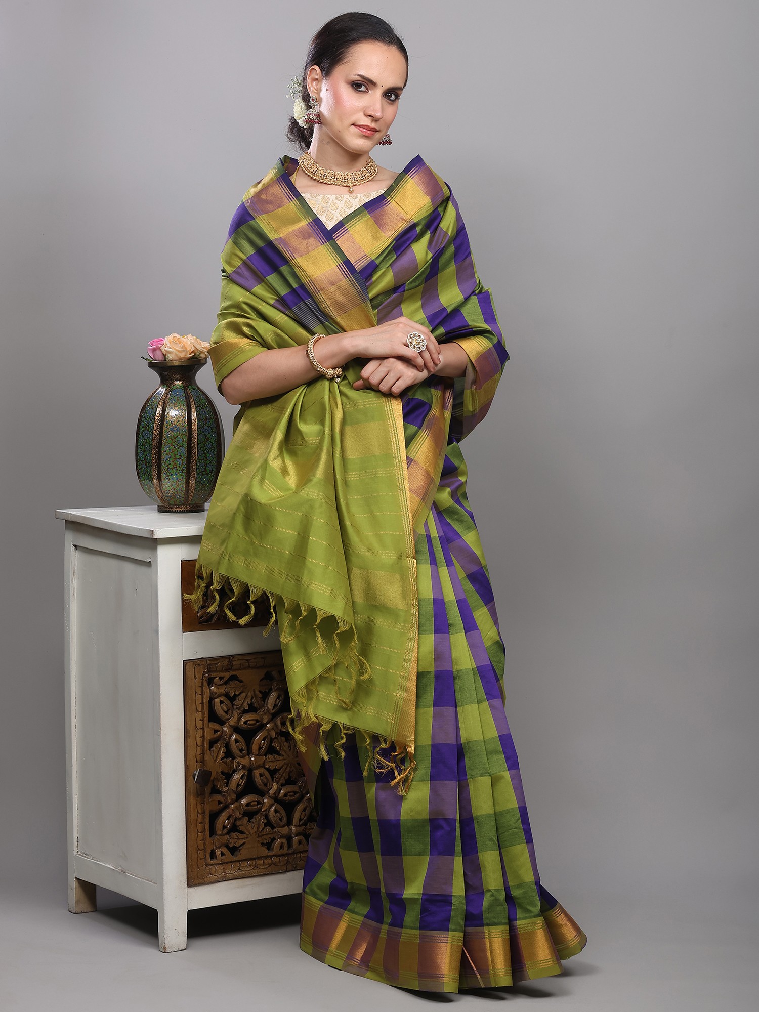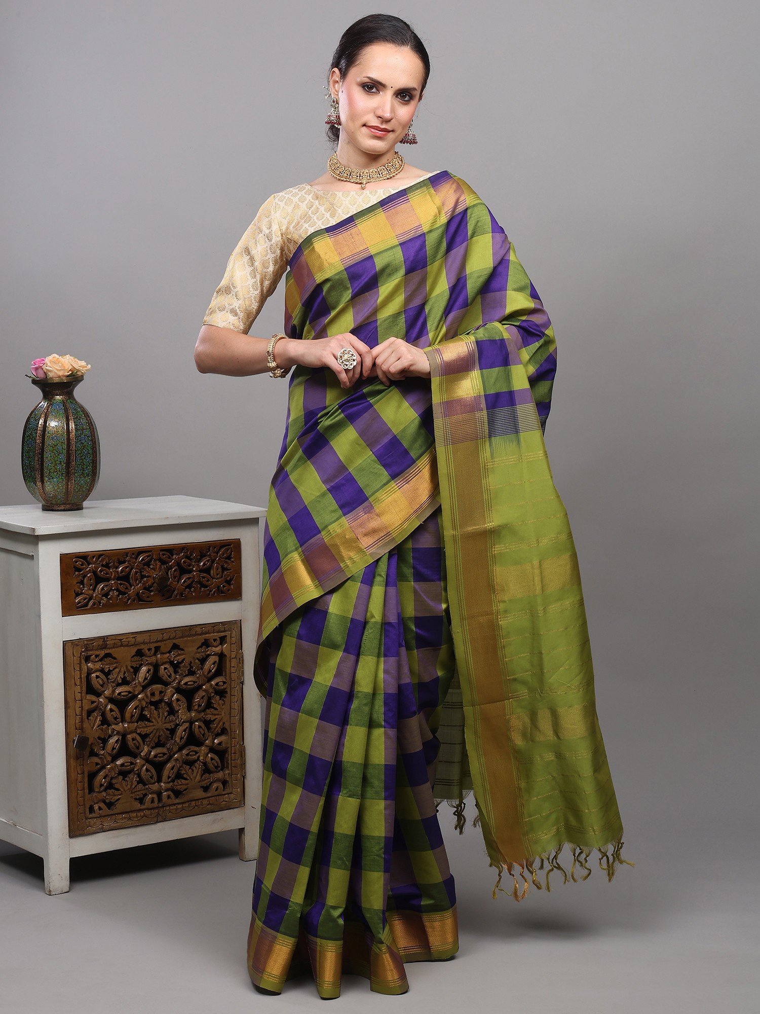 Blue and Green Buffalo Check woven Saree with Zari Thread Stripe Border from Bangalore
