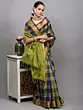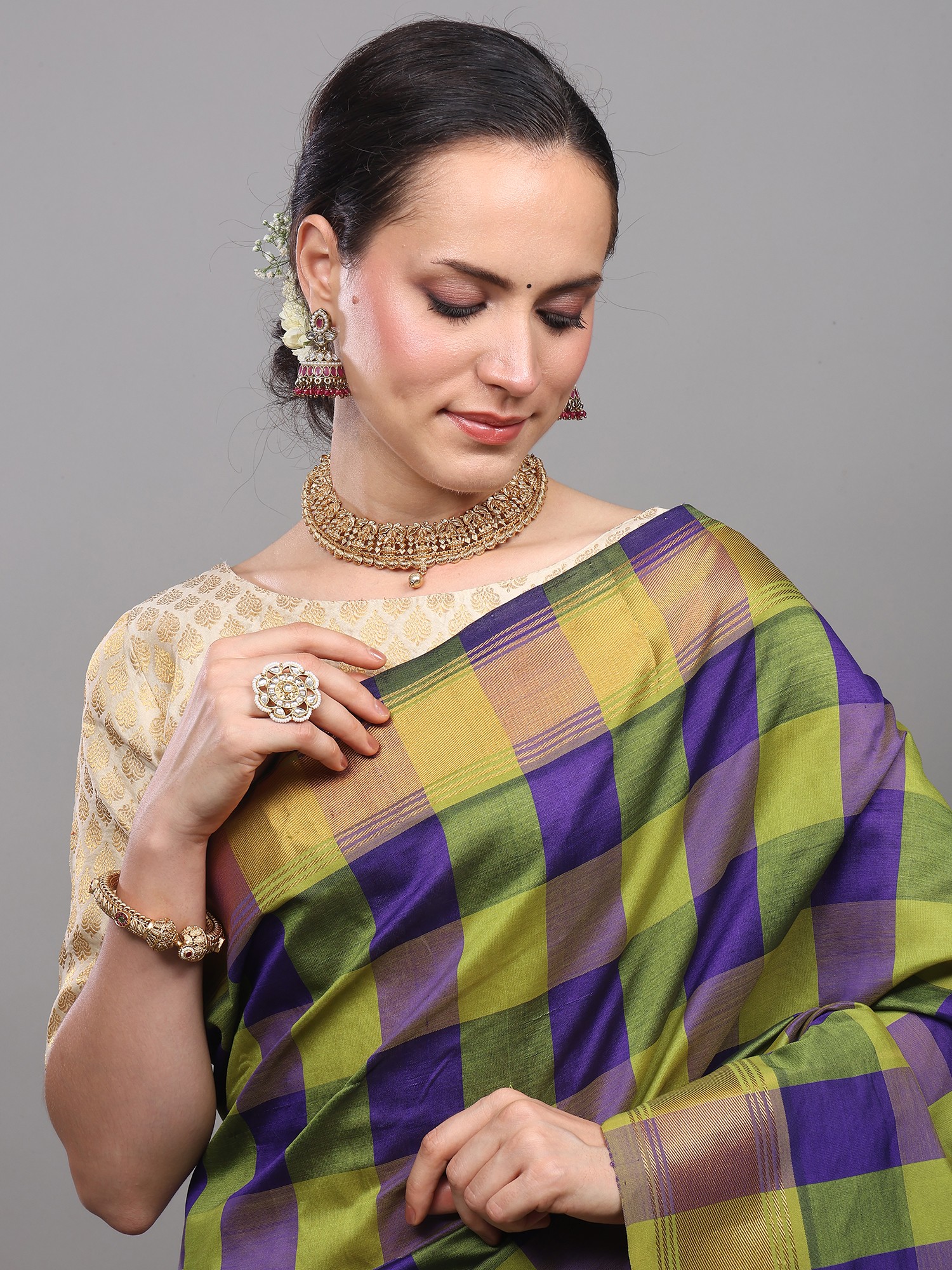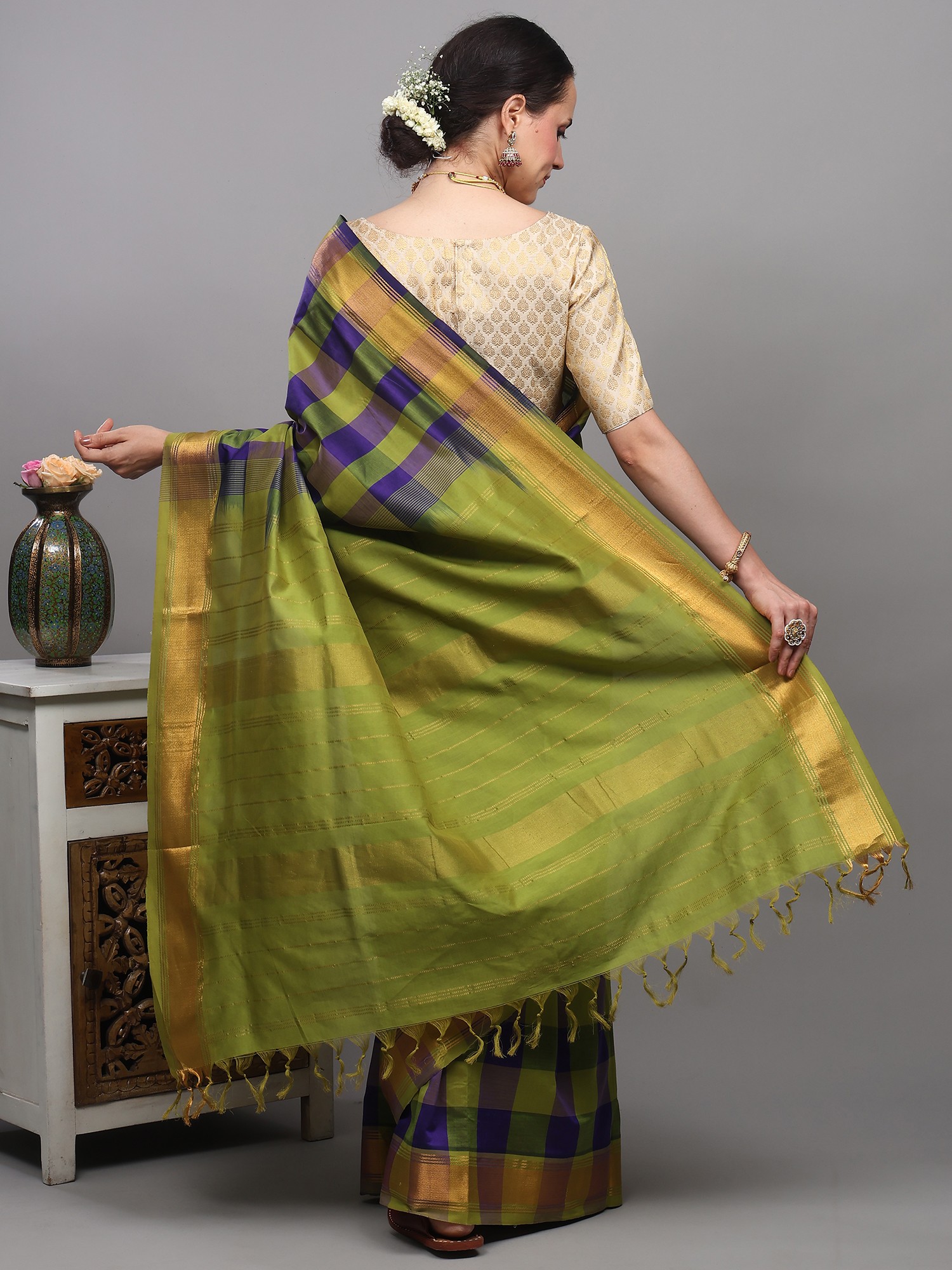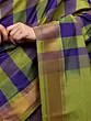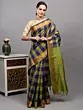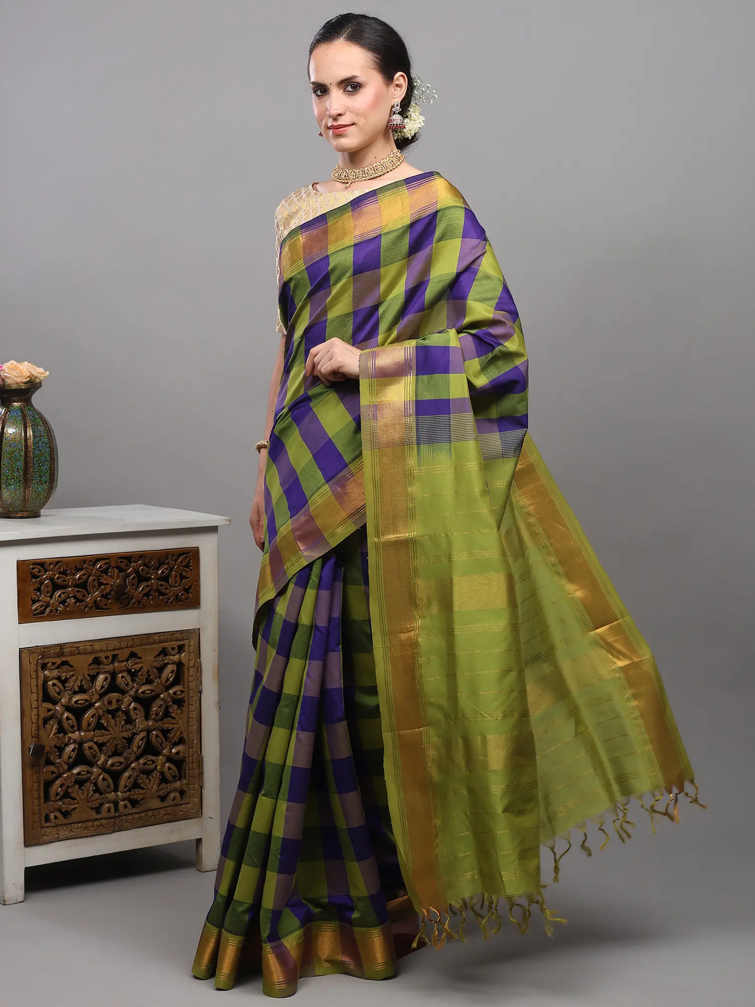 Blue and Green Buffalo Check woven Saree with Zari Thread Stripe Border from Bangalore