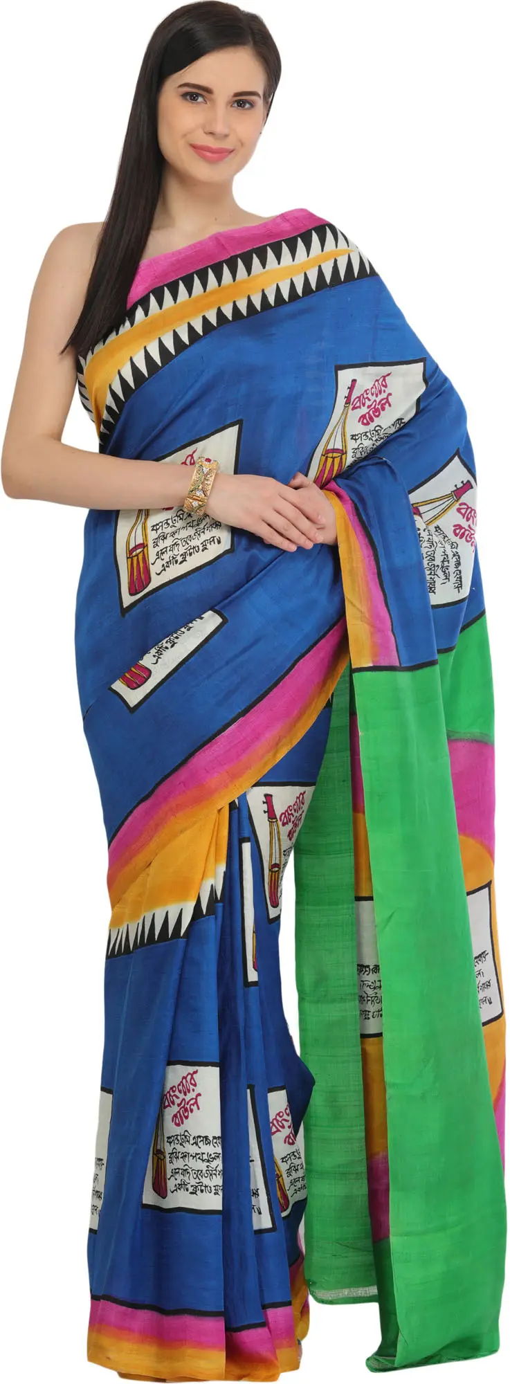 Immerse yourself in the vibrant artistic heritage of Kolkata with this exquisite pure silk sari. Crafted with meticulous attention to detail, this sari is a wearable masterpiece, showcasing a unique digital print that tells a story of culture and tradition. The rich blue base of the sari is adorned with striking white panels, each featuring an artistic depiction of a musical instrument, likely a Dotara or similar folk string instrument, accompanied by elegant Bengali script. This design is more than just an aesthetic choice; it's a tribute to the artistic soul of Bengal, evoking the spirit of its music and literature. The captivating print is beautifully framed by a striking border. The pallu and the lower half of the sari transition through a mesmerizing gradient of vibrant colors, including bright green, warm pink, and sunny yellow, creating a dynamic and eye-catching effect. This bold color palette is expertly blended, adding a contemporary flair to the traditional silk weave. The contrast between the intricate printed panels and the flowing color-blocked sections creates a visually stunning and harmonious composition. This sari is made from pure silk, renowned for its luxurious sheen, soft texture, and remarkable drape. Silk is a timeless fabric that drapes elegantly, ensuring that the sari flows beautifully around the wearer, enhancing its overall appeal. The smooth finish of the silk makes it comfortable to wear, while its natural luster adds an air of sophistication.