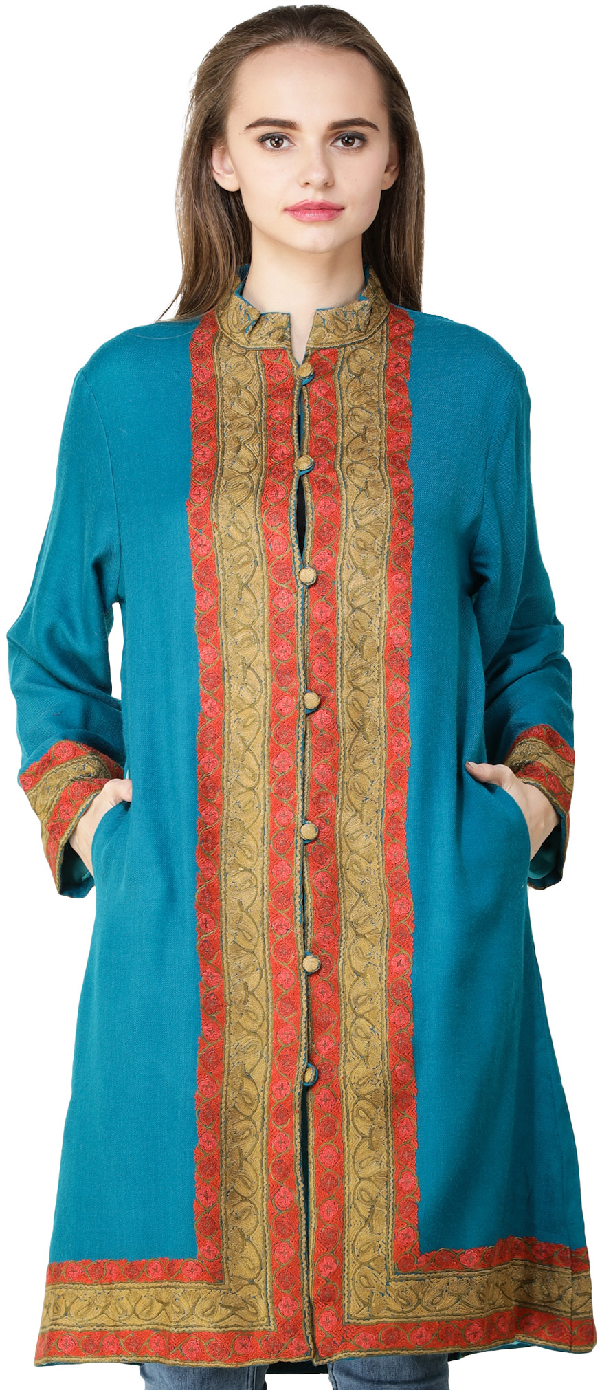 Estate-Blue Plain Kashmiri Pure Wool Short Jacket With Paisley Aari Embroidery by Hand