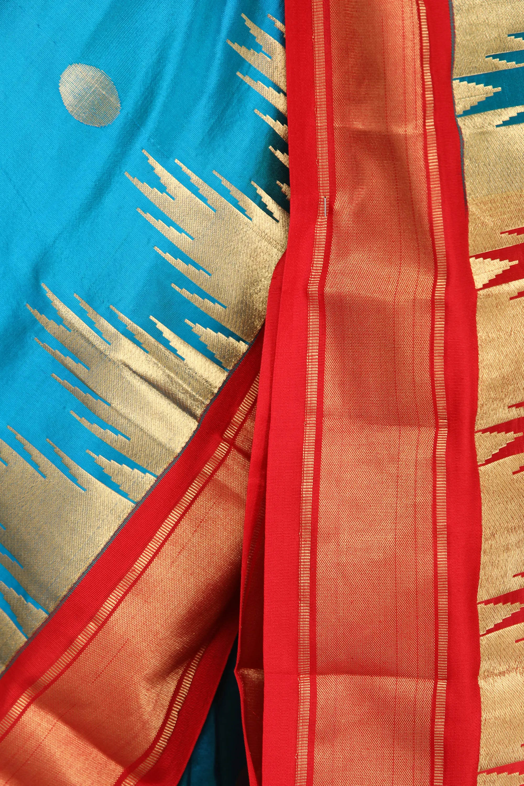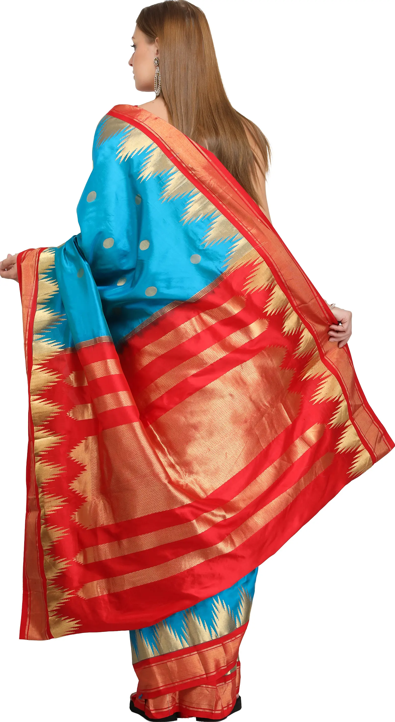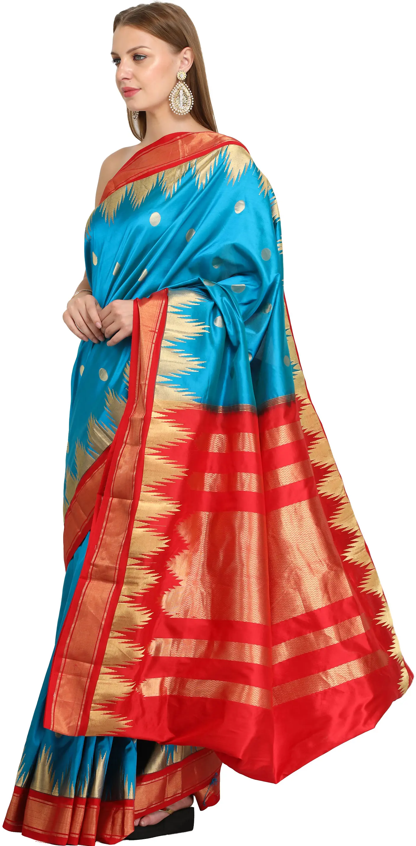 The Blue-Jewel Traditional Brocaded Sari from Bangalore is a true gem in the world of ethnic fashion. Its stunning fusion of rich blue and vibrant red creates a mesmerizing drape, ideal for festive occasions. Adorned with meticulously woven bootis, this sari showcases the epitome of craftsmanship. The glistening golden work intricately adorns the fabric, adding a touch of opulence. The temple border is a testament to tradition, featuring flawless motifs that honor heritage. When draped, this sari embodies the essence of timeless elegance, making it the perfect choice for celebrating cultural festivities and adding a touch of regal splendor to special days.