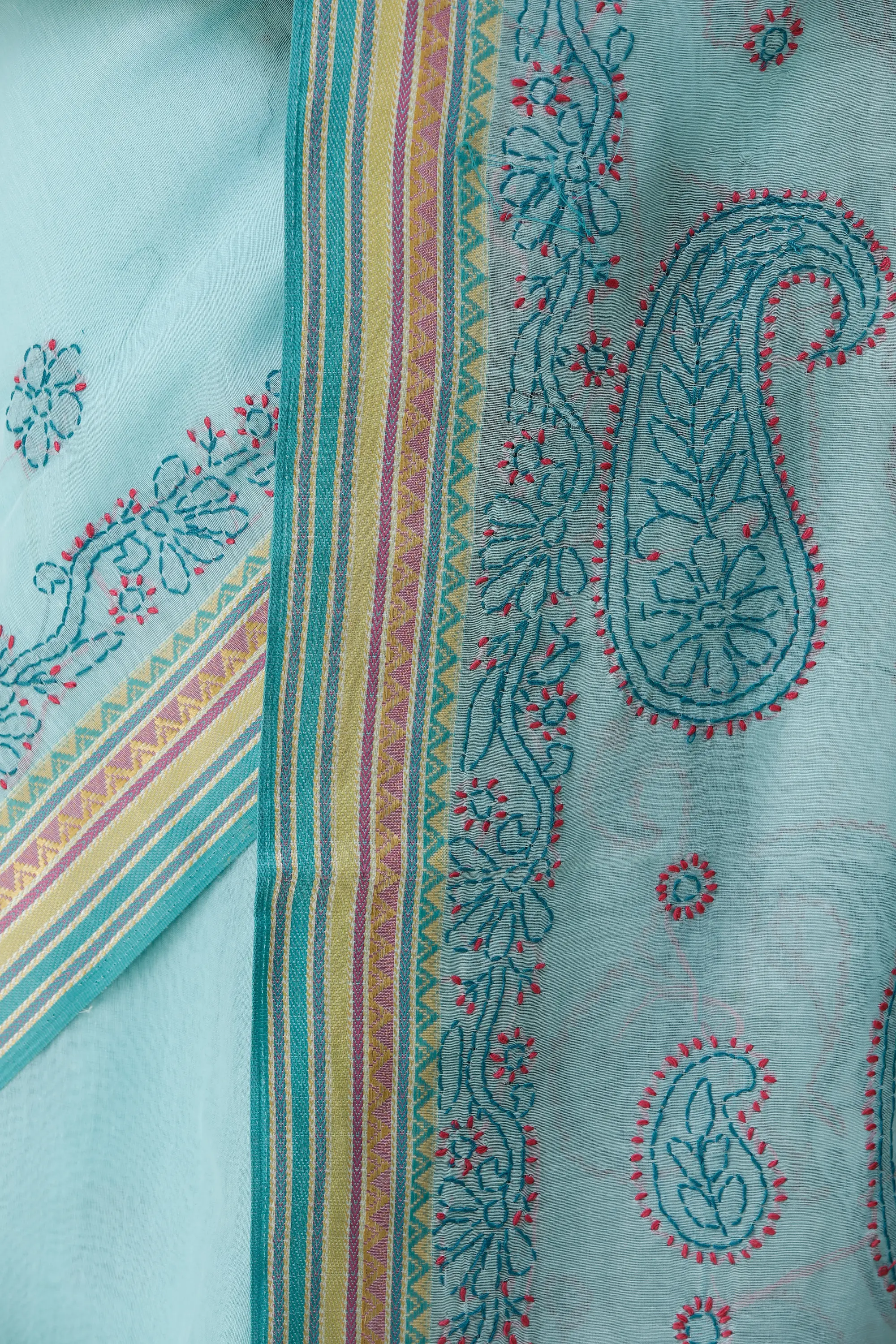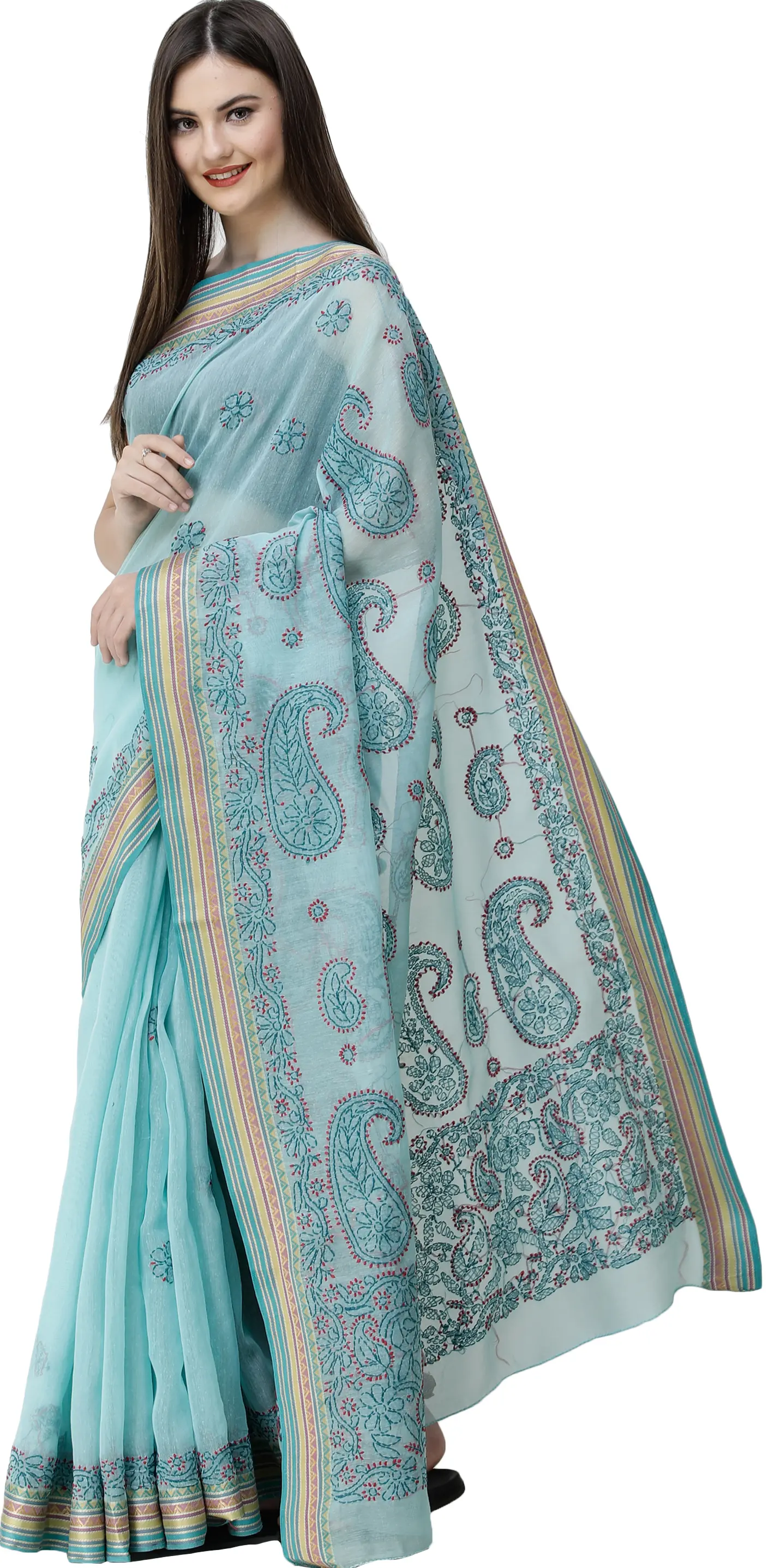 Blue-Tint Lukhnavi Chikan Sari from Lucknow with Hand-Embroidered Paisleys and Woven Border