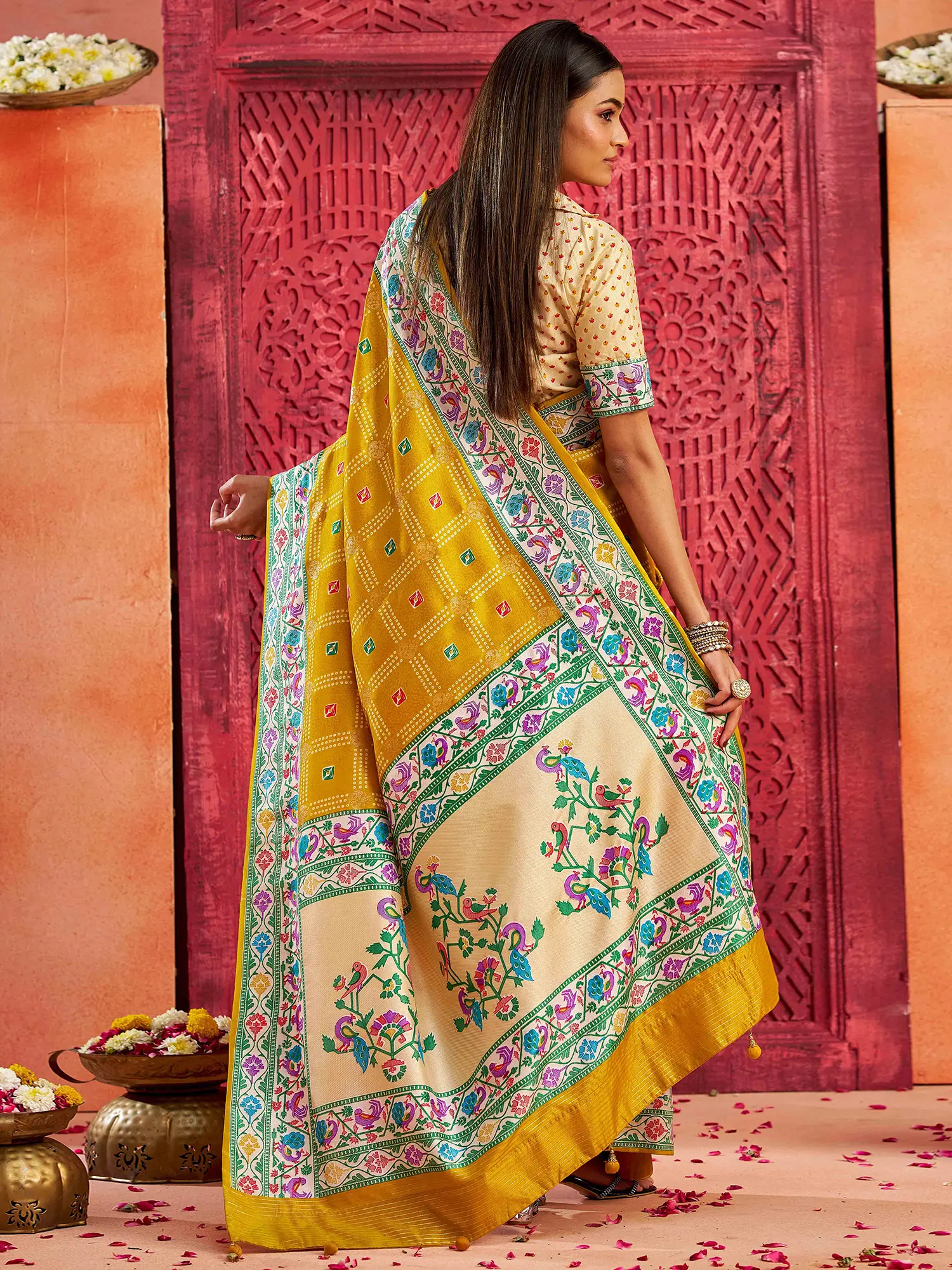 This piece draws inspiration from the rich textile traditions of India, particularly the revered Paithani weaving style, known for its vibrant colours and intricate motifs. The ghatchola print further connects you to a legacy of exquisite craftsmanship that has adorned royalty and discerning individuals for centuries. Wearing this garment is an act of embracing and celebrating this profound cultural heritage, carrying forward a lineage of beauty and artistry.