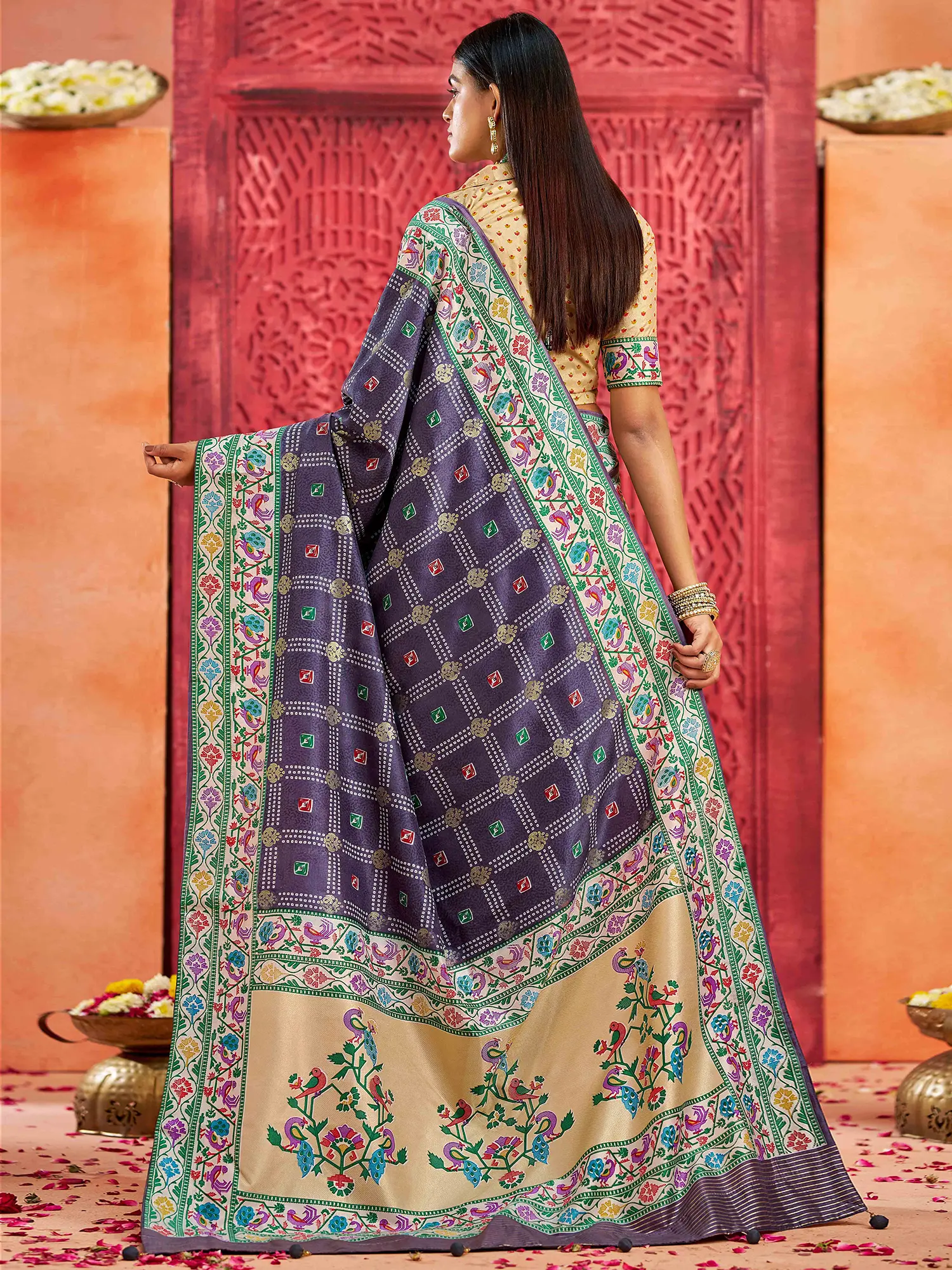 The deep, captivating hue of the velvet tussar silk serves as a rich backdrop, exuding a sense of understated drama. You'll be captivated by the Paithani pallu, a breathtaking masterpiece adorned with motifs that sing of nature and artistry. The allover ghatchola print introduces a playful yet refined geometric charm, each detail thoughtfully placed to create a harmonious visual narrative. The detailed border, with its symphony of colours and intricate patterns, frames the entire creation, ensuring every angle is a delight to behold.