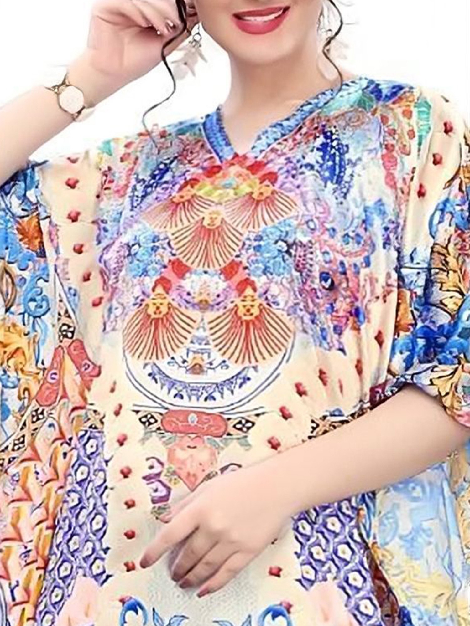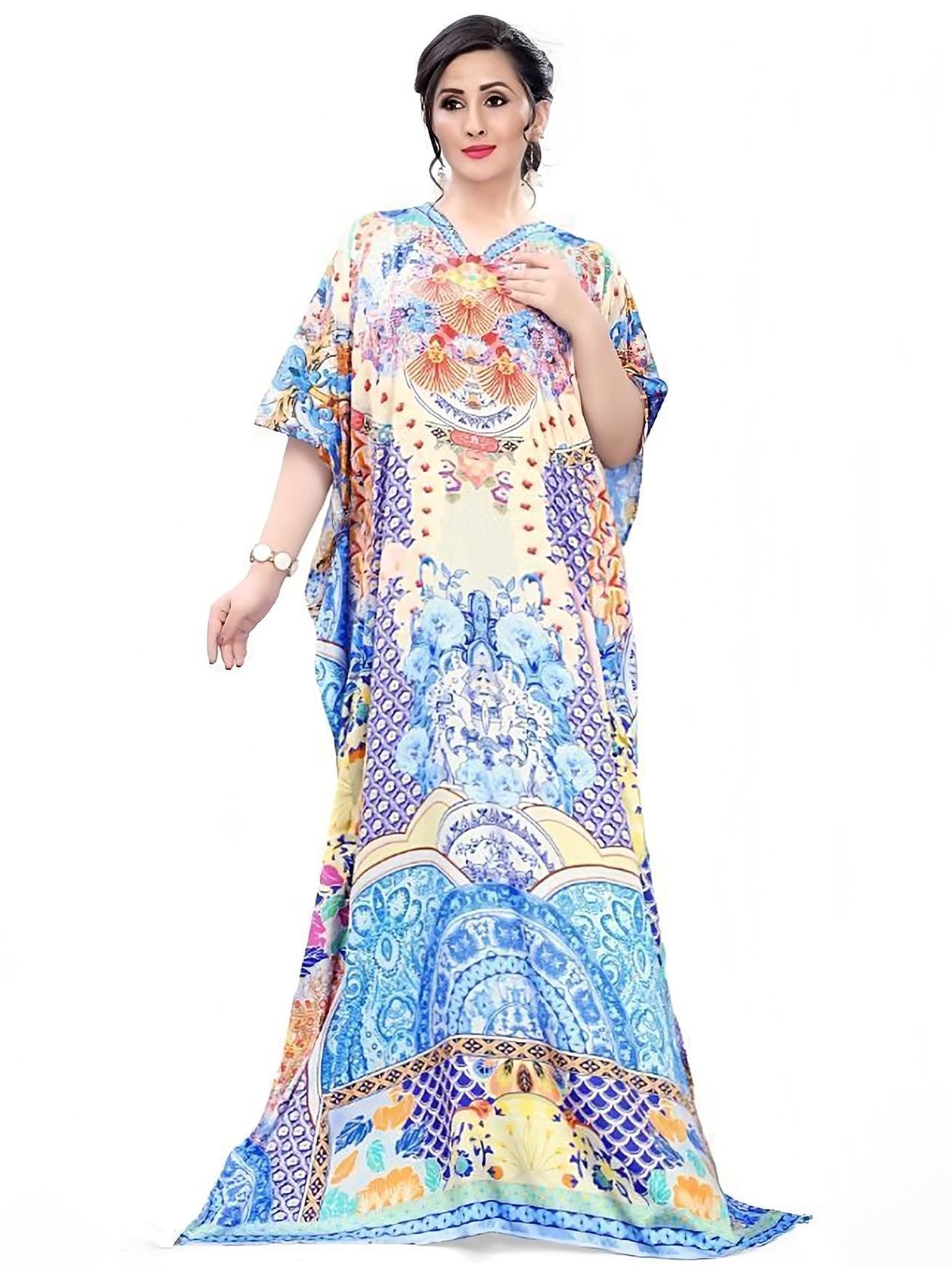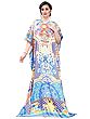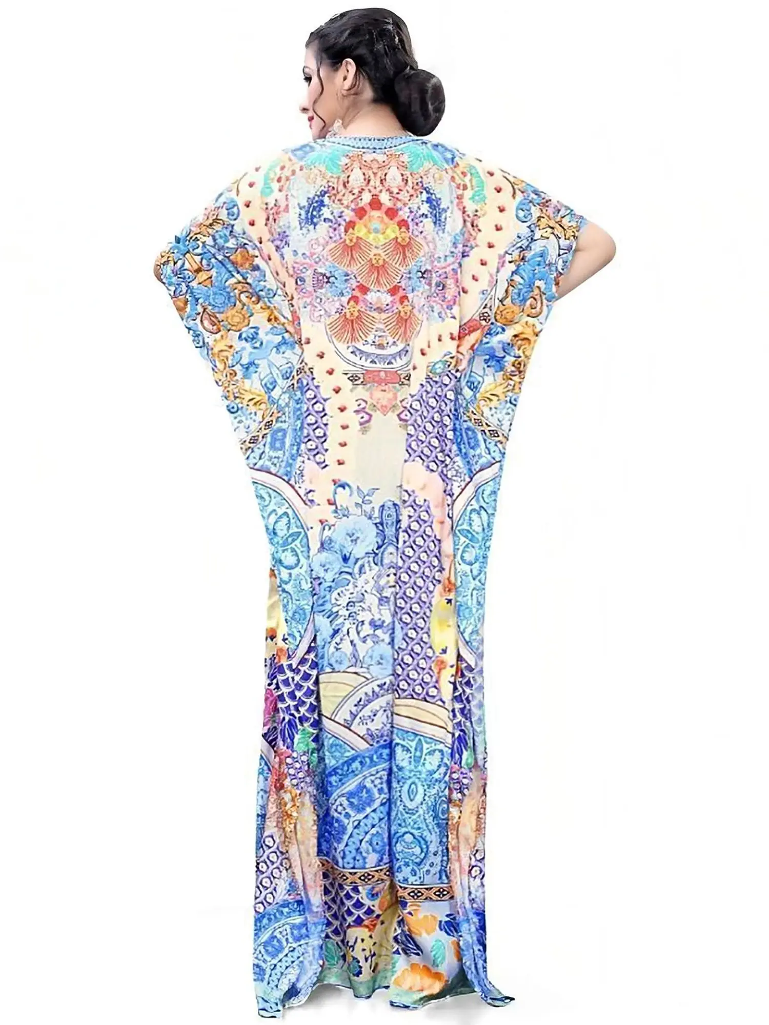 Long Printed Kaftan with Printed Colorful Florals and Elephants