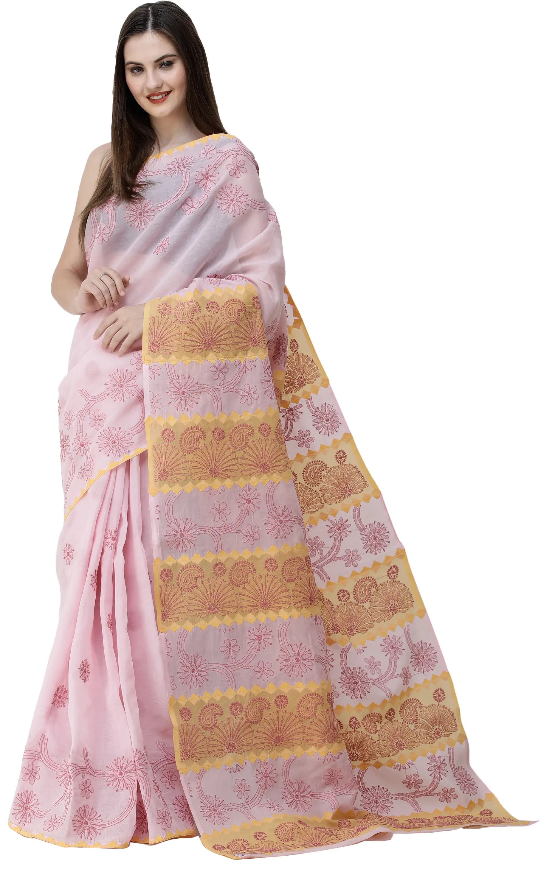 Embrace timeless elegance with this exquisite pure cotton saree, a testament to the rich heritage of Lucknowi Chikan embroidery. The delicate blush pink hue serves as a canvas for an intricate dance of hand-embroidered paisleys and floral motifs. Each stitch tells a story of skilled craftsmanship, passed down through generations, infusing the fabric with a unique soul and character.