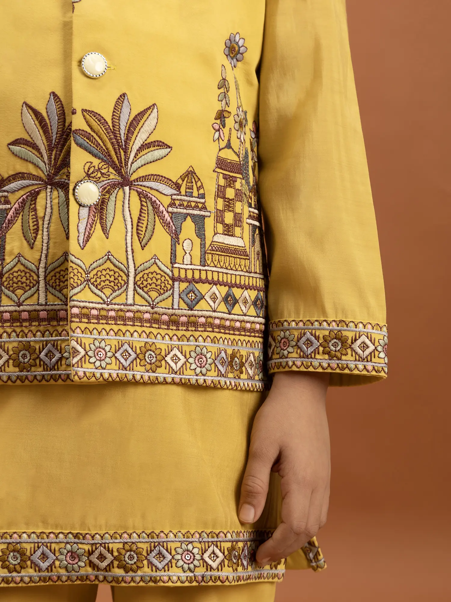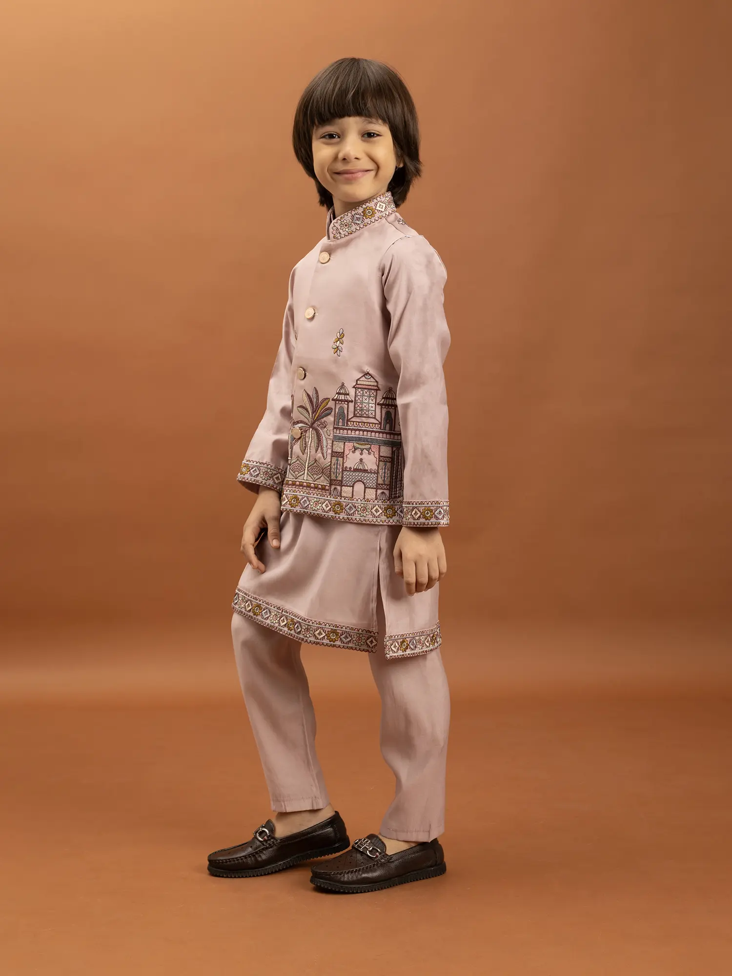 The accompanying kurta is designed with simplicity and comfort in mind, allowing the embroidered jacket to take center stage. Made from the same soft viscose silk, it provides a comfortable base layer. The sleeves and hem of the kurta are subtly accented with a coordinating embroidered border, mirroring the rich detailing of the jacket and creating a cohesive look. The trousers are tailored for a neat and comfortable fit, ensuring ease of movement for active young boys. This thoughtful combination ensures that your child looks his absolute best while remaining at ease throughout any occasion.