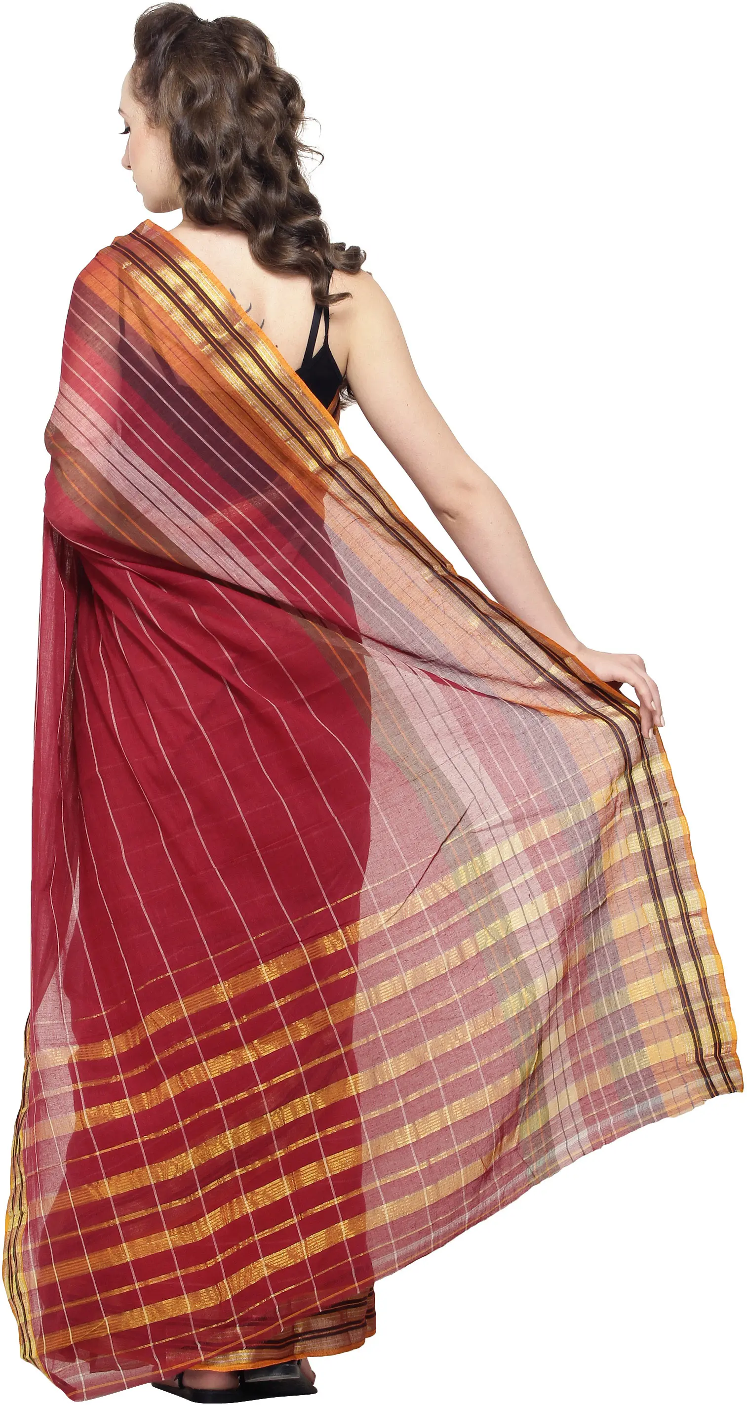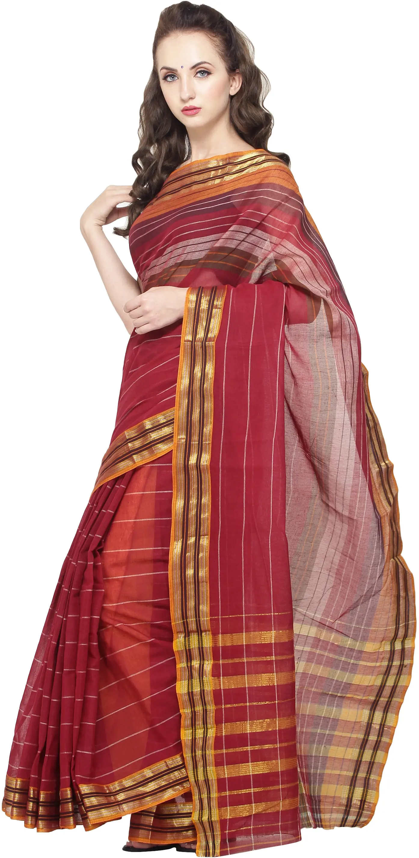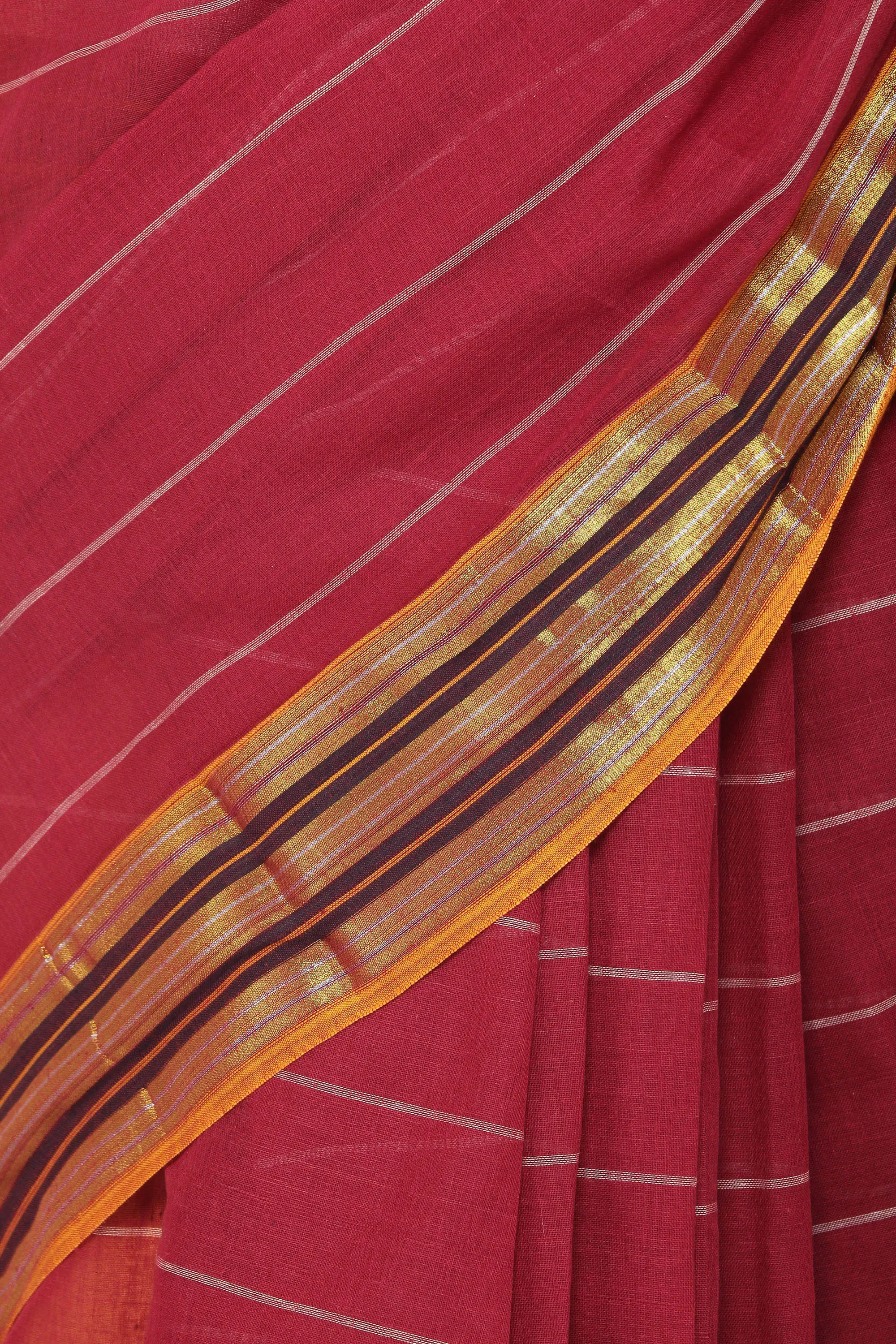 Brick-Red Mrignayani Sari from Andhra Pradesh with Zari Border and Stripes