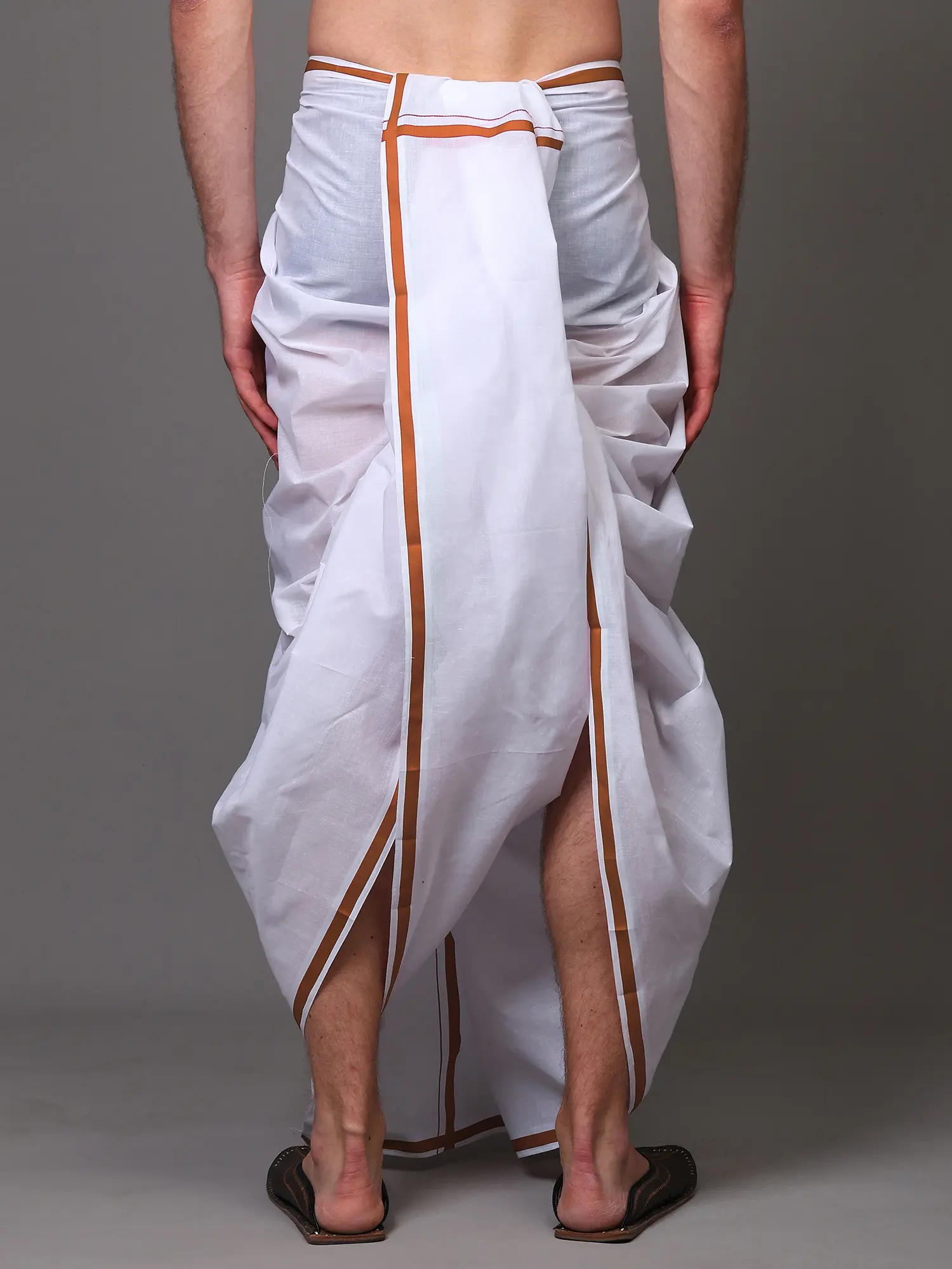 The striking woven border, featuring a subtle yet elegant design, elevates this dhoti beyond a simple garment. This intricate detail provides a focal point and a touch of regal charm, ensuring you stand out with grace. The classic draping style allows for freedom of movement and a comfortable, relaxed fit, embodying a sense of effortless style. Whether you are attending a traditional ceremony, a festive gathering, or simply seeking comfortable everyday wear, this dhoti is a versatile choice that exudes cultural heritage and refined taste.