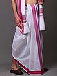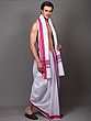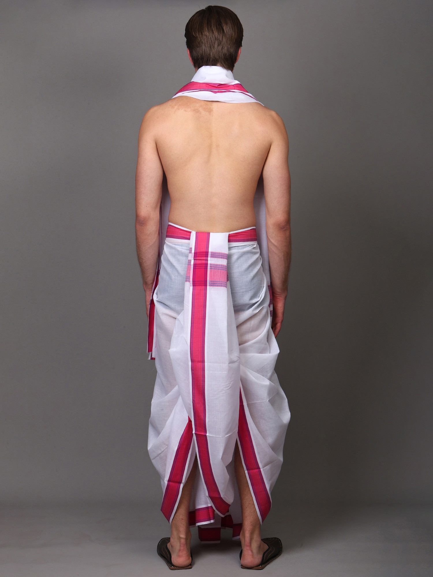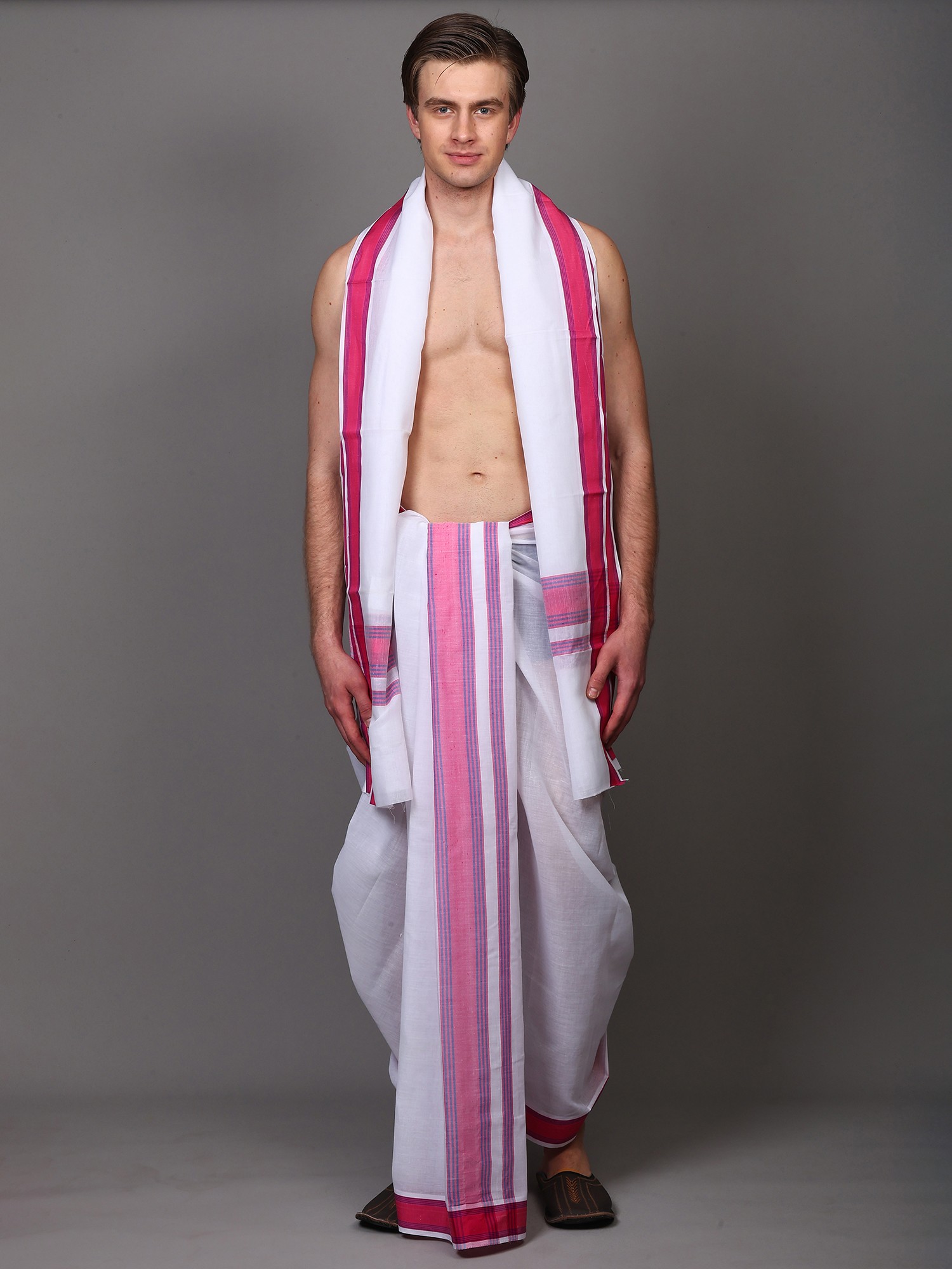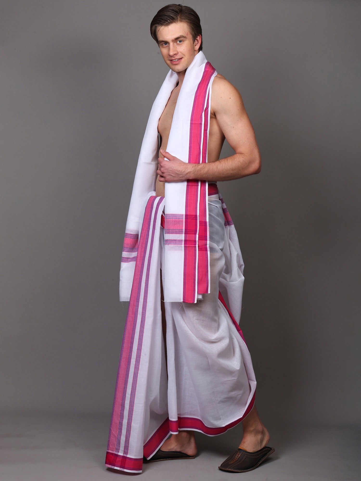 Bright-White Cotton Traditional Dhoti with Angavastram Set and Contrast Pink Border
