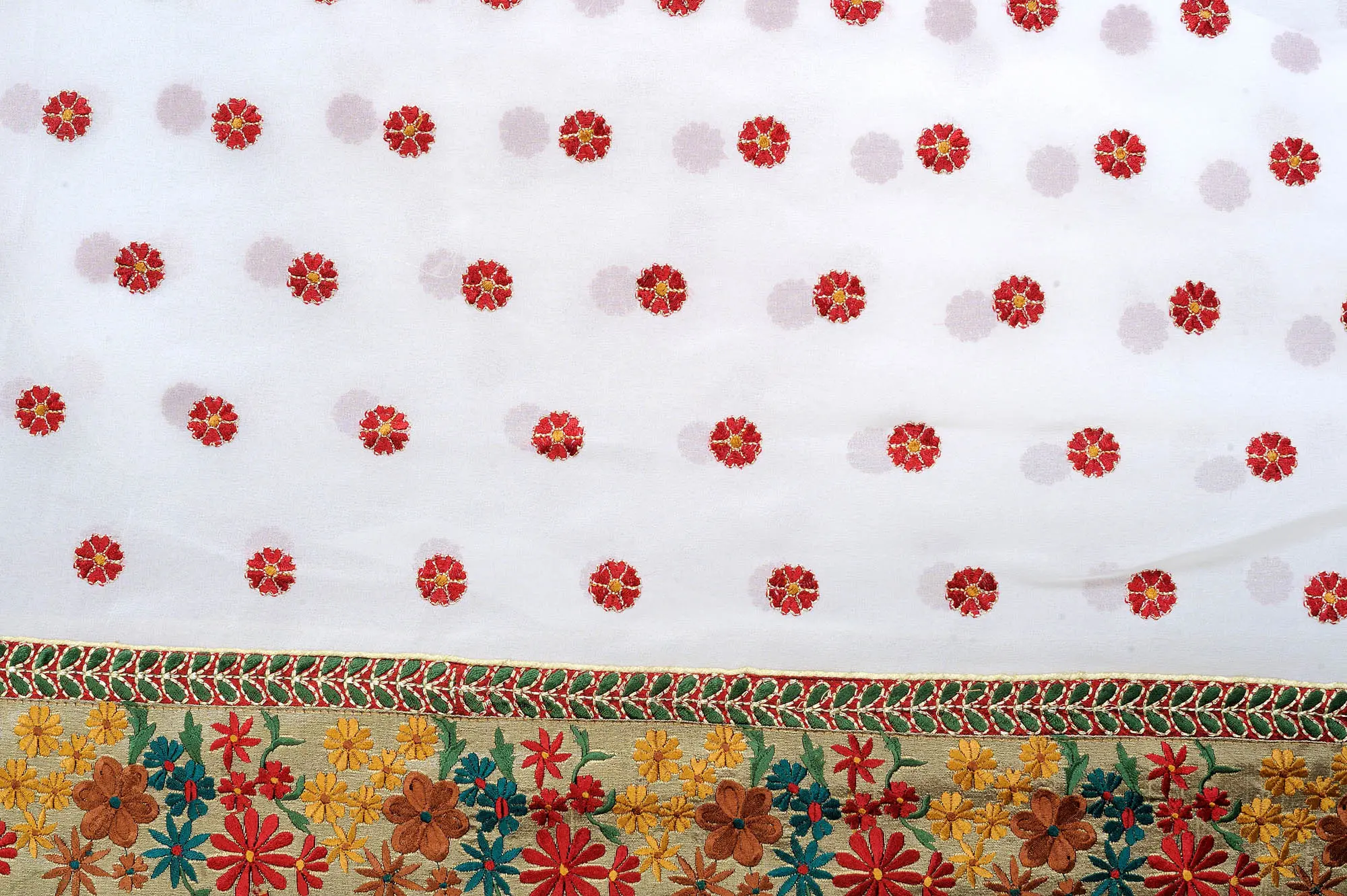 Lucent-White Georgette Saree with Aari Embroidered Floral Motifs from Kashmir