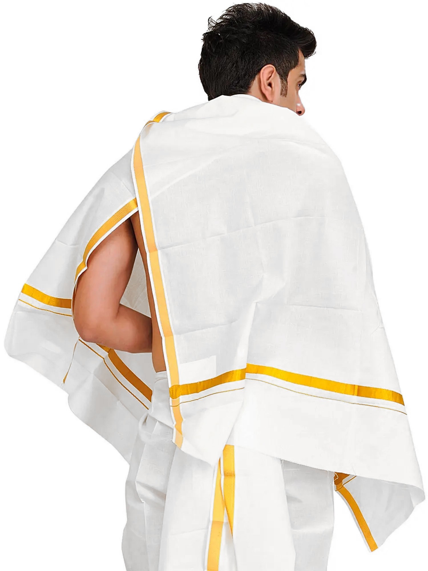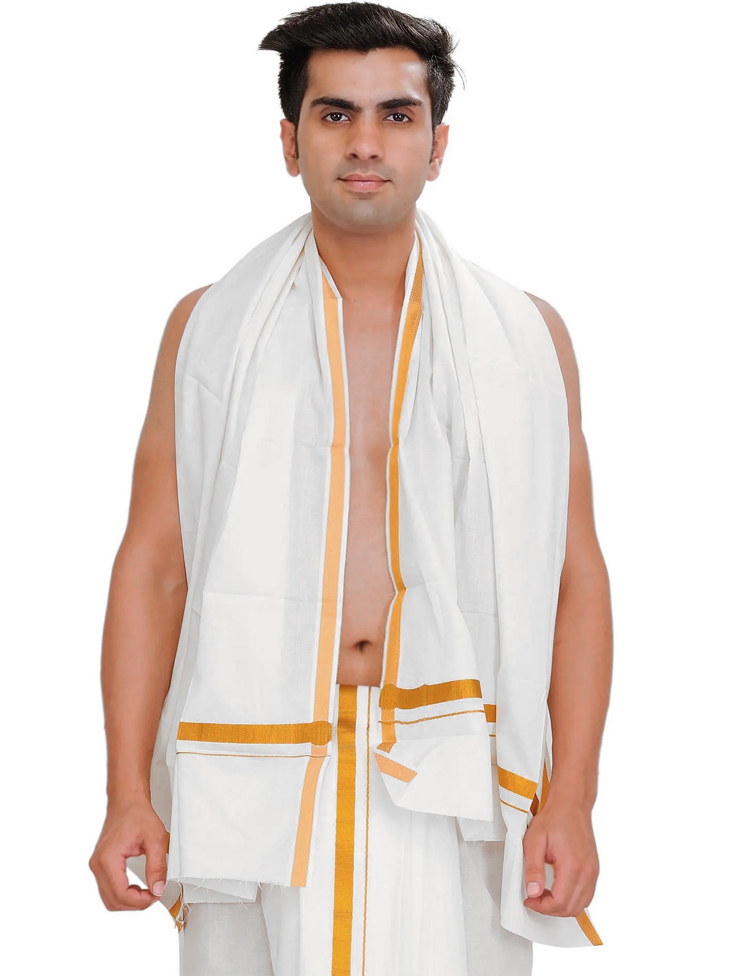 Adorned with a mesmerizing “Zari Woven Border”, each thread whispers tales of tradition and eternal charm. Cherish its soft embrace, woven from pure cotton, as you envelop yourself in its enchanting allure. Symbolizing purity and grace, this Angavastram transcends mere fabric, embodying centuries of cultural significance.