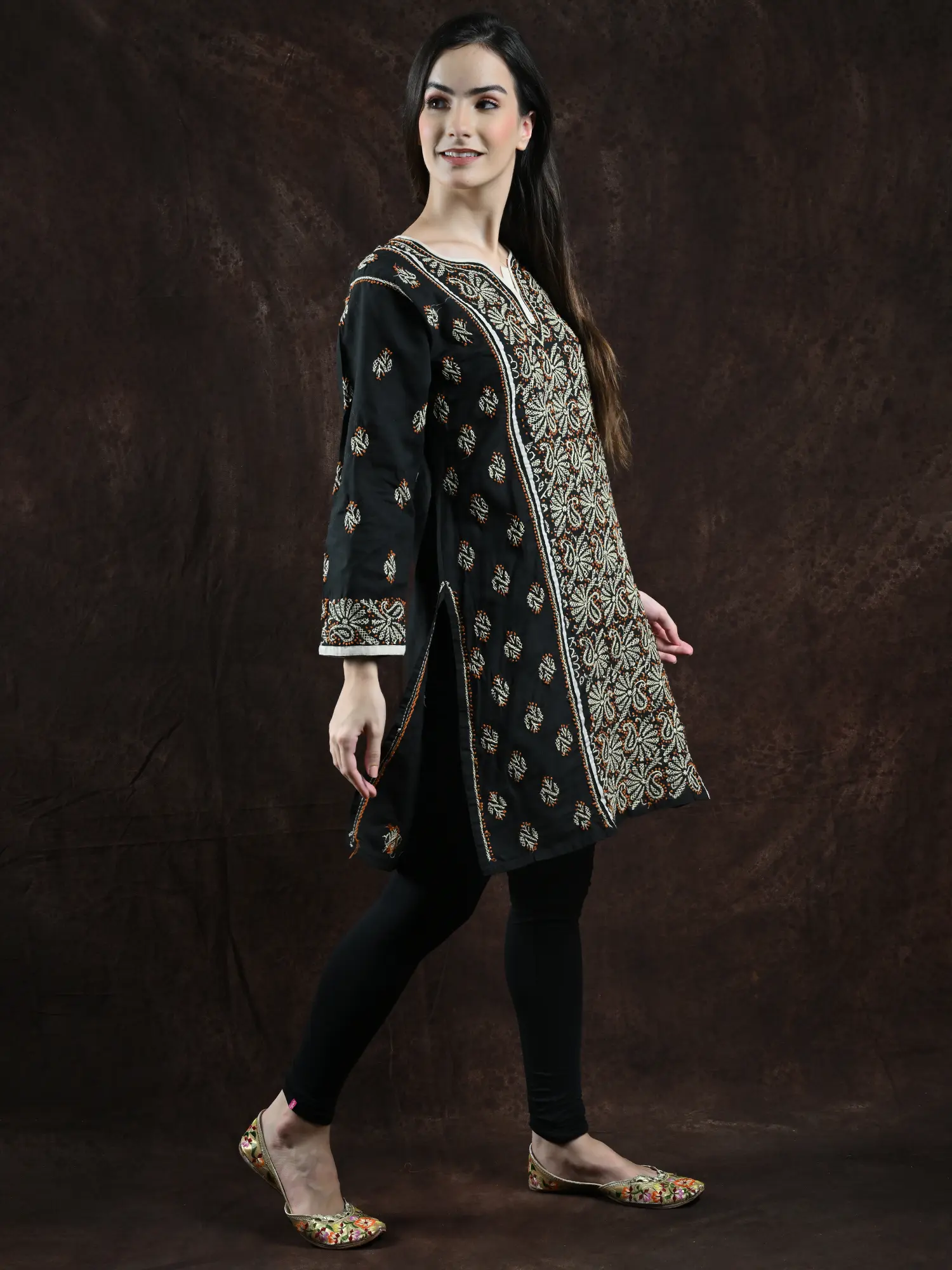 Floral Printed Crepe Short Kurti with Chikankari Embroidery