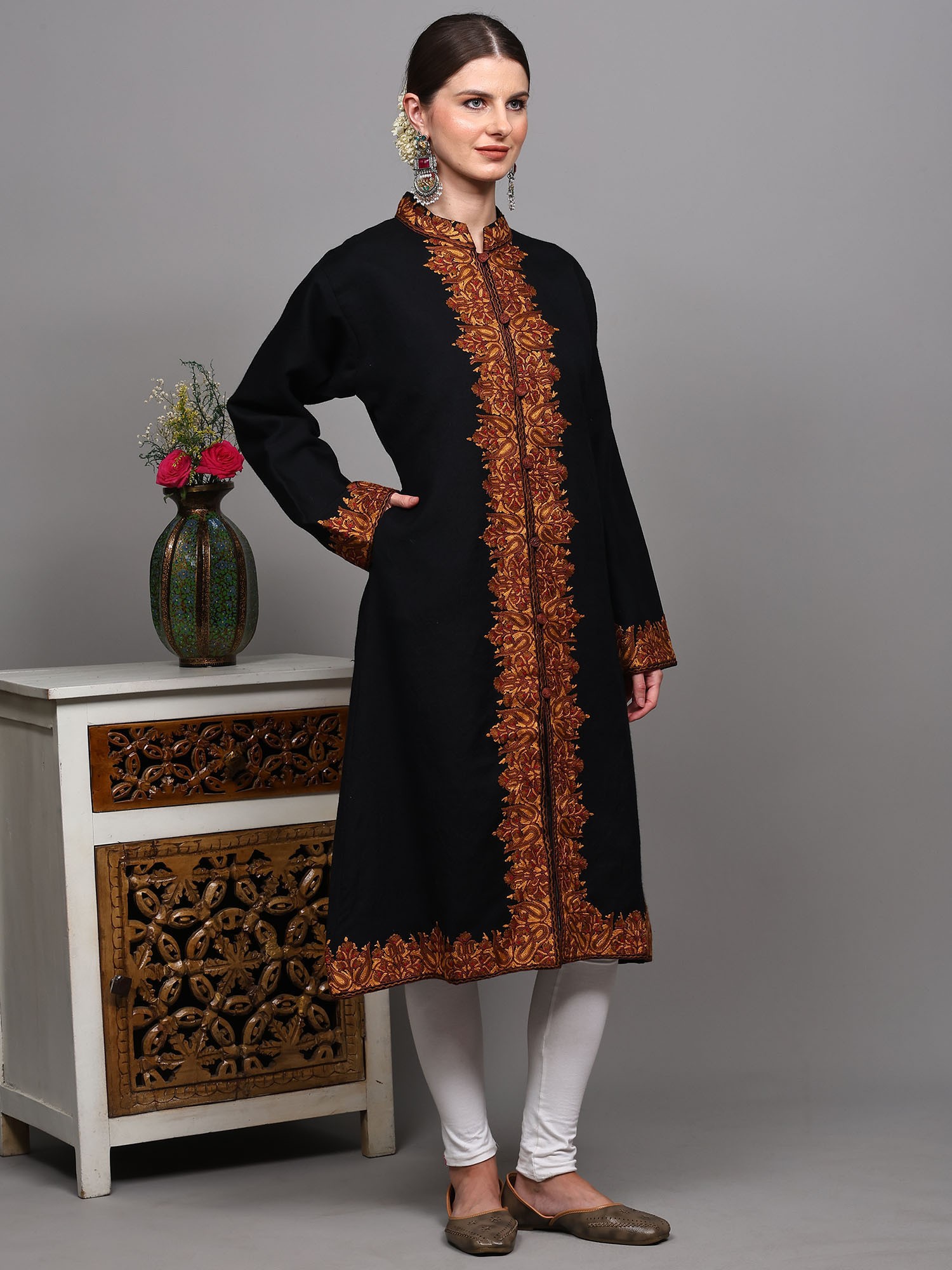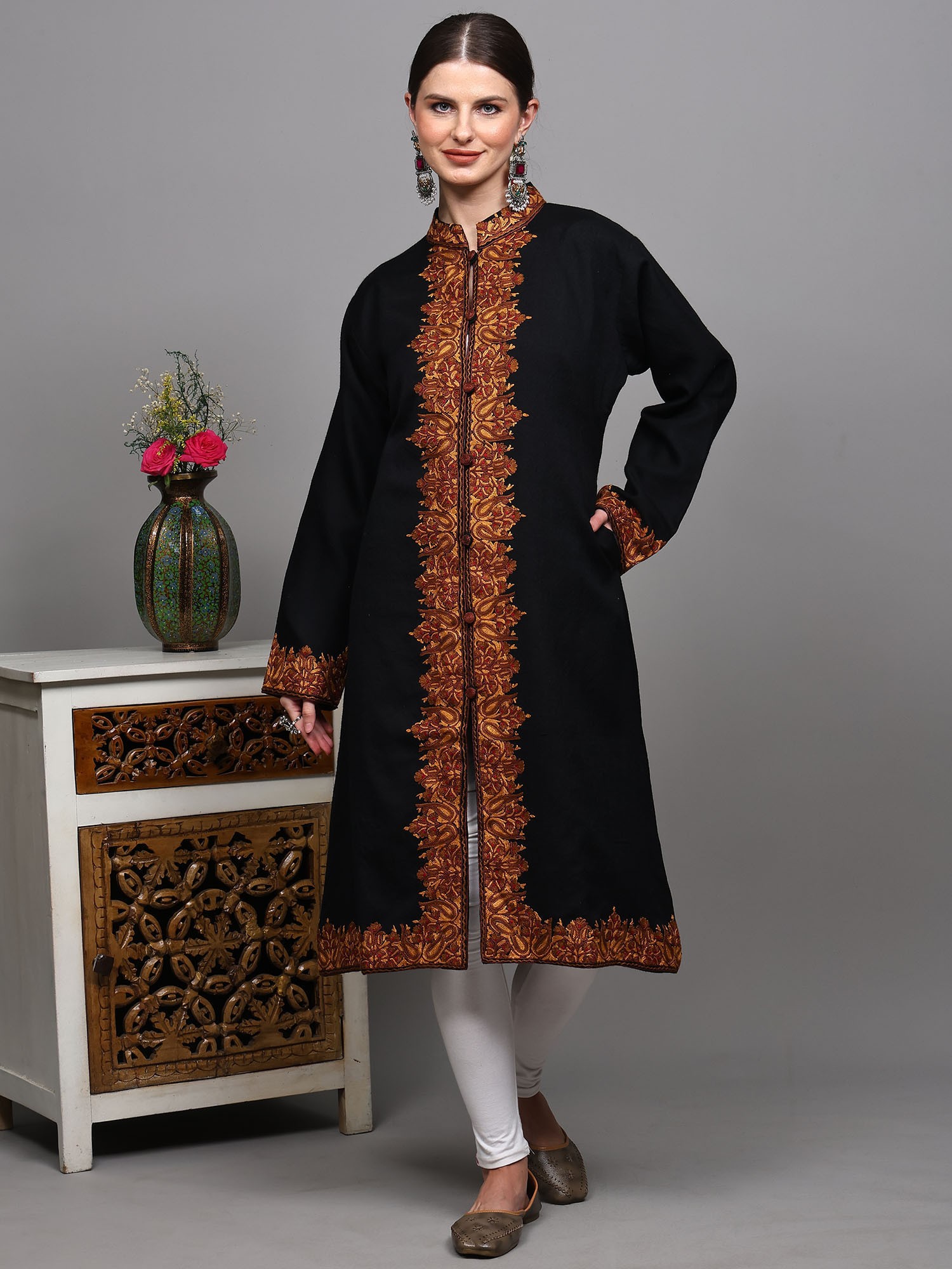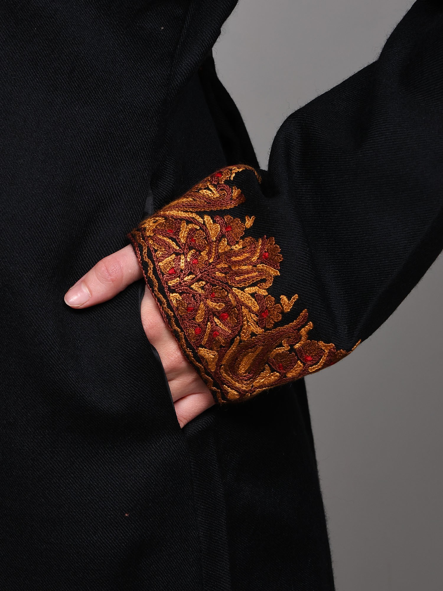 Black-Olive Kashmiri Long Jacket with Aari Embroidered Floral Vines with Side Pockets