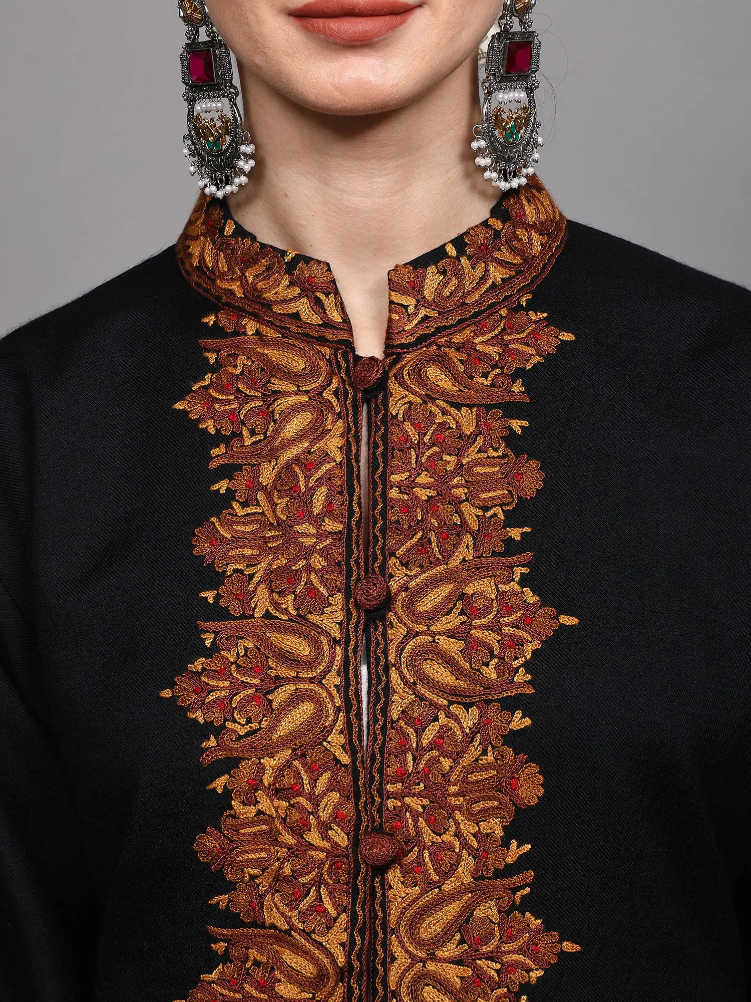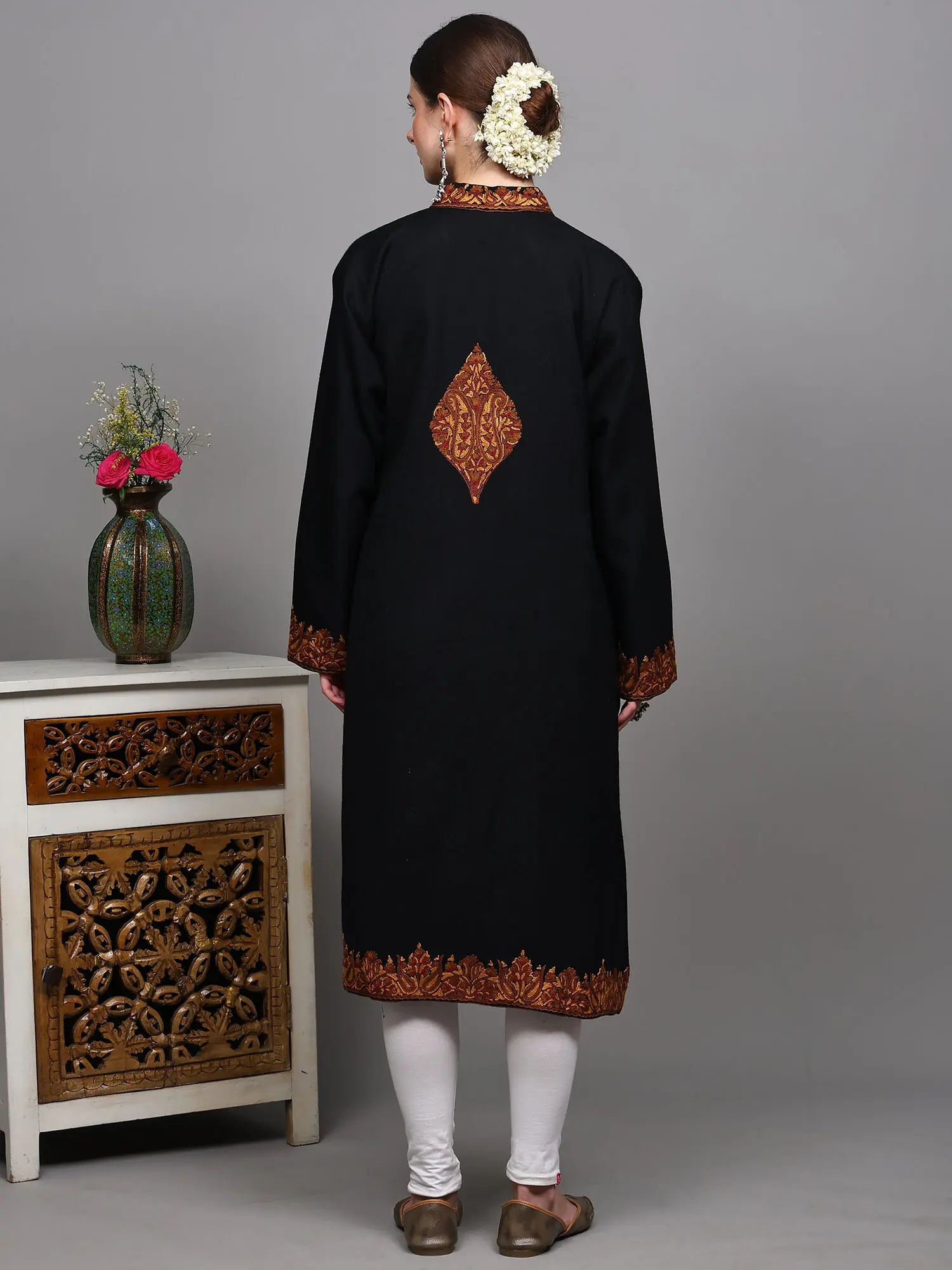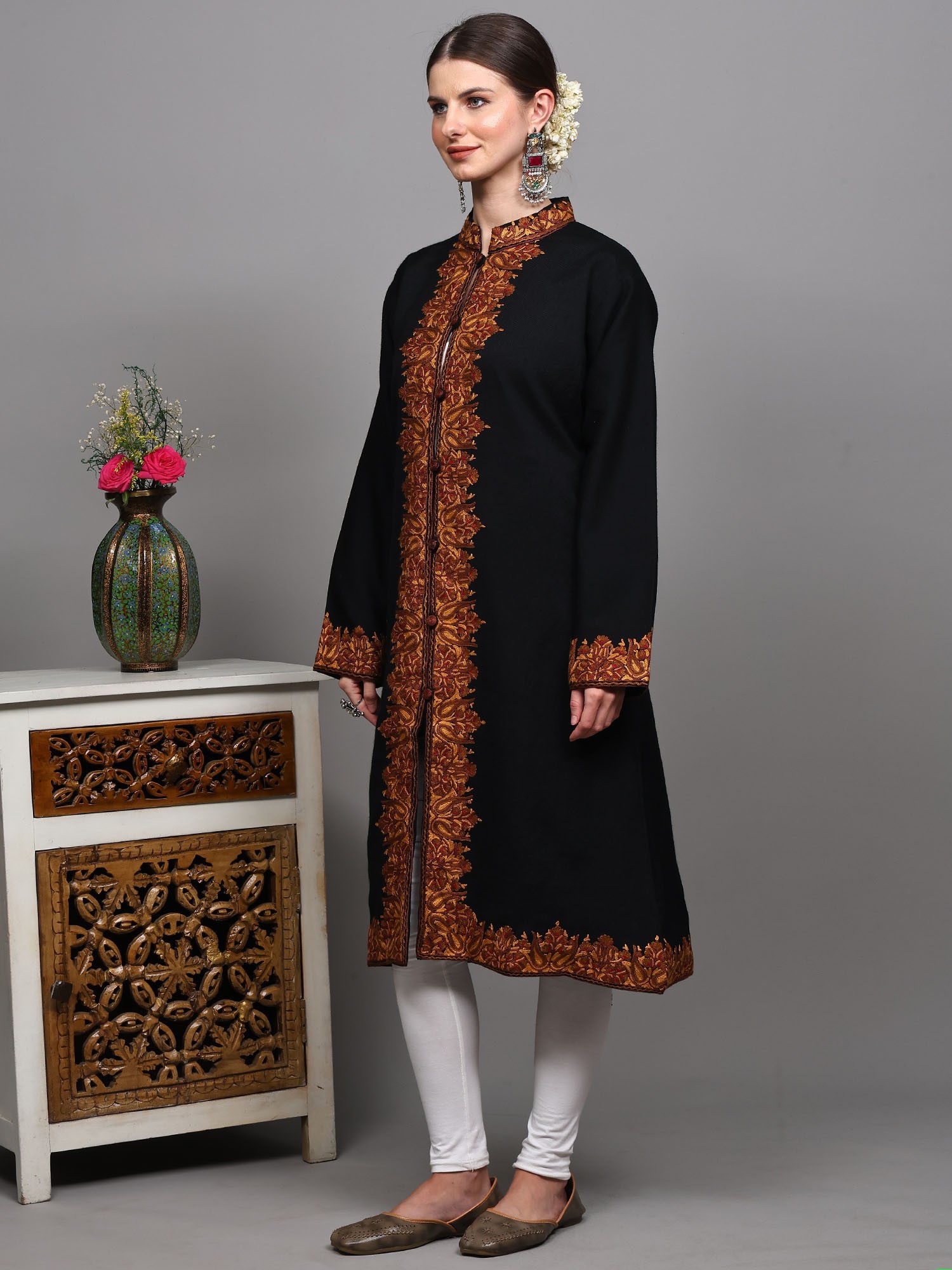 Black-Olive Kashmiri Long Jacket with Aari Embroidered Floral Vines with Side Pockets