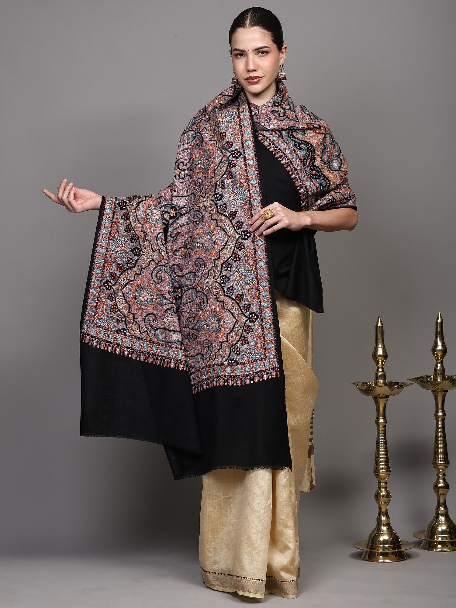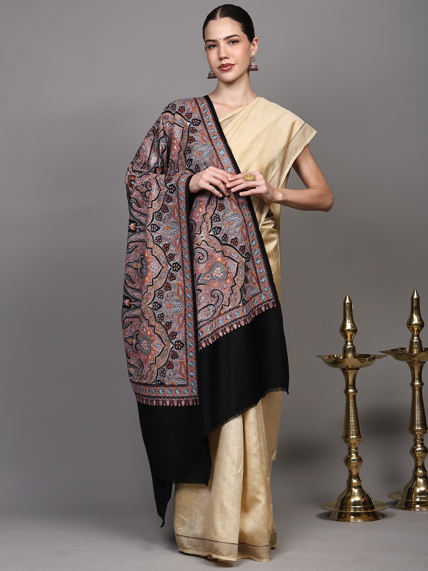 Discover a piece that embodies heritage and artistry with this exquisite wool shawl, originating from the culturally rich city of Amritsar. Crafted with meticulous attention to detail, this shawl is more than just an accessory; it's a wearable masterpiece that speaks of tradition and sophisticated style. The deep, classic black hue serves as a perfect canvas for the vibrant and intricate embroidery that adorns its borders and extends gracefully onto the main body.