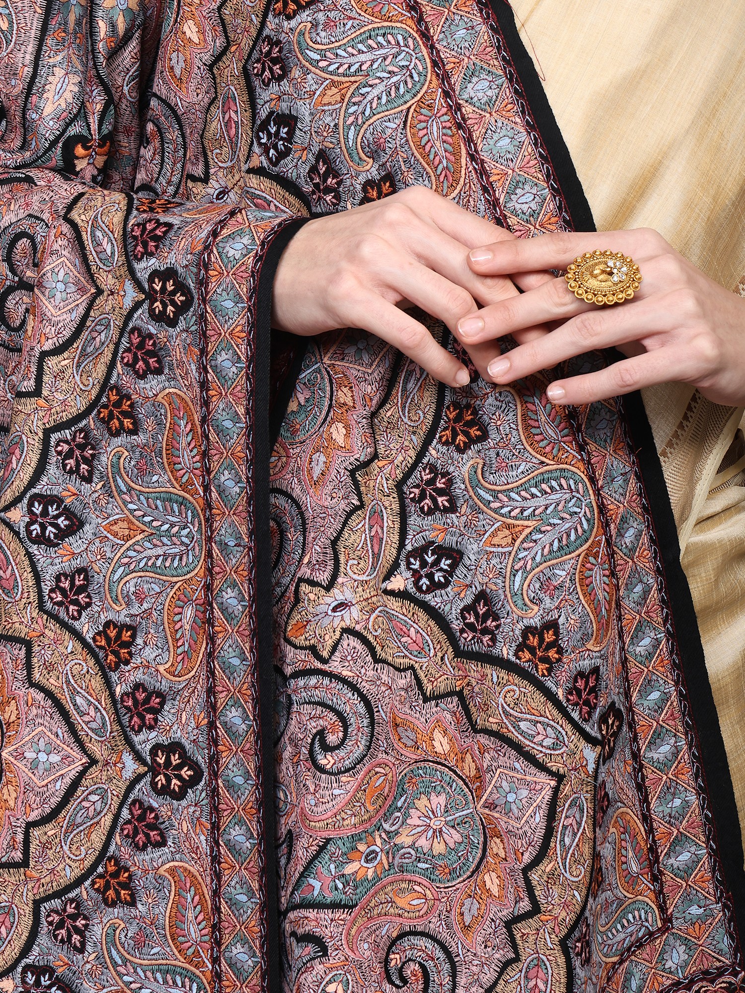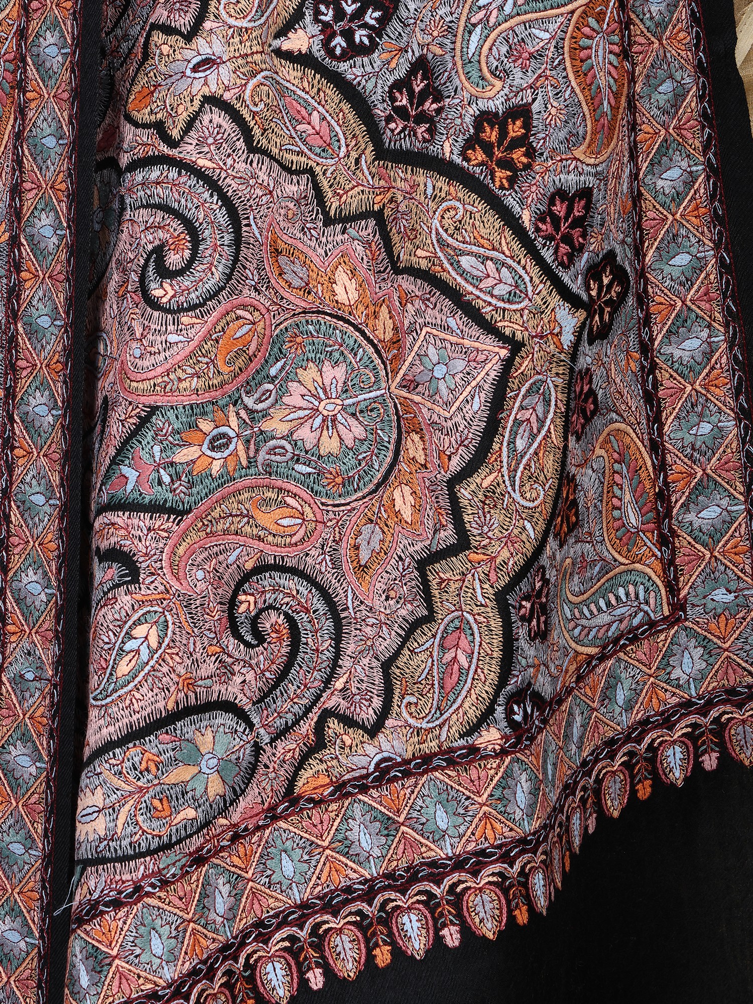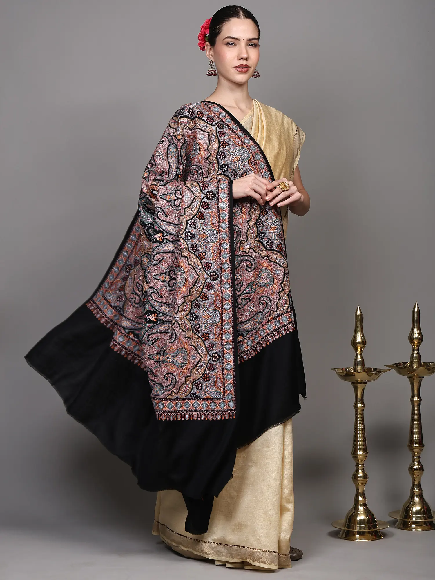 Woolen Detailed Multicolored Floral Jaal Pattern Fine Aari Embroidered Shawl from Kashmir