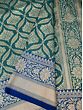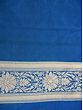 Katan silk fabric and its luxurious weave are given stunning regalia with two complementing tones of blue in this Bristol-Blue Banarasi silk saree, ornamented with exquisite Zari work done in an intricate manner. The Jangla or floral mesh with blooming vegetation grows on the body of the saree, which is outlined by a thin Jhaalar or floral creeper and a row of thick vegetation on the border. The pallu of the saree displays a mesmeric fusion of the two blues, which meet like two oceans, creating a stunning aesthetic effect.