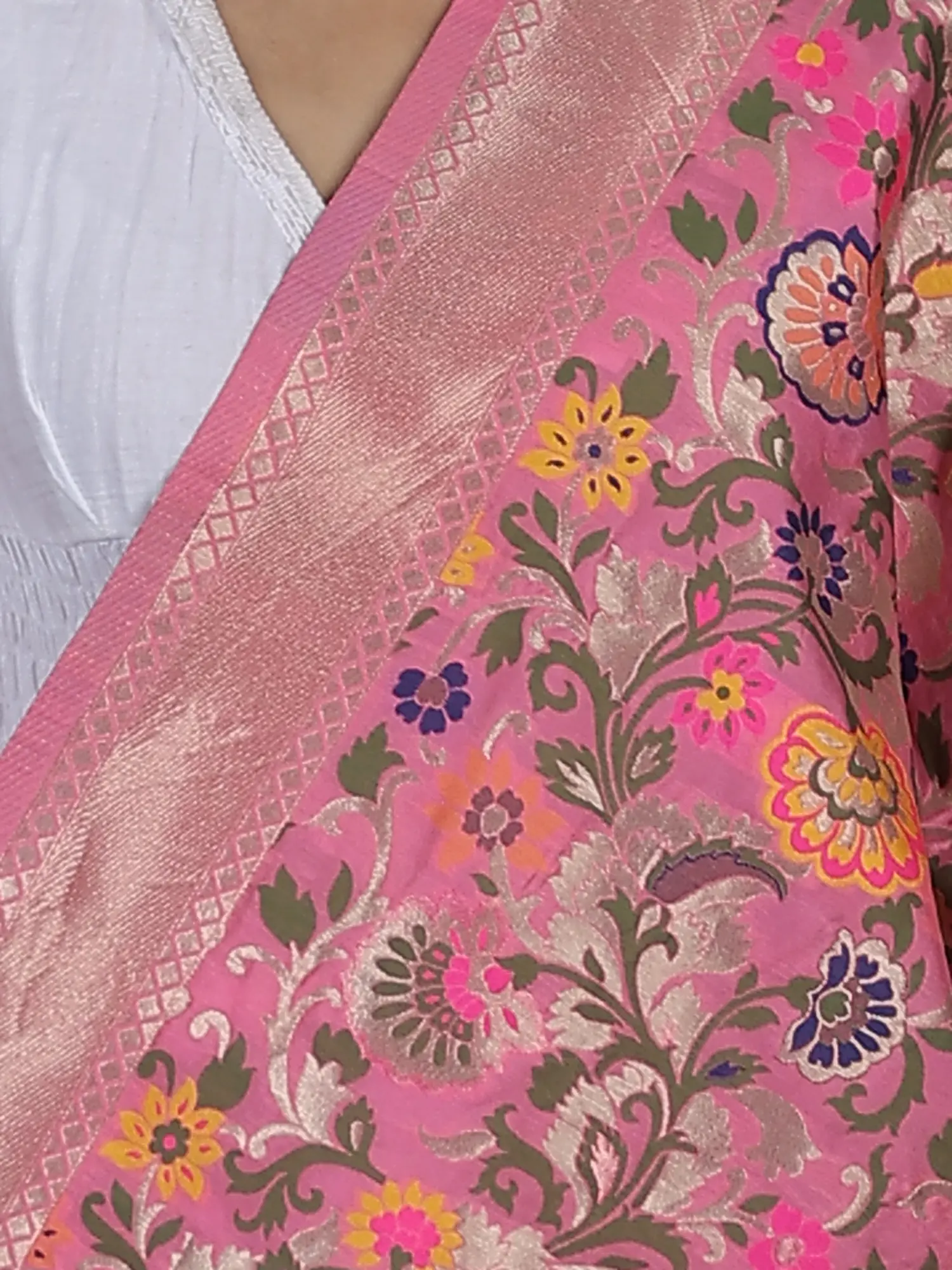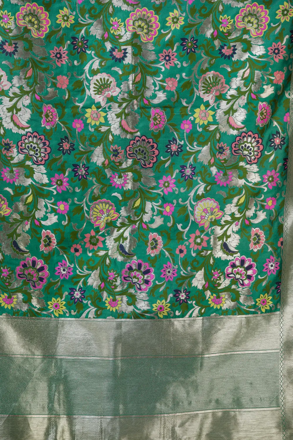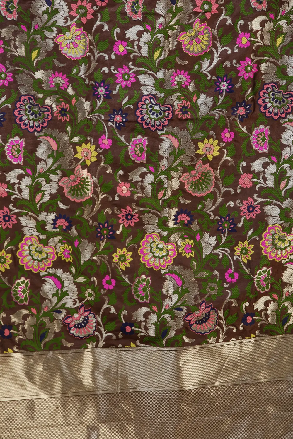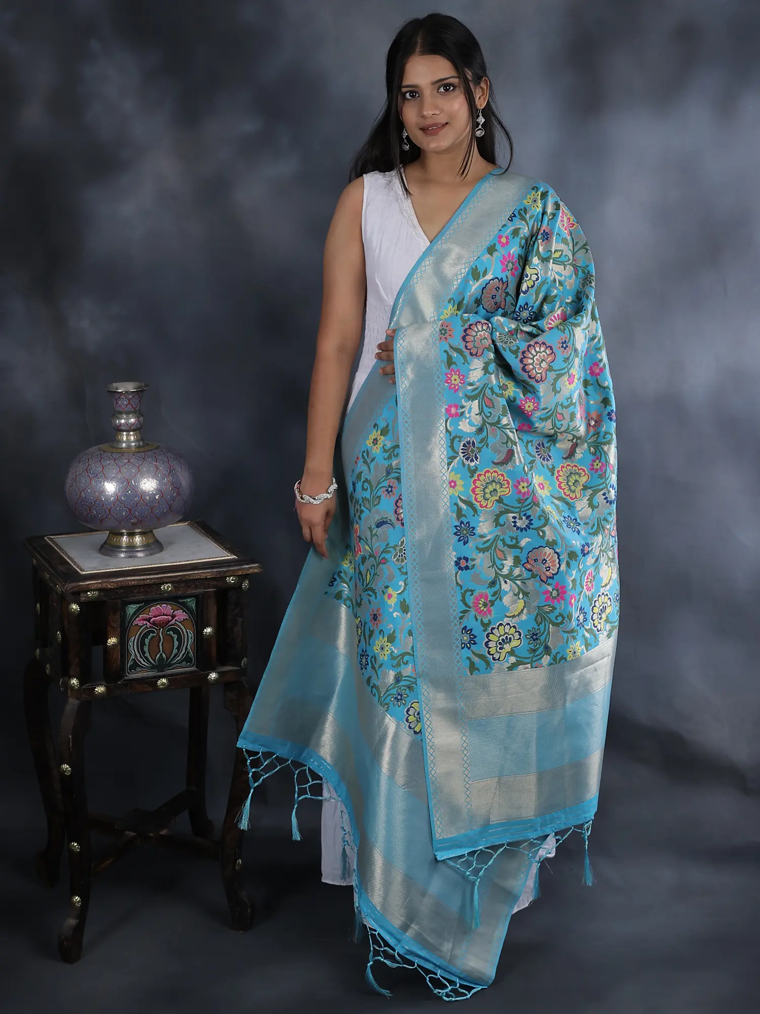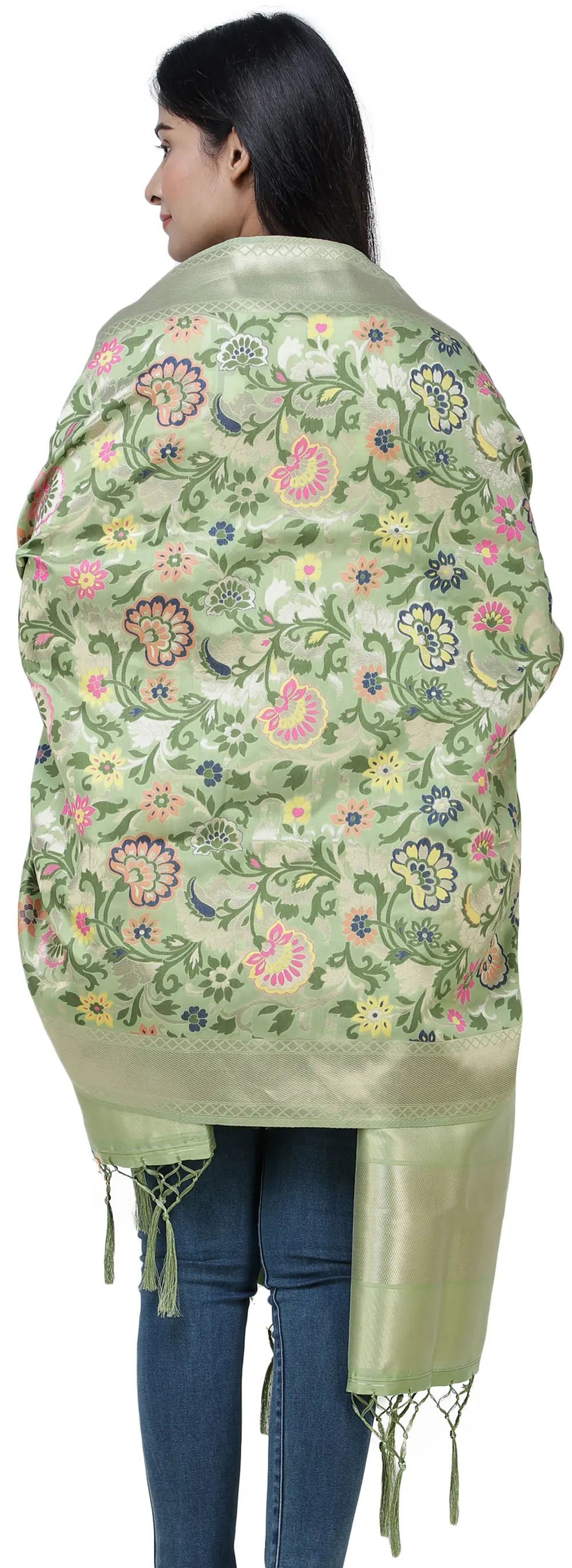 Our Brocade Dupatta from Gujarat with Woven Floral Motifs all over is a vibrant tapestry of culture and creativity. With a pinch of love from rich silk threads, this piece represents the artistry of skilled artisans of Gujarat. Each floral motif is woven meticulously, reflecting the essence of traditional craftsmanship. These designs have a fascinating heritage history, born from the vibrant traditions of Gujarat. Today, they seamlessly blend with contemporary fashion, making this dupatta a style statement. The array of colors used in this masterpiece adds a touch of elegance to any outfit, making it a cherished possession for those who appreciate intricate artistry.