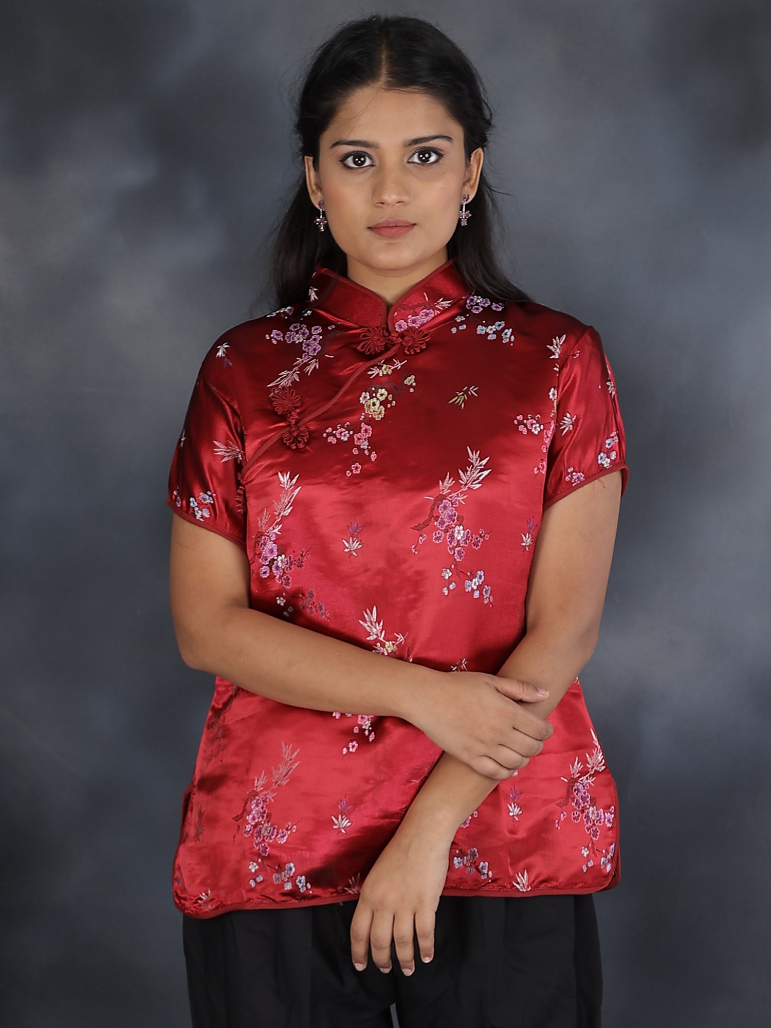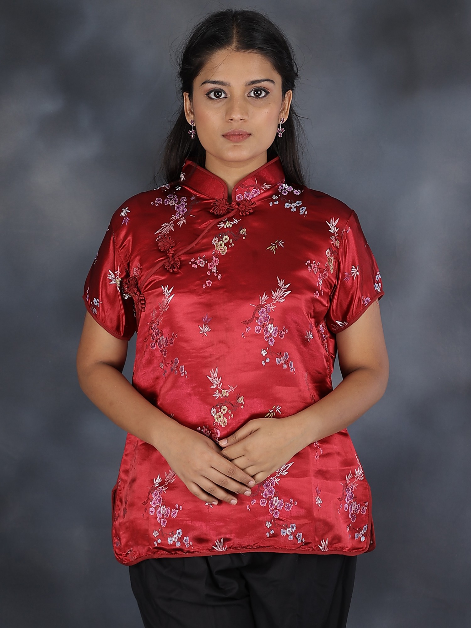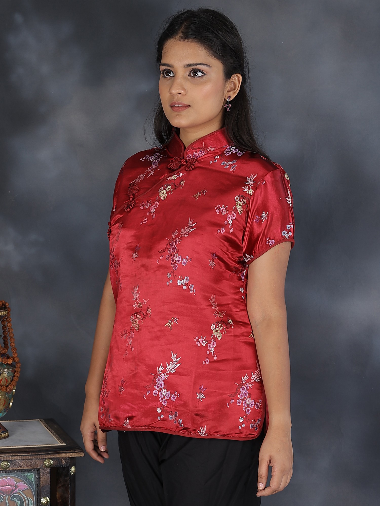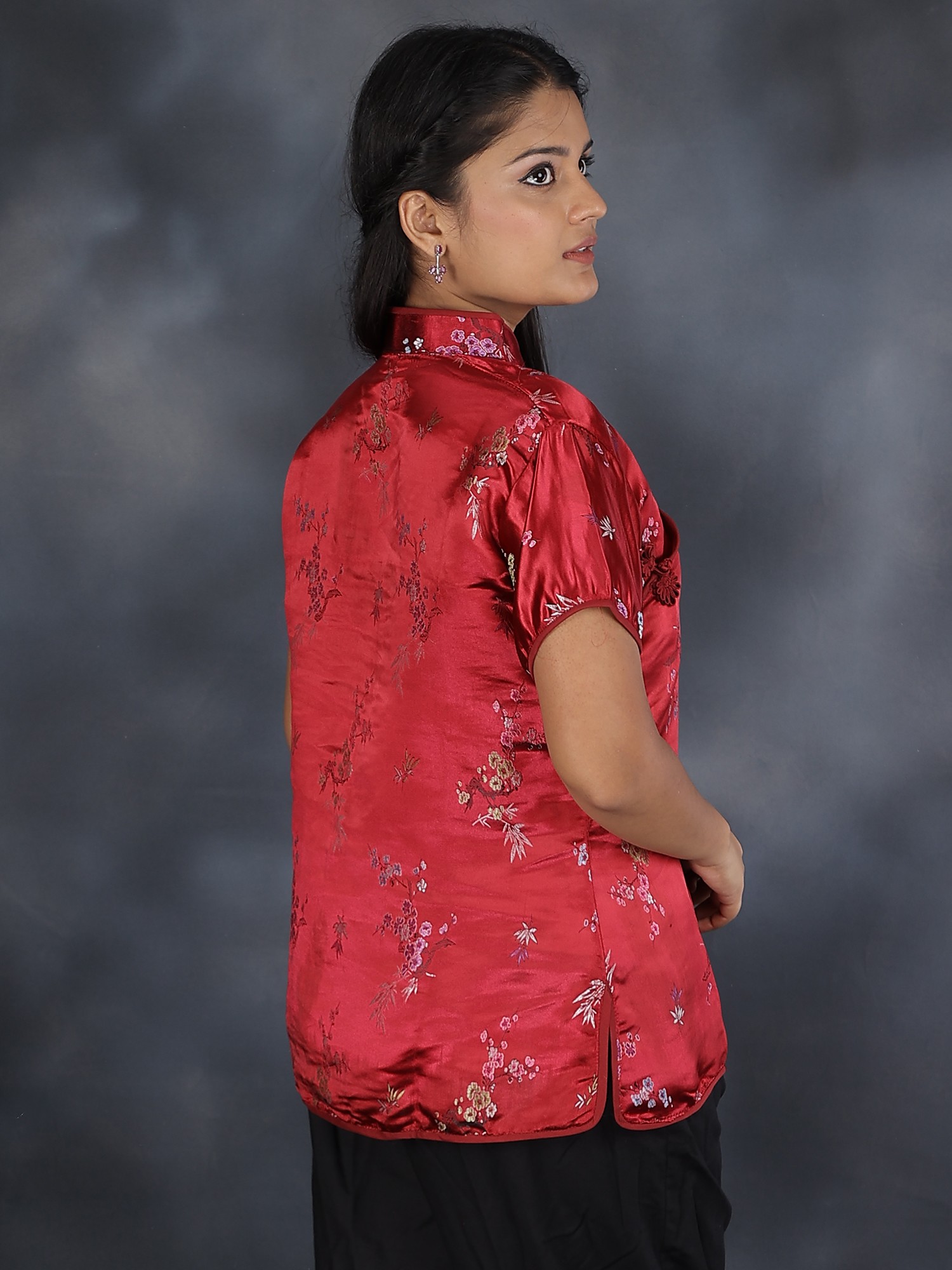 Inspired by the gorgeously fitted Chinese gown of Cheongsam, this brocaded jacket from Sikkim offers you a graceful and trimmed appeal. The art silk fabric makes the jacket a thing of regal beauty, adorned with brocade weave which is synonymous in Indian culture and world with an elite fashion. Available in fashionable variants, this Cheongsam jacket is a charming way to appear effortlessly classy.