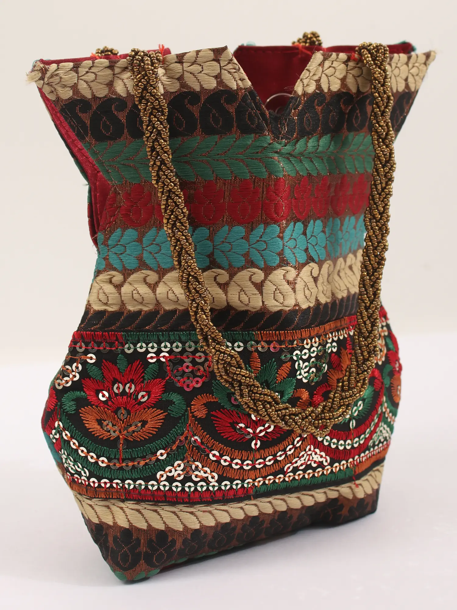 Perfect for special occasions or elevating everyday glamour, this effortlessly complements your style while carrying your essentials with finesse. This opulent accessory feature paisley motifs and shimmering sequin embroidery on luxurious art silk, adding a touch of regal charm to any ensemble.
