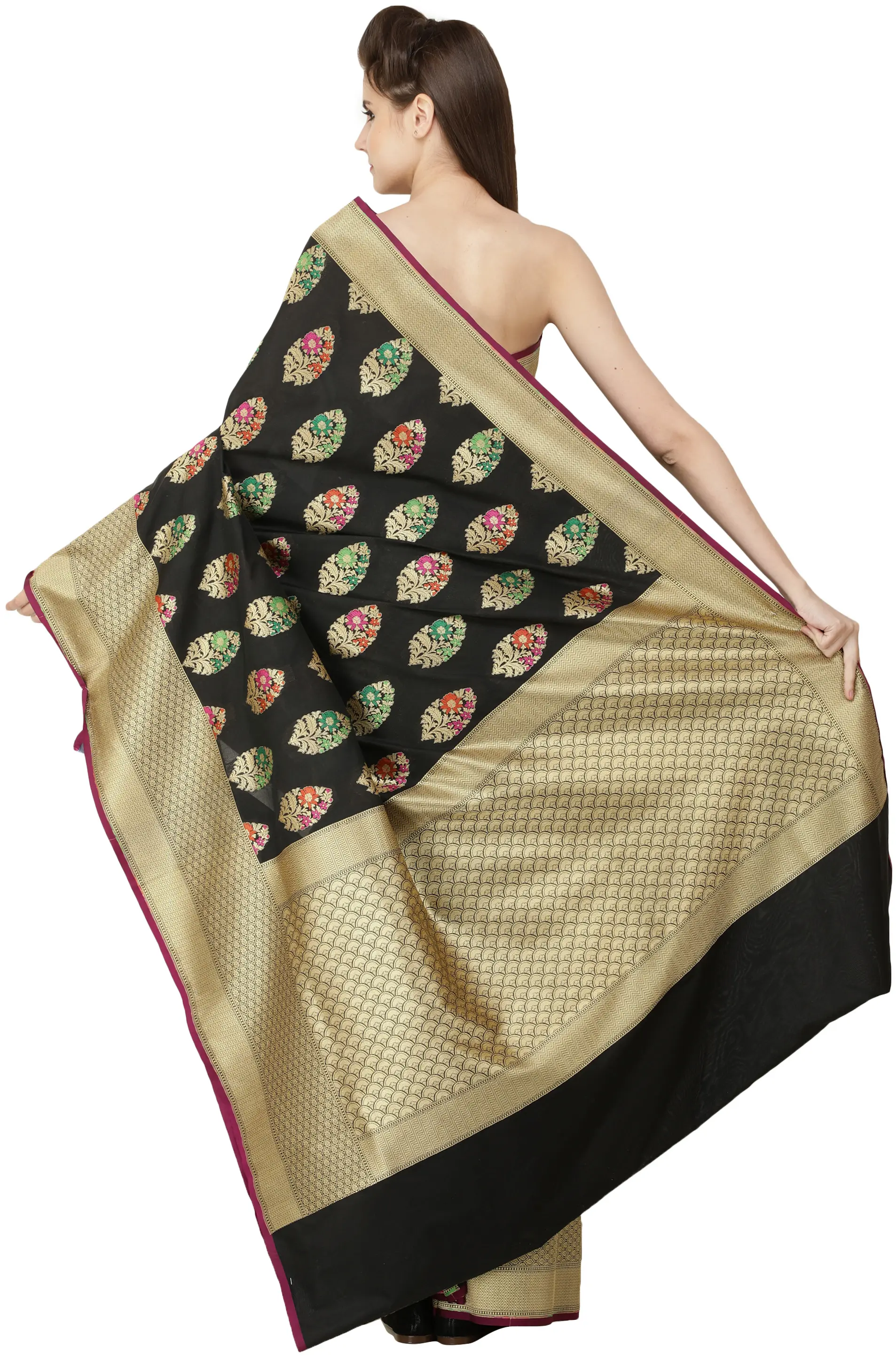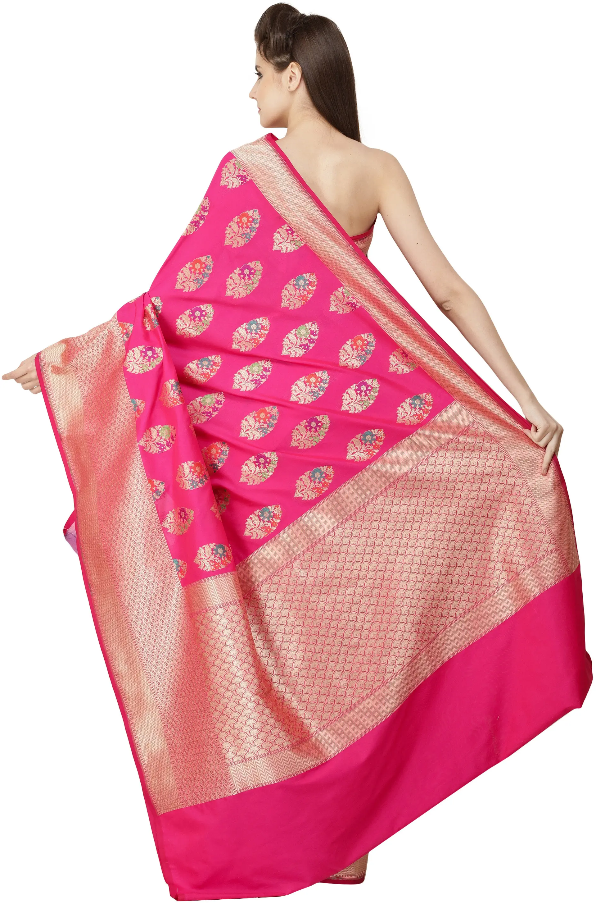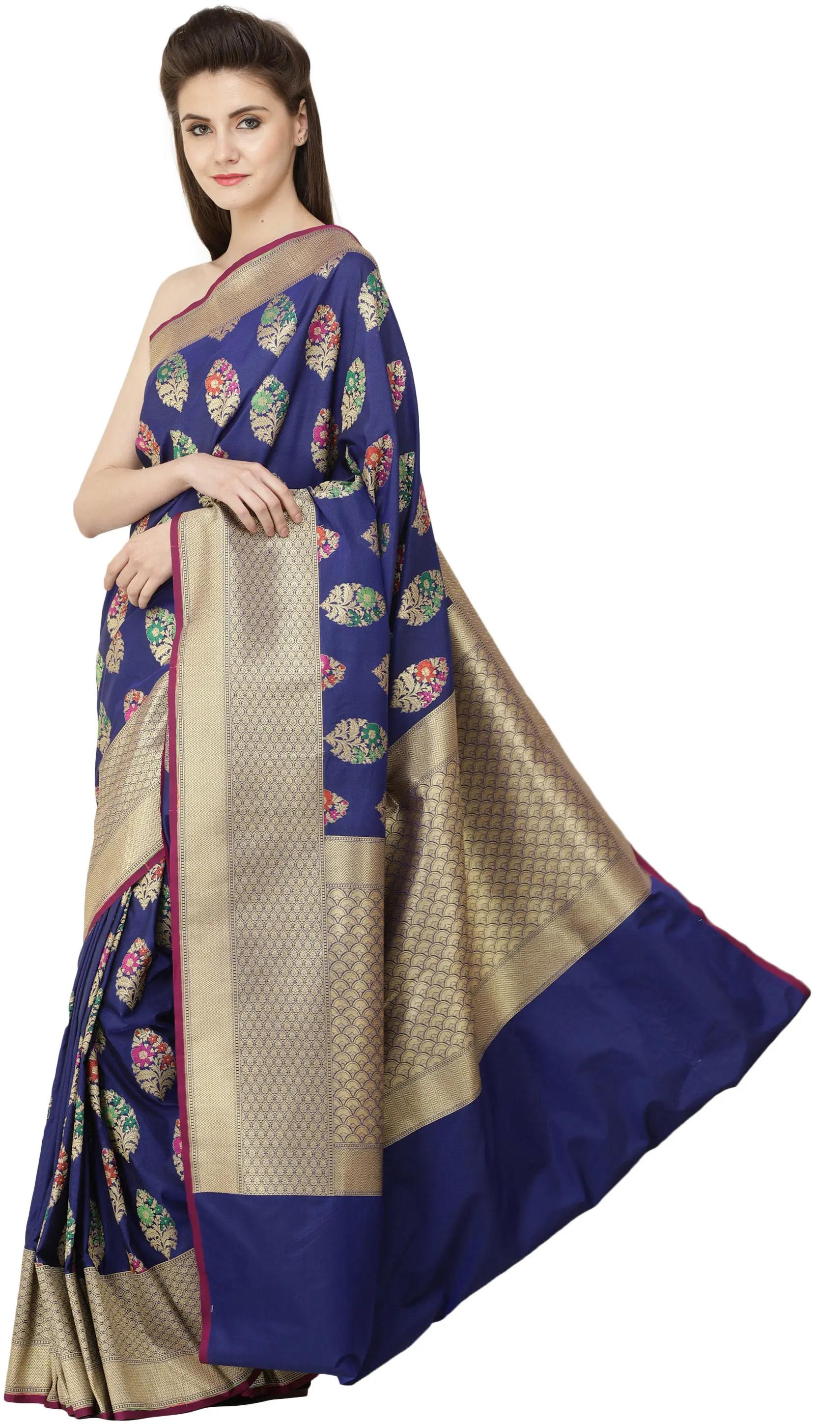 This is one saree that would ensure the eyes of onlookers are glued to you all evening. The border of gorgeous gold zari becomes thicker along the pleats as it nears the endpiece and emerges into the signature endpiece. The superfine embroidery is such as to look against the wide variety of colour variations this ensemble comes in. What sets this saree apart from the rest of the Bangalore brocades in our collection are the complex booties across the field - a closed-in gathering of gold foliage featuring a bunch of pastel-coloured petals in each booti. Paired carefully with the jewellery, this saree would turn you into the life of the party.