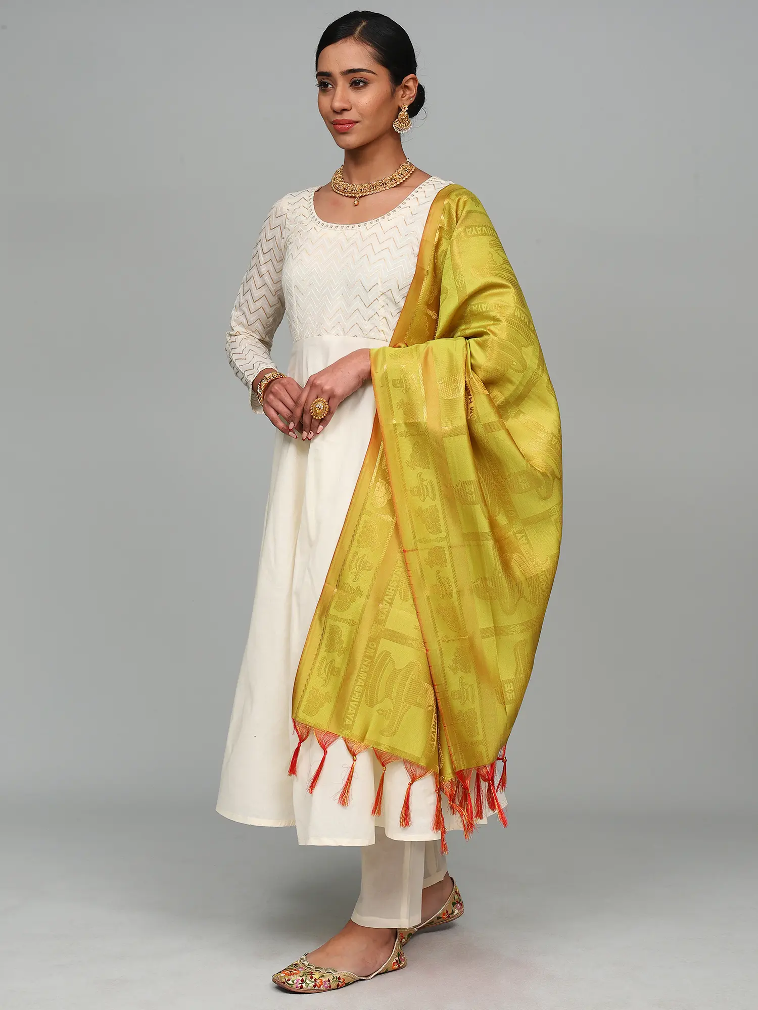 Green Banarasi Fabric Border with Woven Parrots in Golden Thread